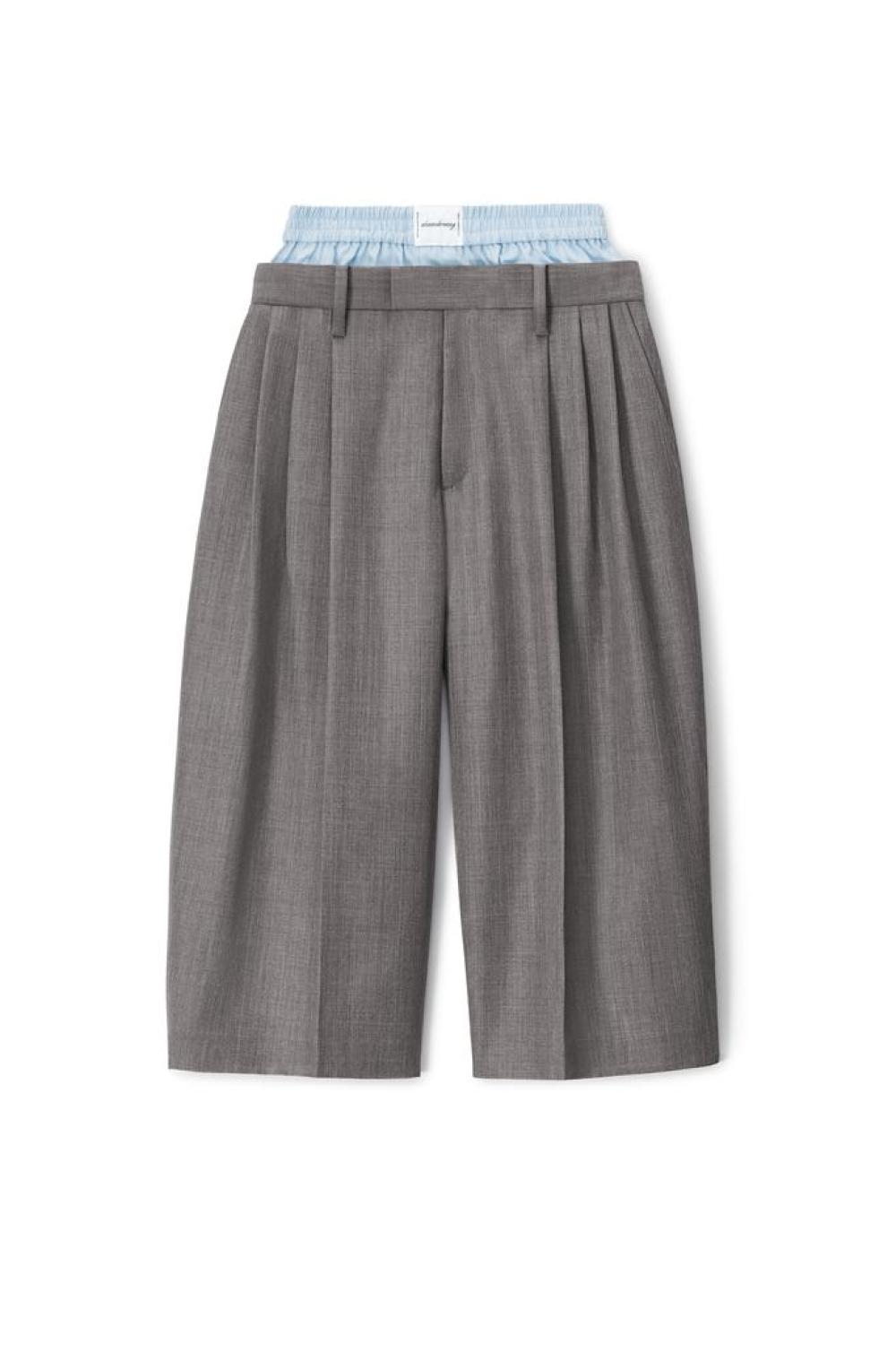 tailored culotte pant with exposed high rise boxer in grey wool blend baggy fit with slightly curved leg hem hits at calf hidden zip fly closure composition: 51% polyester / 49% virgin wool boxer combo: 100% cotton lining: 100% viscose made in china model is 5' 11" and wears a size s 1WC3234622020