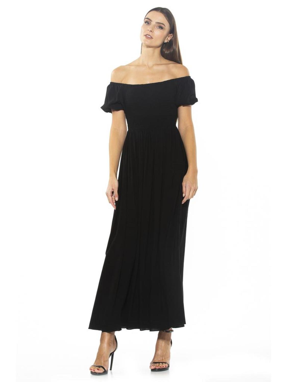PRODUCT FEATURES Off the shoulder Bubble short sleeves Smocked bodice Maxi skirt 97% Rayon, 3% Spandex Machine wash, line dry Imported Style D3886
