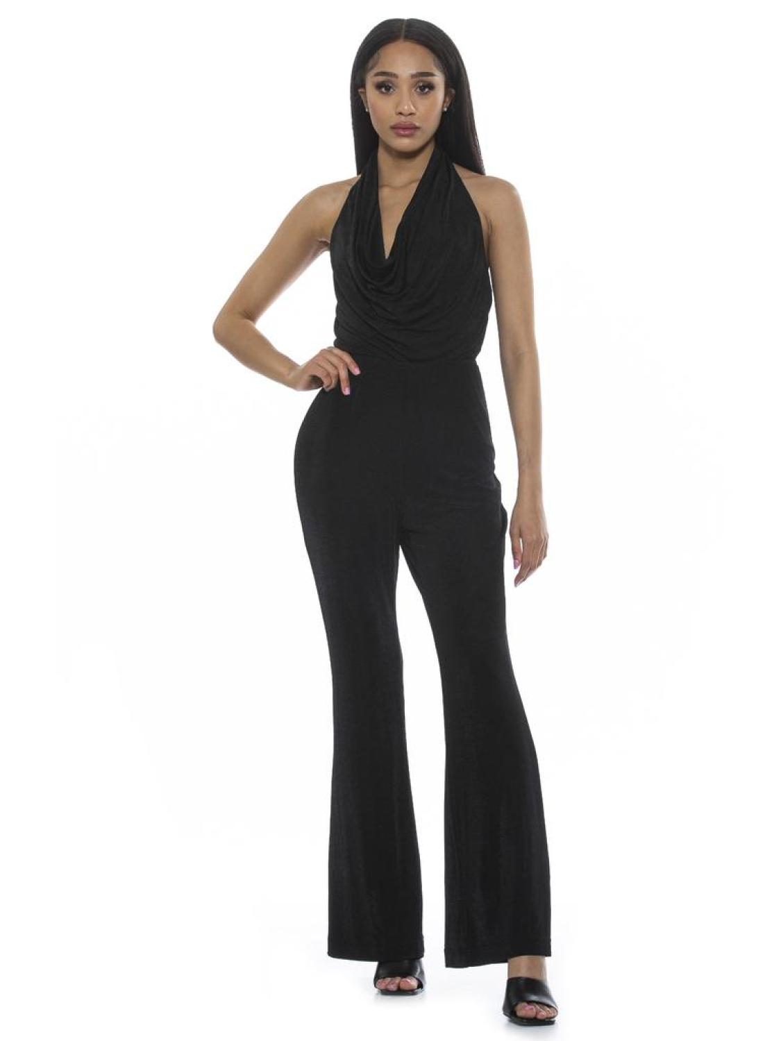Don't flirt with me. The Leilani is a backless jumpsuit, full-length bottoms with a slight bootcut and a cowl-halter neckline.?�PRODUCT FEATURES Halter and Cowl neck?� Elastic Waist Backless?� Slight flare leg Jumpsuit 97% Polyester, 3% Spandex Lining - 100% Polyester Machine Wash Imported Style D3847