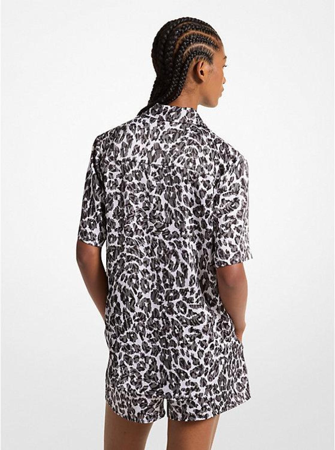 In a silky leopard and logo printed satin, this camp shirt is an easy pick for insouciant style. With a rich array of styling options, it looks just as chic buttoned up as it does worn over a bra top. • Shirt • Satin • 100% polyester • Button fastening • Machine wash • Imported • Model is 5'9"/175 cm wearing size XS • Shirt • Satin • 100% polyester • Button fastening • Machine wash • Imported • Model is 5'9"/175 cm wearing size XS
