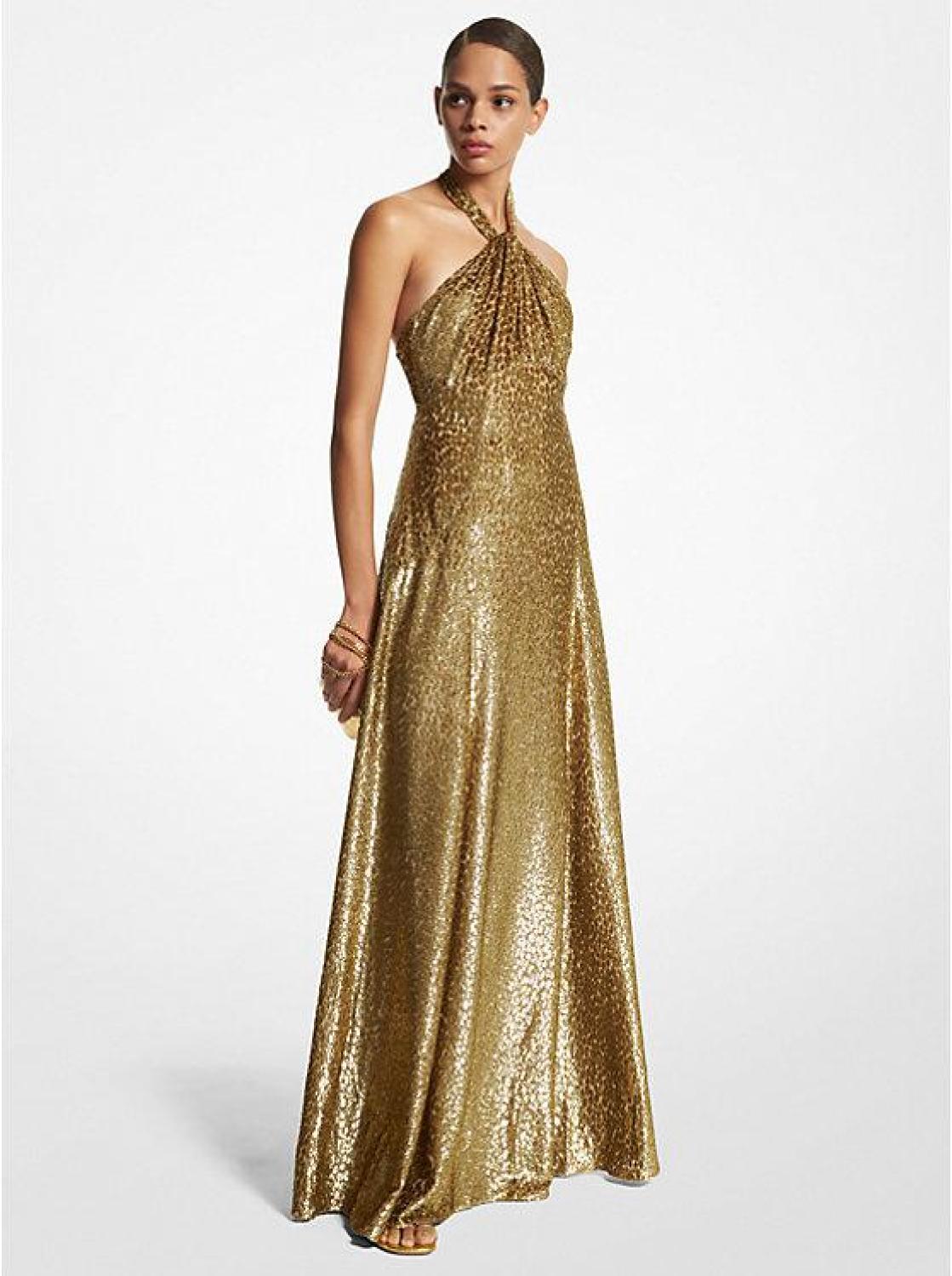 Make a statement in this dazzling halter gown. Crafted from a mid-weight fil coupé, it features a striking leopard pattern woven with metallic threads that catch the light. Lean into the color scheme by completing the look with gold accessories. Gown Metallic fil coupé 64% polyester/36% silk Lining: 100% silk Zip fastening Dry clean Made in Italy Model is 5’11”/180 cm wearing US size 2 Gown Metallic fil coupé 64% polyester/36% silk Lining: 100% silk Zip fastening Dry clean Made in Italy Model is 5’11”/180 cm wearing US size 2
