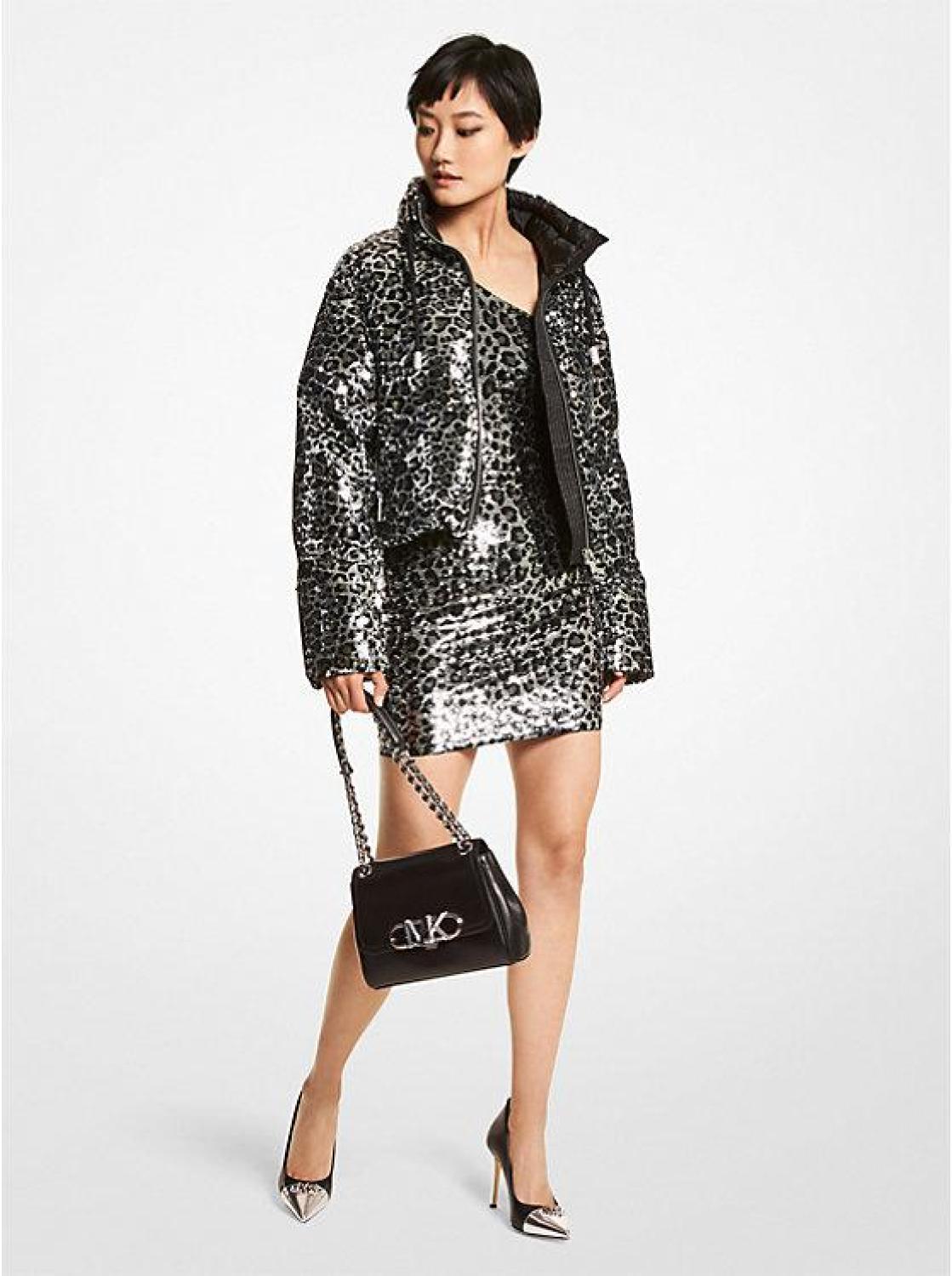 Take the cool-girl approach to bundling up with a sequined jacket that catches the light with every move. This cropped puffer style is cut from recycled satin ciré, while shimmering sequins create a leopard-print motif. Coordinate your jewelry to the metallic sheen. Puffer jacket Ciré Shell: 100% recycled polyester Fill: 80% down/20% feathers Lining: 100% polyester Zip fastening Dry clean Imported Model is 5'11"/180 cm wearing size S Puffer jacket Ciré Shell: 100% recycled polyester Fill: 80% down/20% feathers Lining: 100% polyester Zip fastening Dry clean Imported Model is 5'11"/180 cm wearing size S