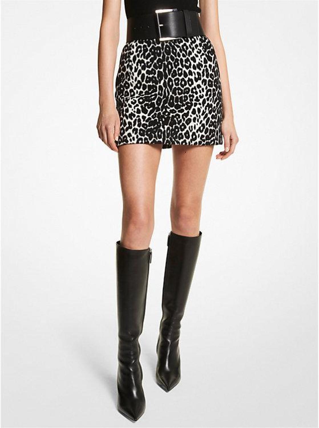 Defined by a leopard motif, this mini skirt has maximum impact. Constructed from sumptuous wool melton, this striking piece showcases Italian craftsmanship with seamless detailing and a tailored silhouette. Emulate the runway look with the matching bolero jacket and a dramatic waistbelt.