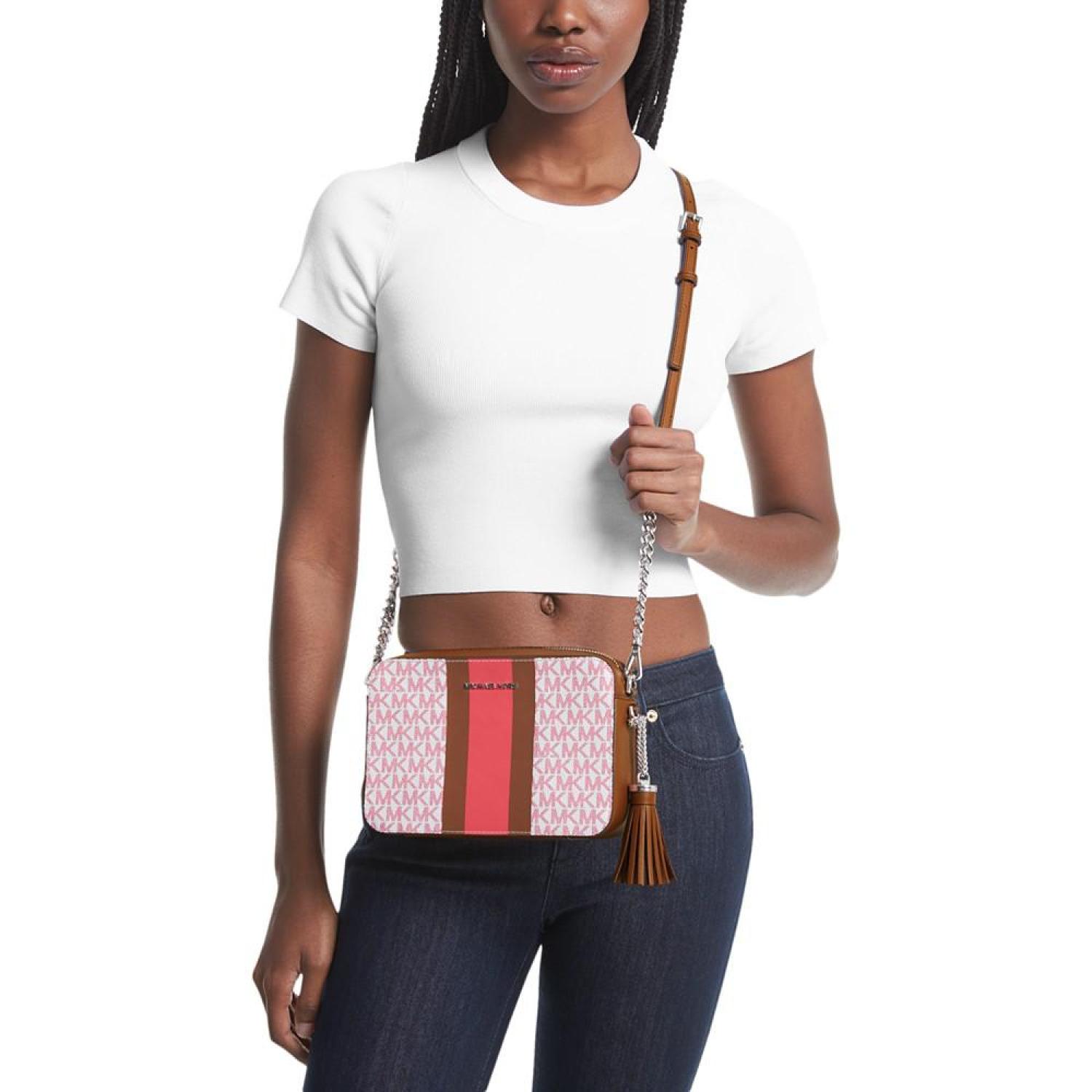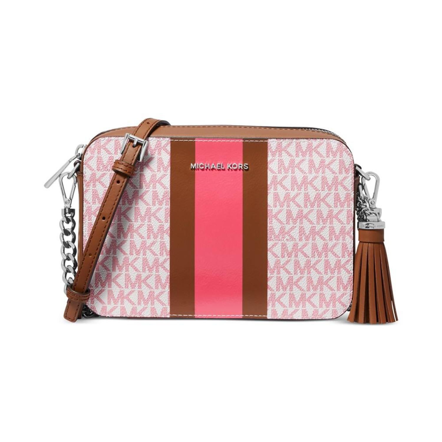 Set out in picture perfect style with the Jet Set Small Monogram Camera Bag by MICHAEL Michael Kors. Small sized bag; 8-1/4"W x 5-1/2"H x 2-1/4"D (width is measured across the bottom of handbag); 1.11 lbs. approx. weight Silhouette is based off 5'9" model 21-1/2"L adjustable strap Zippered closure Silver-tone hardware Interior zip & slip pockets Polyvinylchloride, polyester, polyurethane; lining: polyester; trim: leather Spot clean Imported