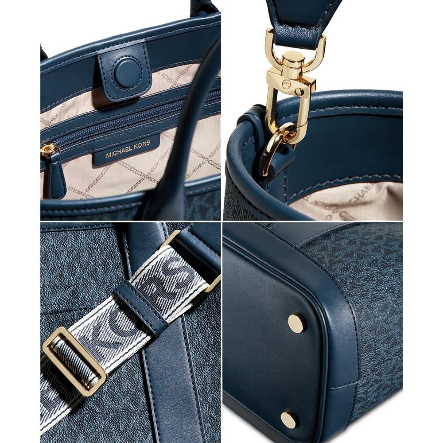 • Classic monogram and a removable webbing strap give this satchel by MICHAEL Michael Kors a perfect everyday sophistication.
