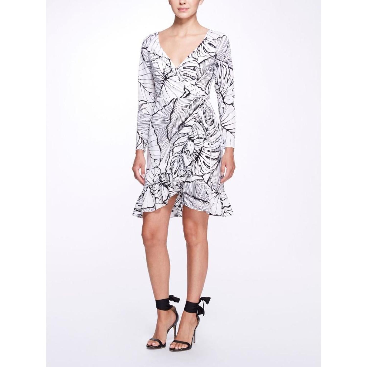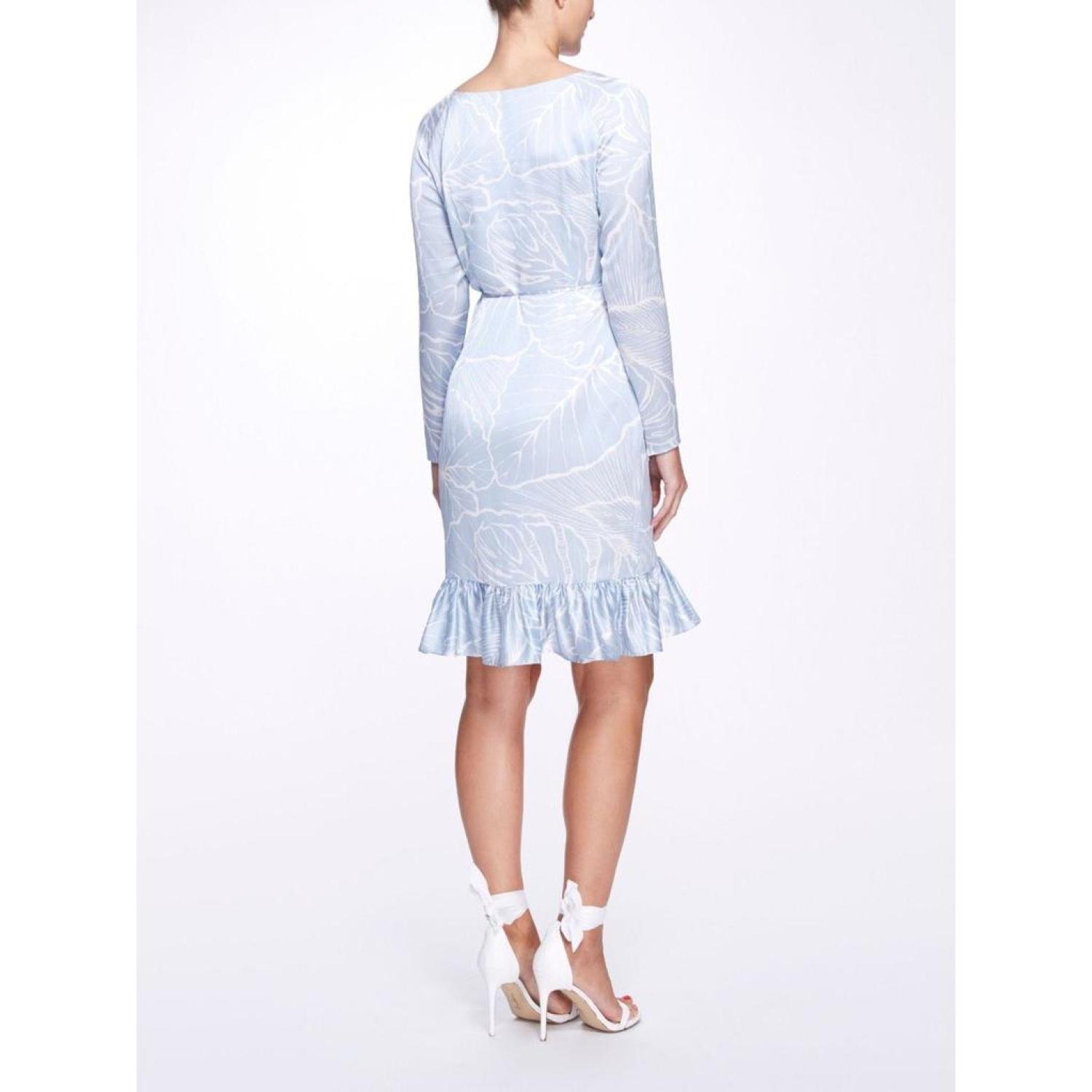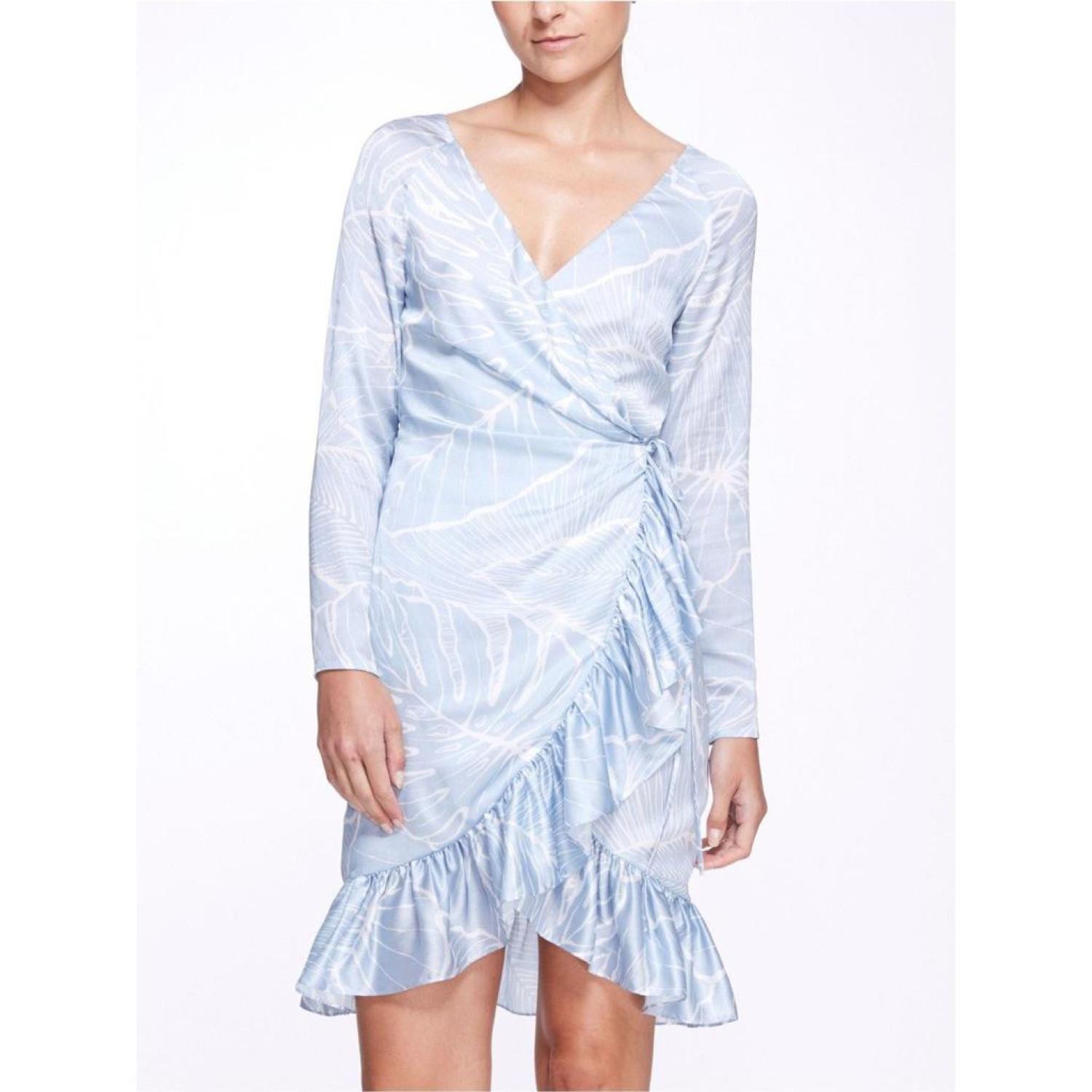 Capture picturesque blooms in the Long Sleeve Wrap Dress. Featuring a dainty ruffle hem and textured charmeuse.