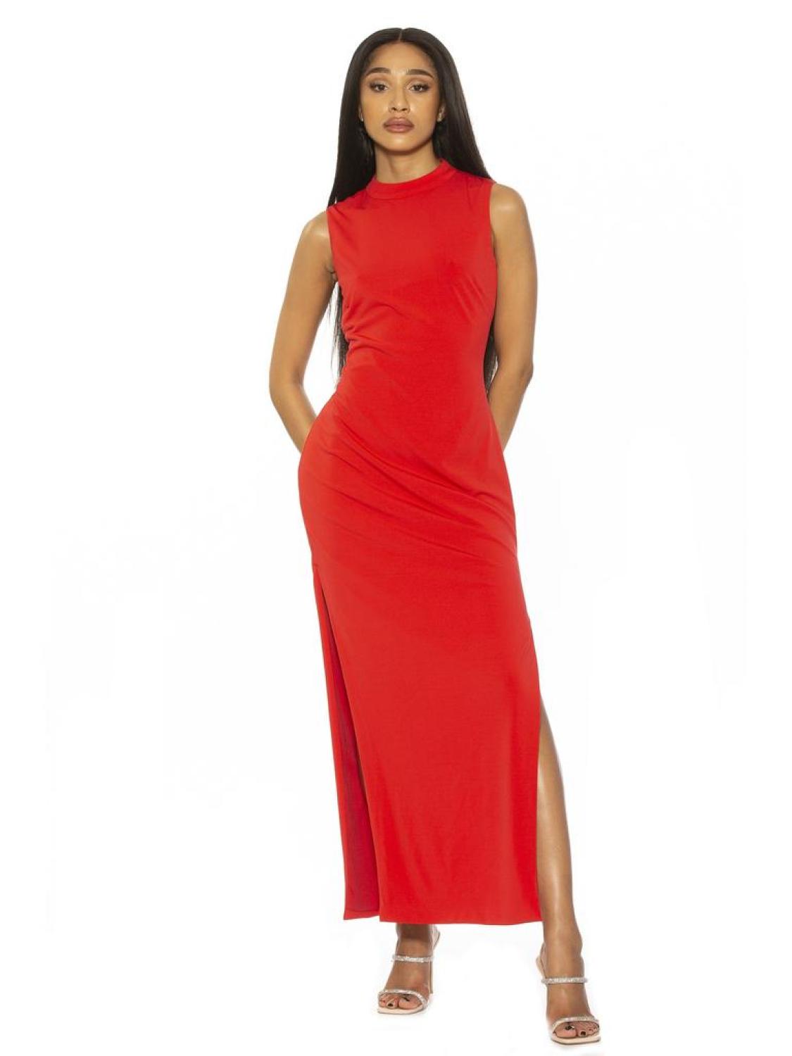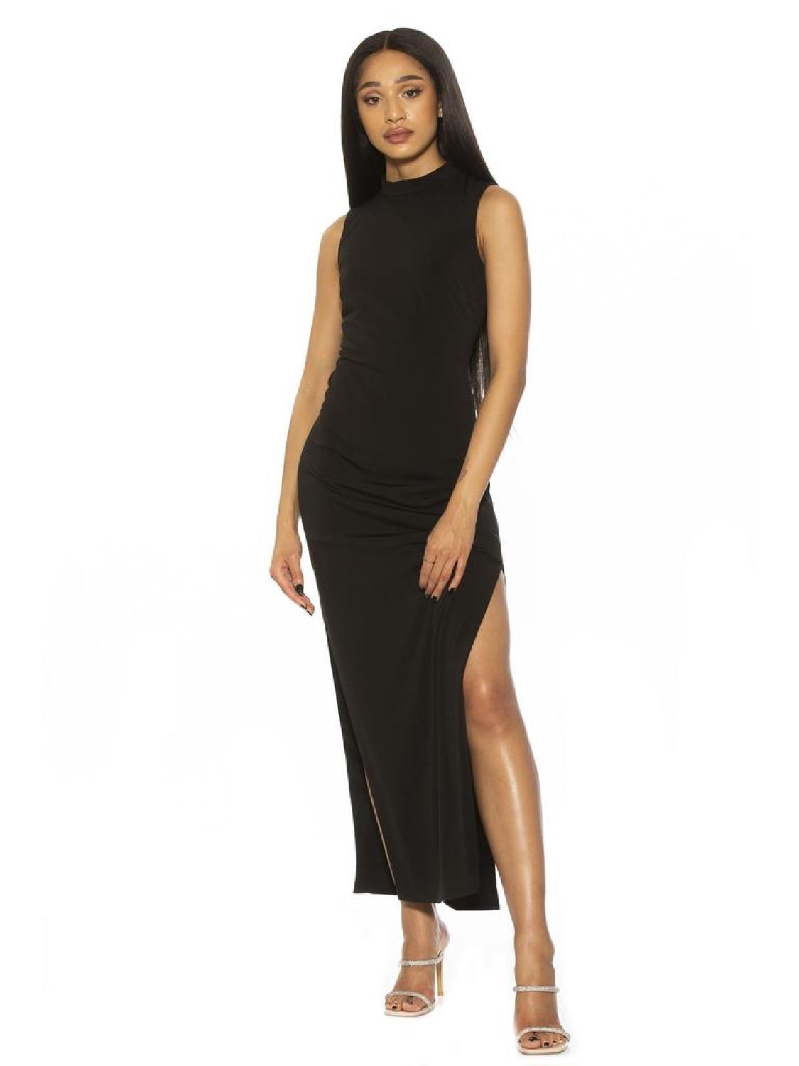 Sleeves are cancelled. The Violet is a sleeveless, maxi dress with a mock neckline, and an open back with a tie detail.PRODUCT FEATURES Mock neck?� Sleevless Back tie?� Back Cutout?� High Leg Slit?� Maxi Dress 95% Polyester, 5% Spandex Lining - 100% Polyester Machine Wash Imported Style D3987