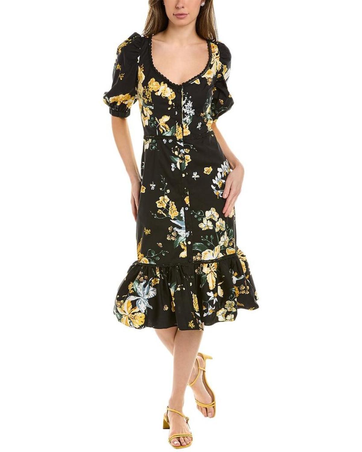 • About The Brand - Gowns And Cocktails For That Special Night. Floral Print Sheath Dress In Black With Elbow-Length Puff Sleeves, Lace Trim, And Ruffle Hem Approximately 42In From Shoulder To Hem Model Is 5'9.5 And Is Wearing A Size 4. Measurements May Vary Slightly By Size. Button Front 100% Cotton Dry Clean Only Imported