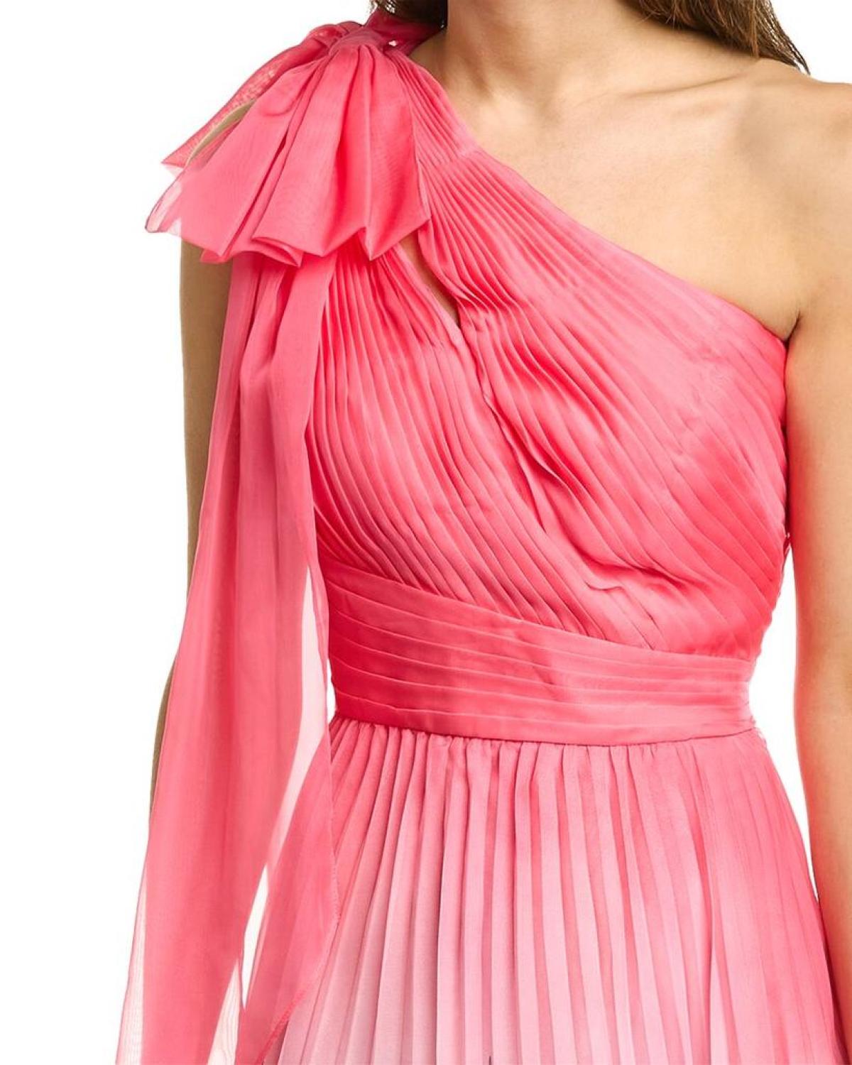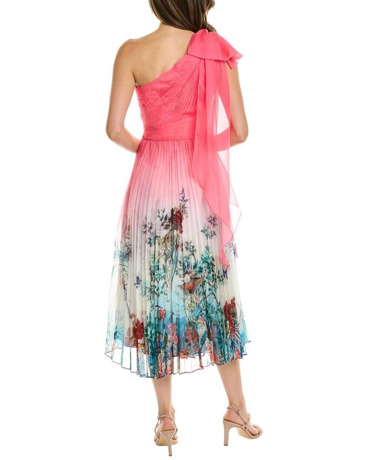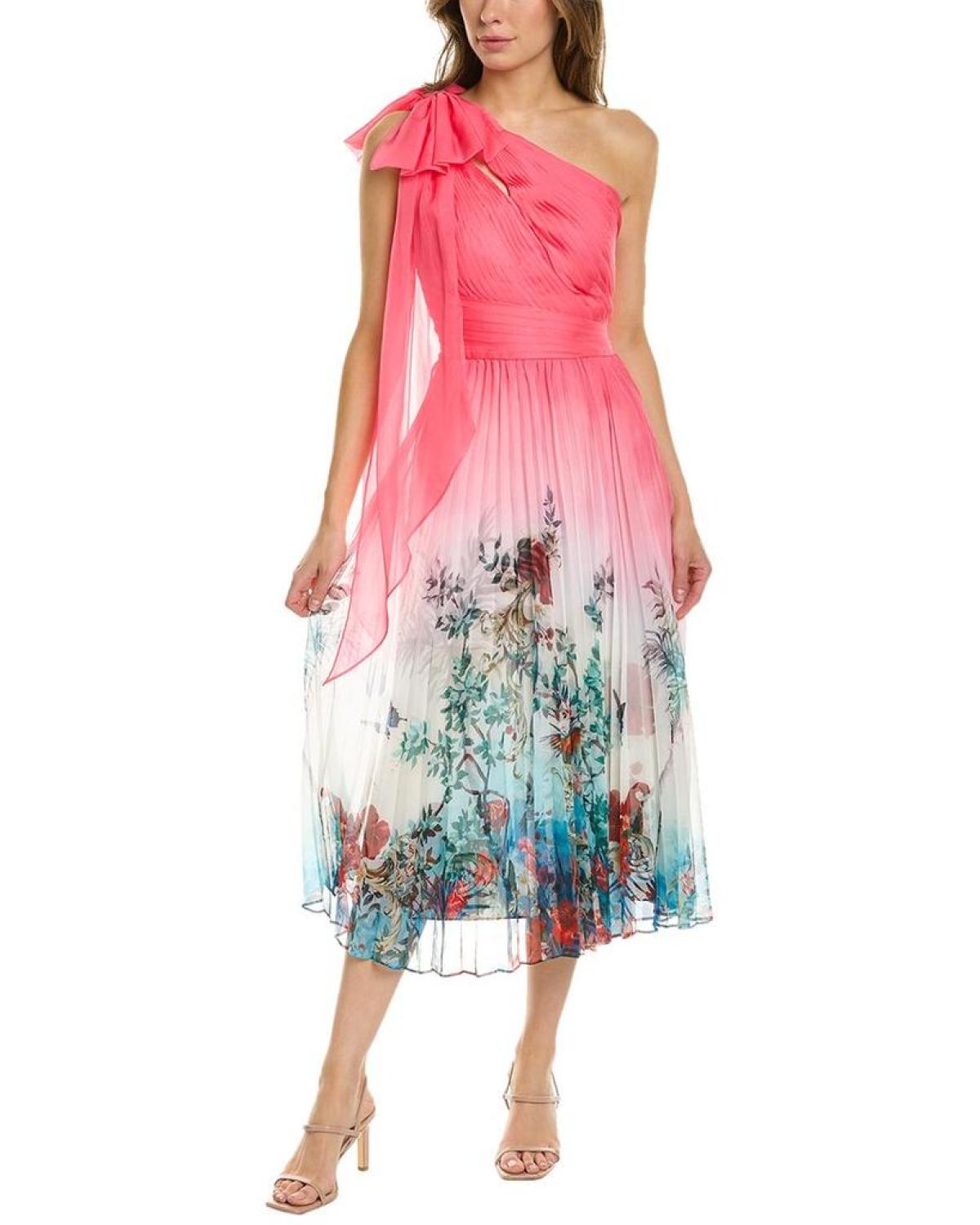 Introducing the Marchesa Notte One-Shoulder Midi Dress, a stunning addition to your wardrobe. Add a touch of elegance and sophistication to any special occasion with this gorgeous dress.Designed by the renowned brand Marchesa Notte, known for their exquisite gowns and cocktails, this dress is the epitome of style. Boasting a beautiful one-shoulder design in a captivating shade of pink, this midi dress is the perfect choice for any woman who wants to make a statement.Featuring a unique cutout and bow detail at the shoulder, this dress adds a playful and feminine touch. The all-over pleated design adds texture and movement, ensuring you'll turn heads wherever you go. With a length of approximately 44 inches from shoulder to hem, this dress offers a flattering silhouette. The model is 5'9.5 and wearing a size 4, but please note that measurements may vary slightly by size.Crafted from 100% polyester, this dress is both luxurious and easy to care for. Simply dry clean only to keep it looking its best. Imported with the utmost attention to detail, this Marchesa Notte dress is perfect for any special occasion. Complete with a side seam zipper for easy wear, this dress combines style and convenience effortlessly.