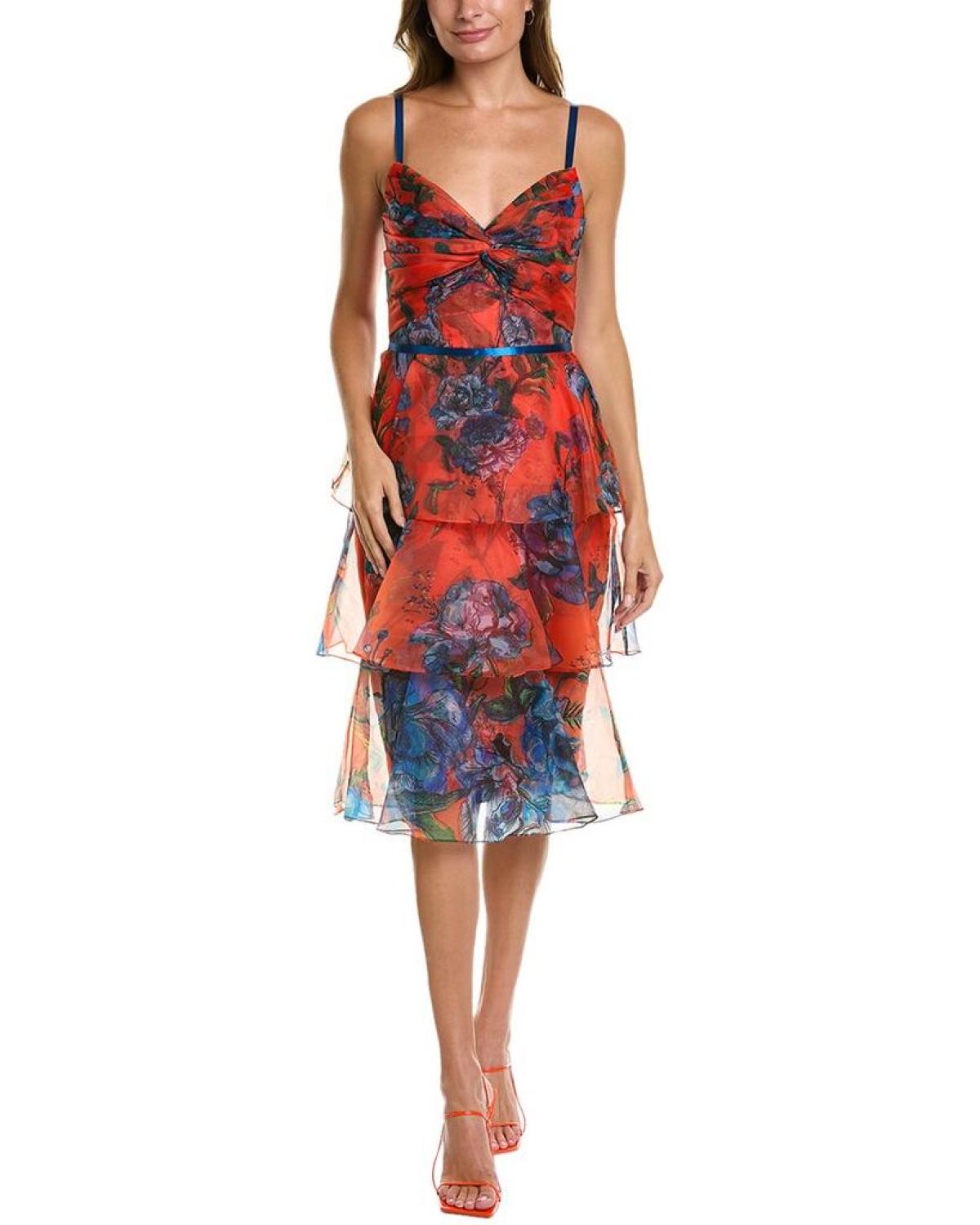 Introducing the Marchesa Notte Organza Midi Dress - A Statement Piece for Every WomanUnveil your inner elegance and charm with the Marchesa Notte Organza Midi Dress. This exquisite dress, brought to you by the renowned brand 'Marchesa Notte,' combines modern sophistication with timeless grace, making it a must-have in every woman's wardrobe.Crafted with meticulous attention to detail, this coral-colored midi dress features a mesmerizing printed organza fabric that adds a touch of whimsical allure to your ensemble. The adjustable shoulder straps ensure a perfect fit, while the pleated bodice with a delicate twisted accent creates a flattering silhouette that accentuates your curves effortlessly.Designed to make a lasting impression, this dress showcases a ribbon belt at the waist, allowing you to cinch it in and define your waistline. The tiered ruffle skirt cascades gracefully, adding an ethereal movement to your steps. With a length of approximately 46 inches from shoulder to hem, this dress strikes the perfect balance between chic and sophisticated, making it suitable for a variety of occasions.Our model, standing tall at 5'11', is wearing a size 6, giving you a reference point for sizing. Please note that measurements may vary slightly by size, ensuring a tailored fit that flatters your unique body shape.Securing the dress is a center back zipper with a convenient hook-and-eye closure, allowing for easy dressing and ensuring a seamless look. Crafted from 100% polyester, this dress demands dry cleaning only to preserve its exquisite quality and design for years to come.Elevate your style and leave a lasting impression with this sensational Marchesa Notte Organza Midi Dress. Imported with precision and care, it embodies the essence of luxury and sophistication. Choose this dress today and experience the opulence of Marchesa Notte.