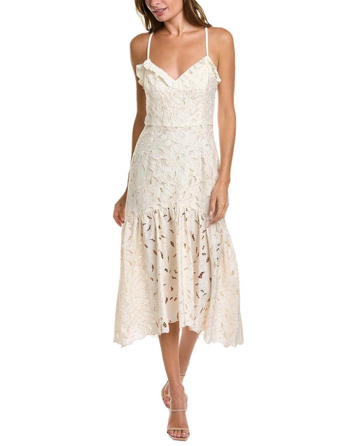 • Introducing the Marchesa Notte Peony Midi Dress, the epitome of elegance and sophistication. From the renowned brand, Marchesa, known for their exquisite gowns and cocktails for that special night, this dress is sure to make a lasting impression.Crafted in a stunning ivory shade, this midi dress features an embroidered lace design that adds a touch of femininity and grace. The halter neck and elasticized shoulder straps offer a flattering silhouette, while the ruffle trim and flounce hem add a playful and romantic touch.Measuring approximately 53 inches from shoulder to hem, this dress is designed to enhance your figure and make you feel like a goddess. The model wearing a size 4 stands at 5'11, but please note that measurements may vary slightly by size.Designed for ease and convenience, this dress features a center back zipper with a hook-and-eye closure, ensuring a secure and perfect fit. Made from 100% polyester, it offers both comfort and durability. To keep it looking its best, simply dry clean only.Imported with love and attention to detail, this Marchesa Notte Peony Midi Dress is a must-have for any special occasion. It effortlessly combines style, elegance, and sophistication, making it the perfect choice for those who appreciate timeless fashion. Add this dress to your wardrobe and prepare to turn heads wherever you go.