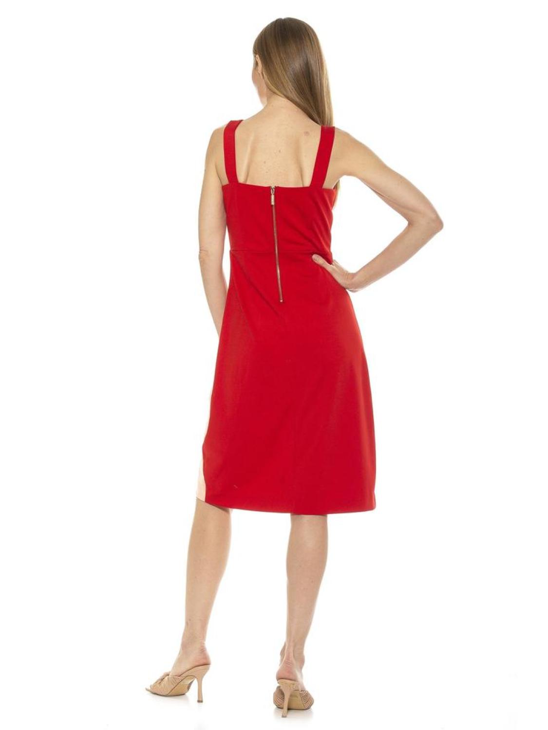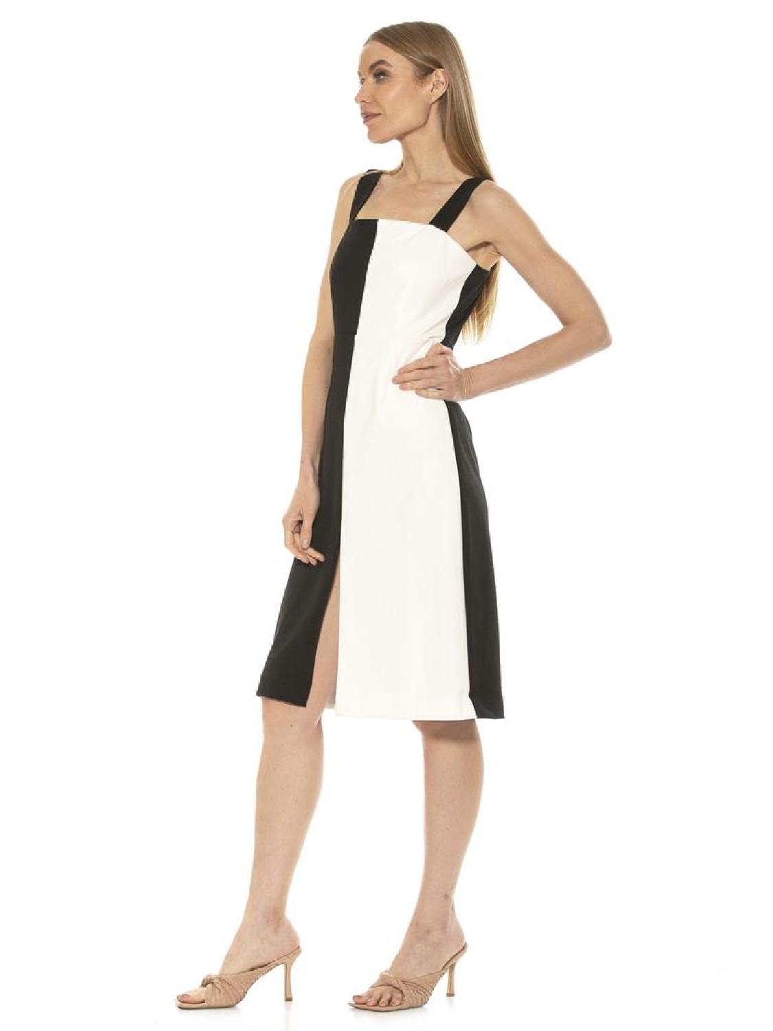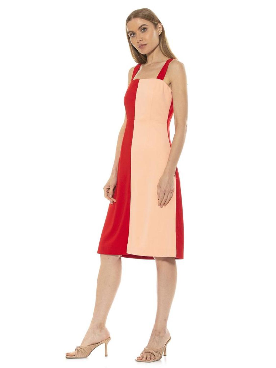 PRODUCT FEATURES 41 5/8" length Dual top straps Square neck Back zip closure Colorblock construction Front slit Midi Dress 95% Polyester, 5% Spandex Lined - 100% Polyester Hand wash Imported Style D3908