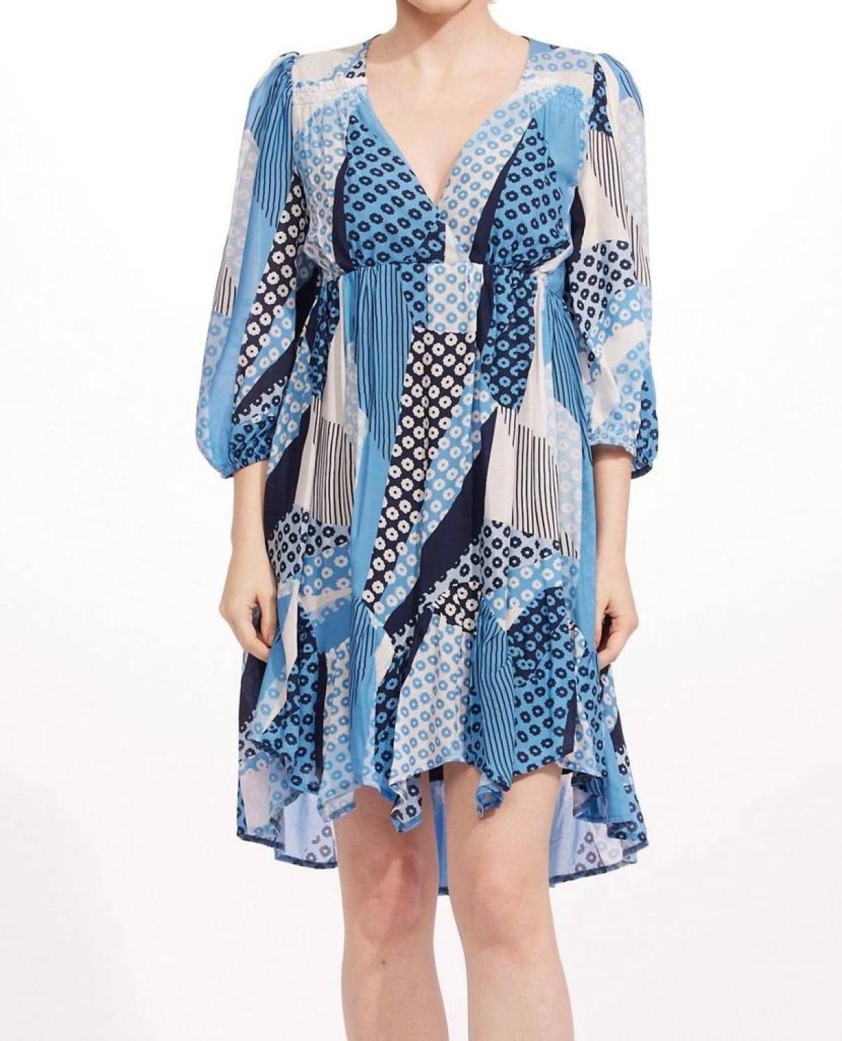 A cool twist on a classic style dress.This Turks and Caicos blue and white geometric printed rayon fabric create this fun and flirty dress. You'll want to twirl as all summer long in this airy and lightweight fabric. Crossover V-Neck Top. Empire Waist. Asymmetrical High-Low Hem. Adjustable Balloon Sleeves that can lengthen to 3/4. Side Zip