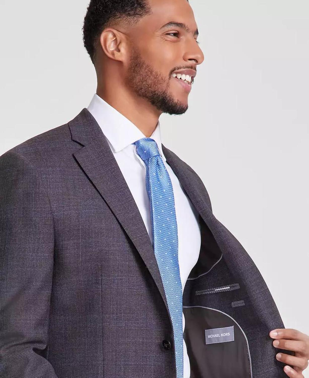 A hint of stretch gives this classic-fit wool-blend suit jacket from Michael Kors the versatility and range of motion you need at your busiest and most active events. Regular fit through the shoulders, chest and waist with standard armholes and sleeves Jacket sizing is indicated by a number and a letter; Number refers to chest size, Letter refers to length of Jacket based upon height: S=5'7" and under; R=5'8"-5'11"; L=6' and up Matching pants sold separately Notched lapel Two-button closure; decorative buttons at cuffs Two front flap pockets; welt pocket at left chest Side vents; natural stretch; fully lined Shell: 70% wool, 30% polyester; lining: 100% polyester Dry clean Imported