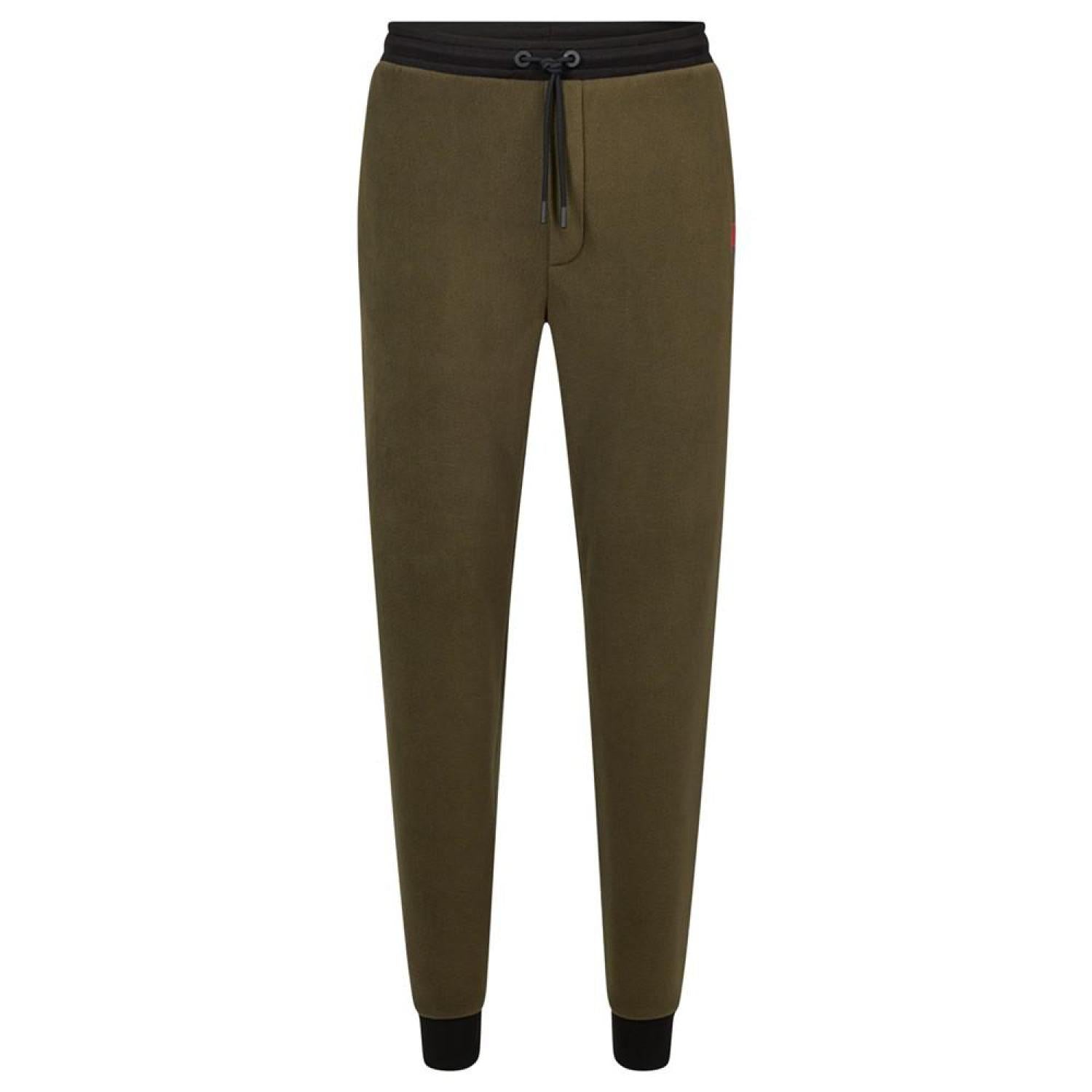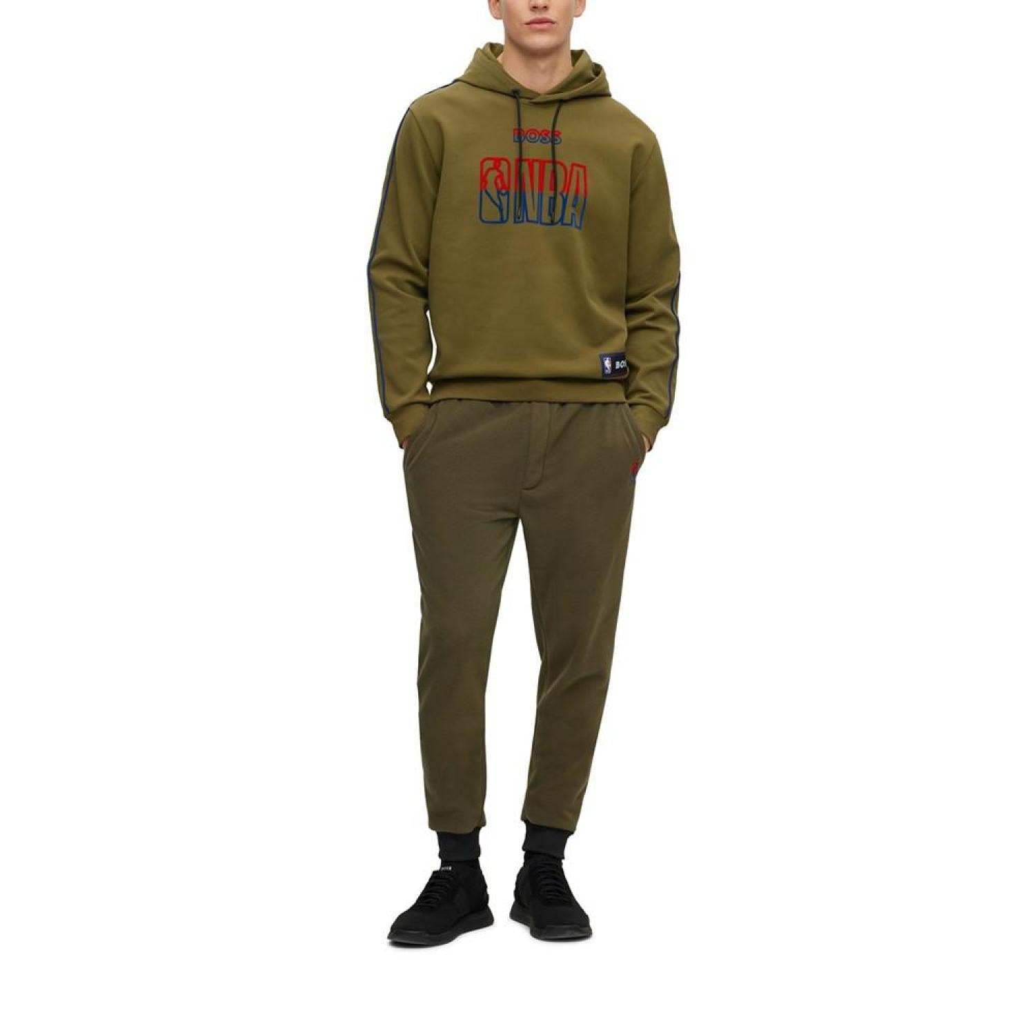 Sporty tracksuit bottoms by BOSS menswear. Featuring contrast trims for a hybrid look, these cuffed tracksuit bottoms are cut to a straight fit in stretch fleece for active comfort. Co-branded dynamic casualwear part of a limited-edition capsule collection in collaboration with the NBA. The model is a size 32R and is 6'2" tall with a, 38" chest, 29" waist and 36" hips Regular fit Pockets bottom front- French pocket Pockets bottom back- back zip pocket Polyester, Elastane Machine Washable Imported