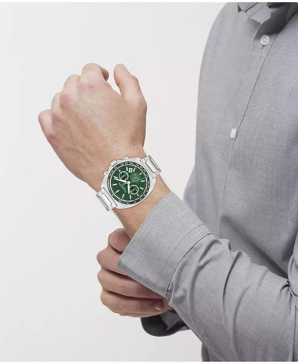 Made for adventures near and far, the Charter is a sporty multi-function style designed for life on the move. Finished with stately stick markers and an olive tachymetric bezel, this stainless-steel chronograph features an olive lacquer dial with a date window and three sub dials marking seconds, minutes and hours. SKU 14602701