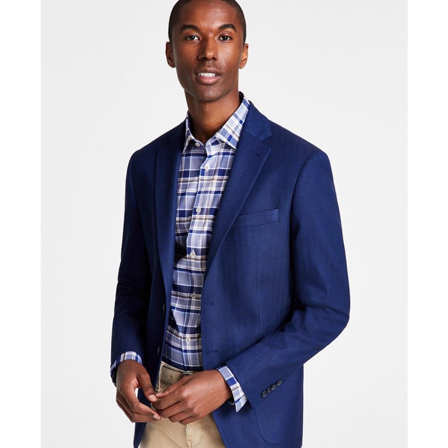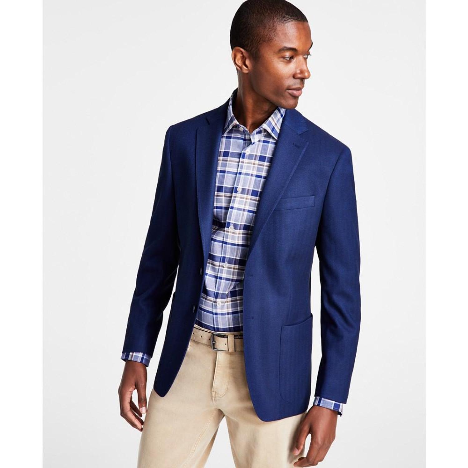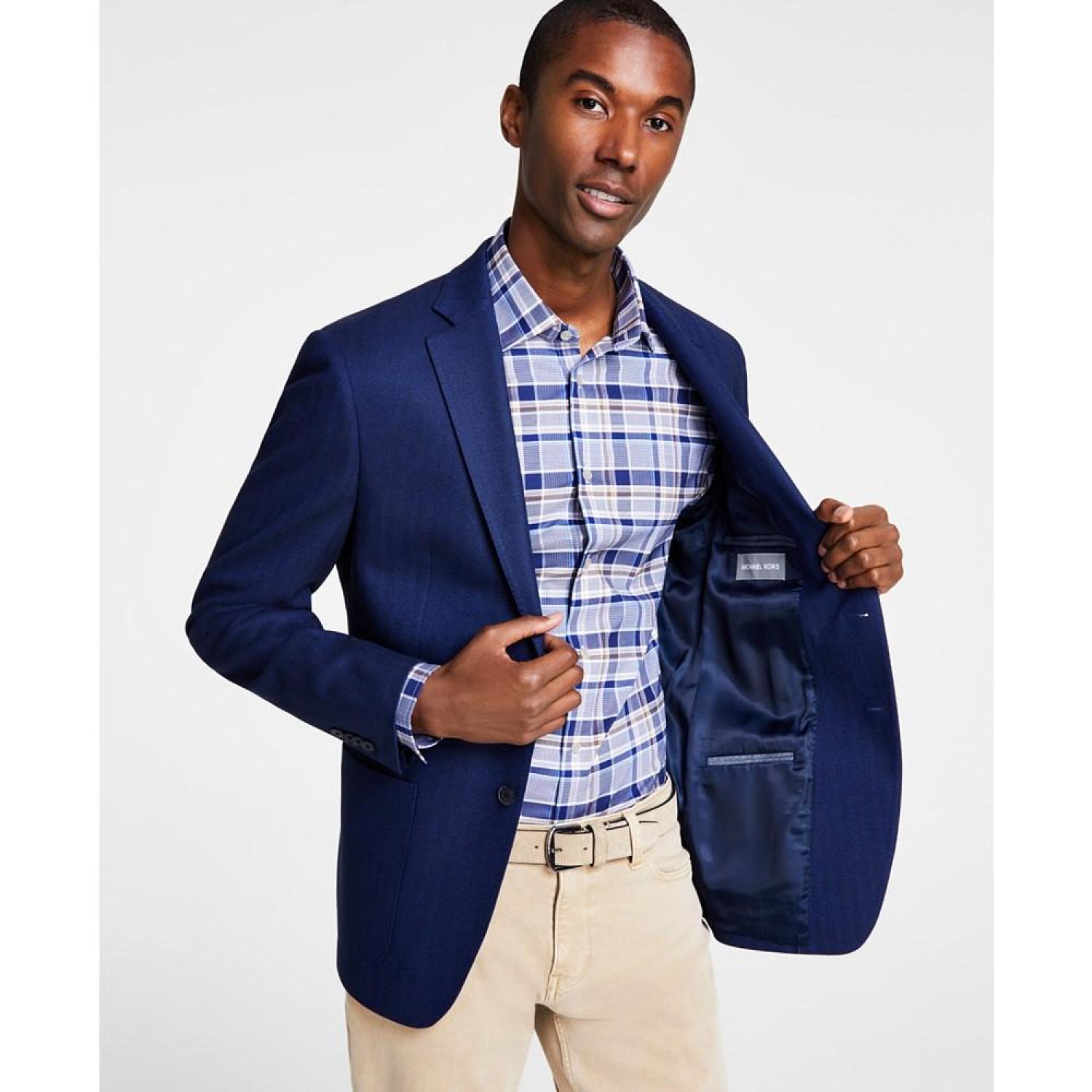 It's never too late to give your professional look a boost of modern style. This herringbone sport coat from Michael Kors will make it easy. Classic fit through the shoulders, chest and waist with standard armholes and sleeves Notch lapel Two-button closure Two front patch pockets; left chest welt pocket Side vents Partially lined Shell: polyester, viscose, spandex; lining: polyester/viscose Dry clean Imported
