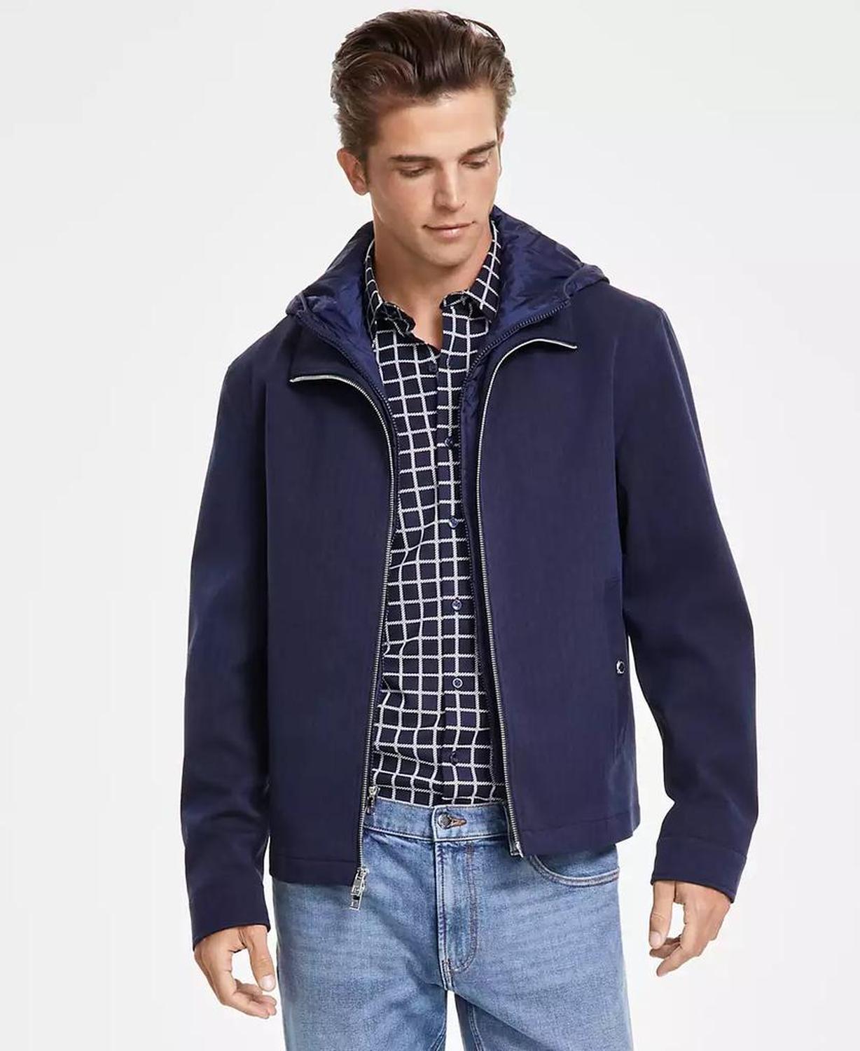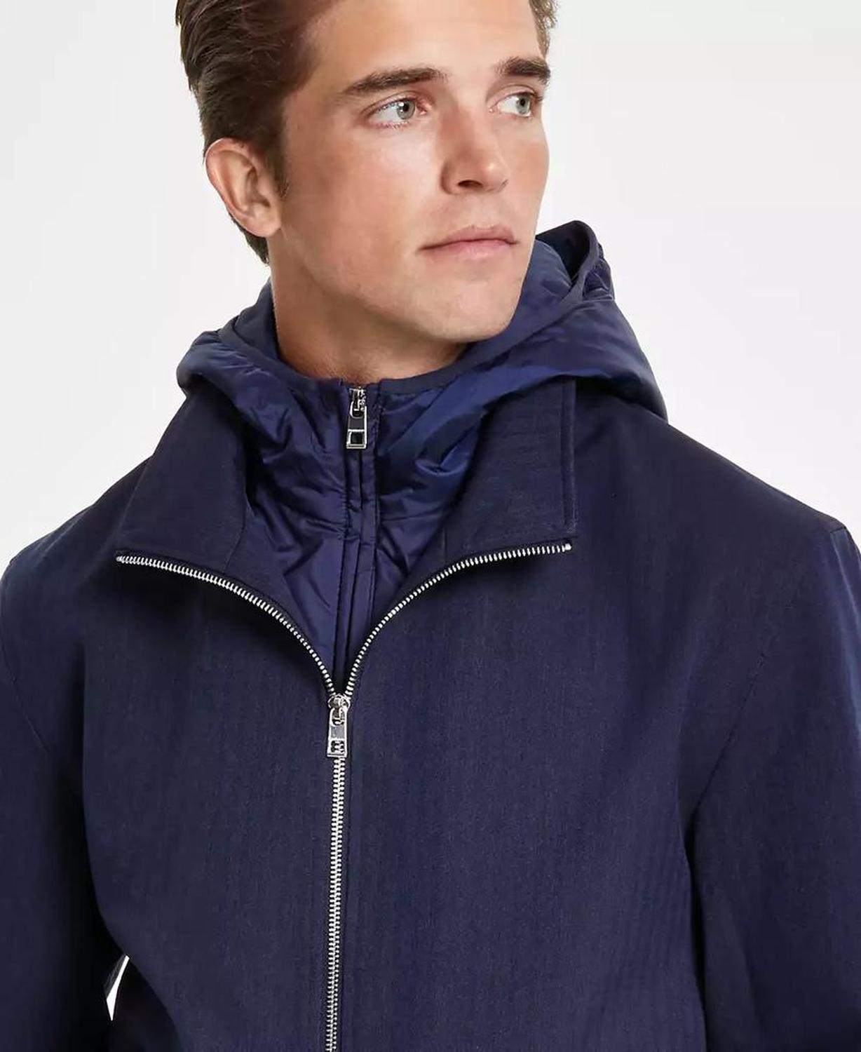 Stay stylish and warm in cold weather with this mixed-media jacket from Michael Kors, featuring a herringbone shell and a removable hooded interior layer.
