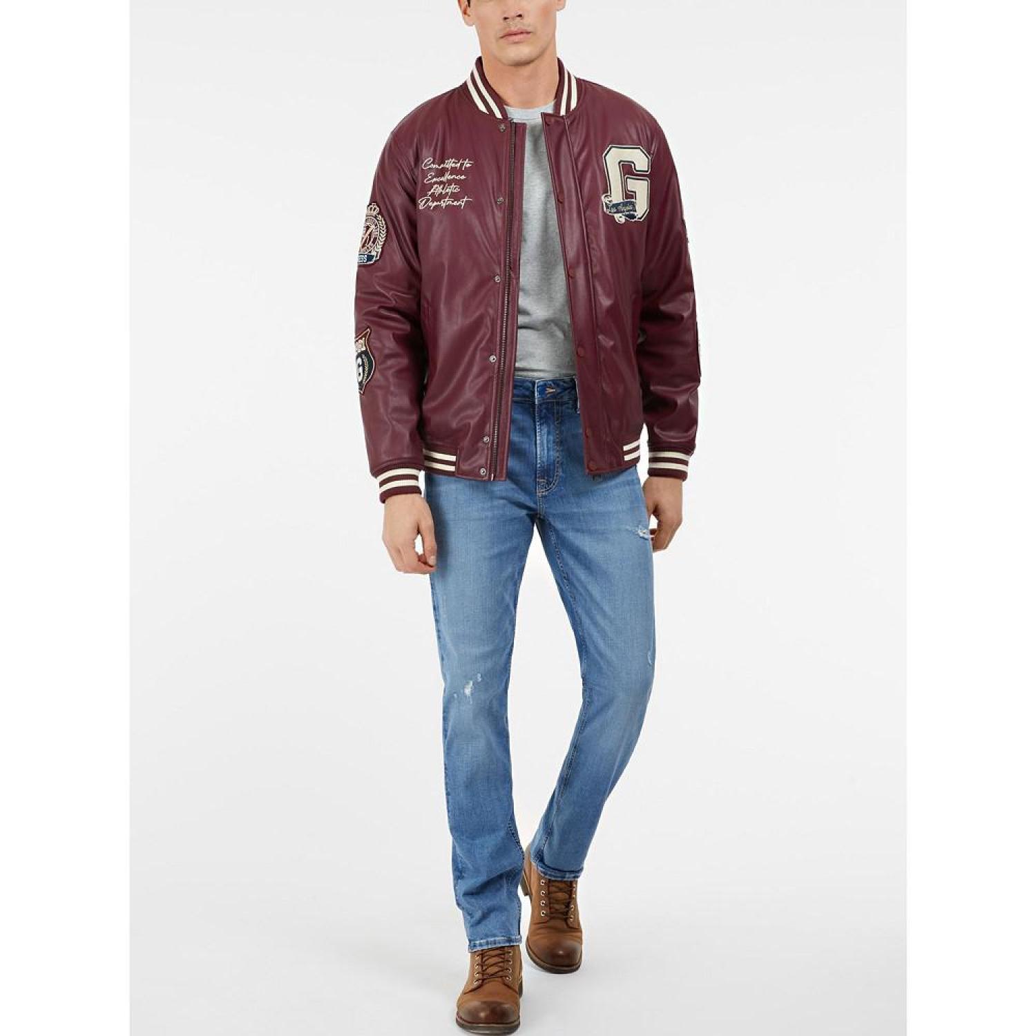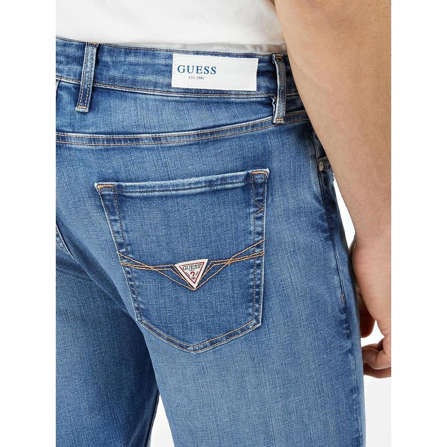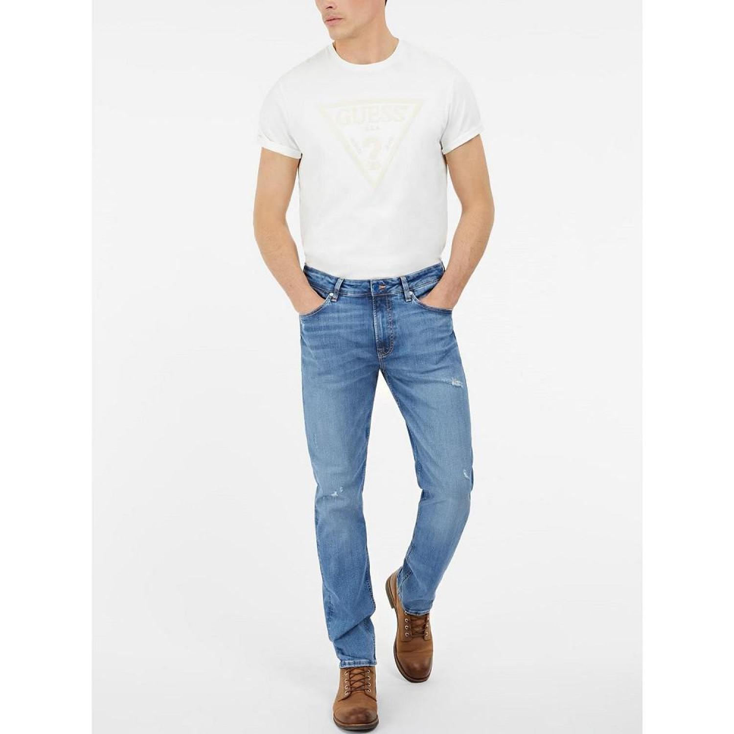 These slim tapered jeans feature whiskering and fading and embroidery on the back pocket. Slim taper Embroidery on back pocket Zipper and button closure Whiskering and fading Polyester, Elastane-Spandex Machine Washable Imported