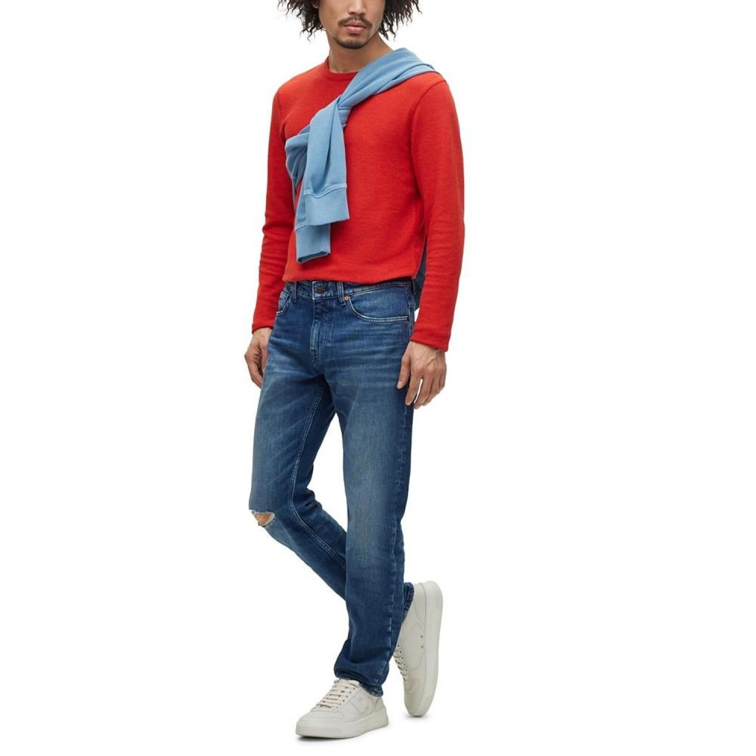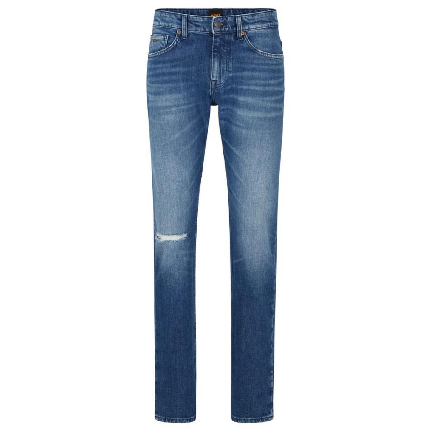 Trend-driven jeans by Hugo Boss Menswear, cut to a slim fit in Italian stretch denim with a blue tone and distressed details. Button and zip closure Pockets bottom front- side pockets Slim leg Pockets bottom back- patch pocket The model is a size 32R and is 6'2" tall with a 38" chest, 29" waist and 36" hips Cotton, Elastane Machine Washable Imported