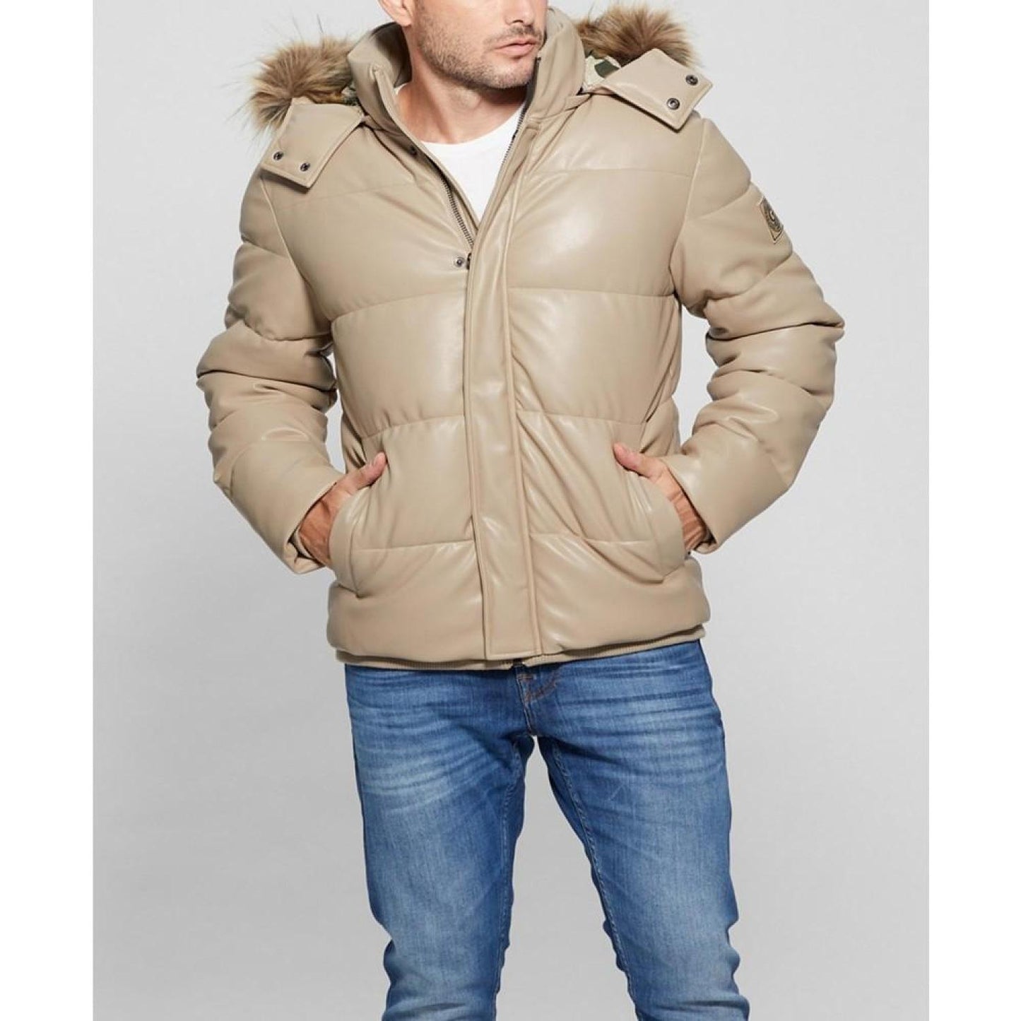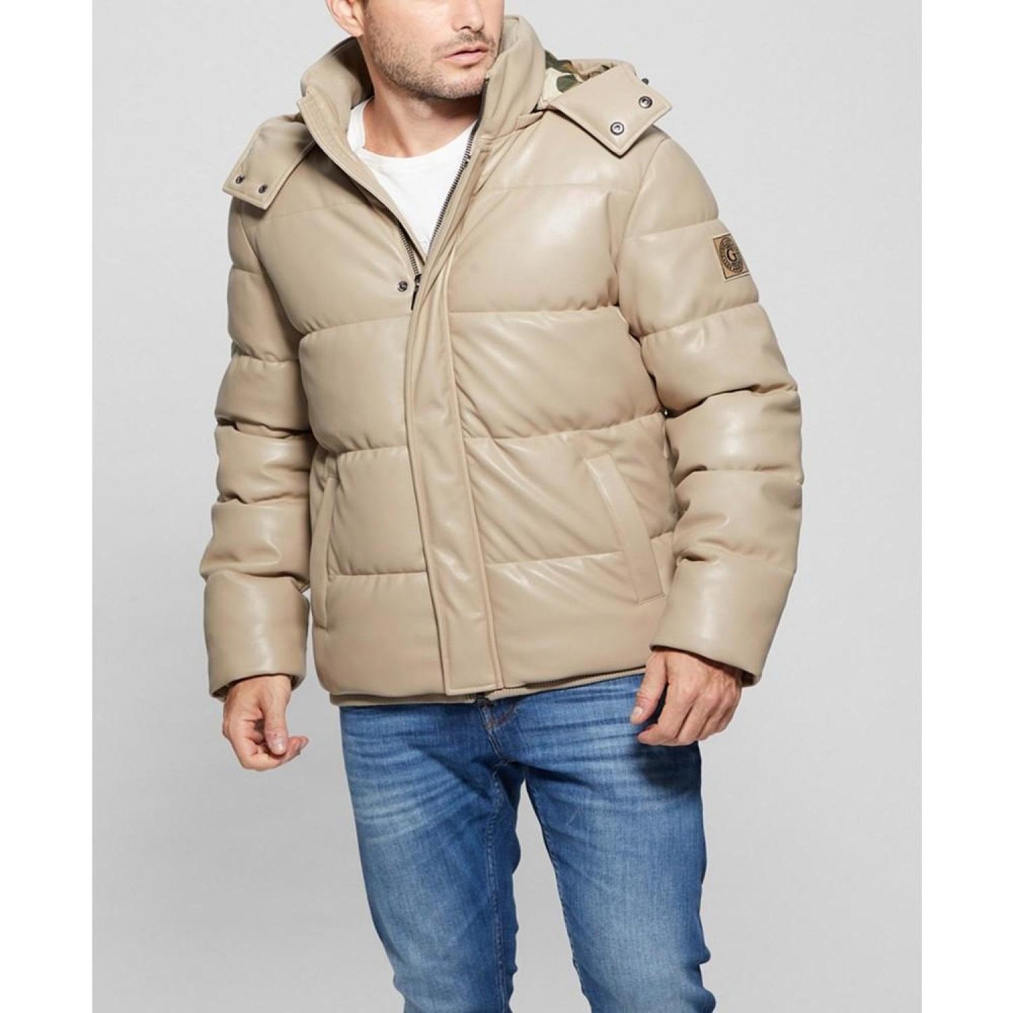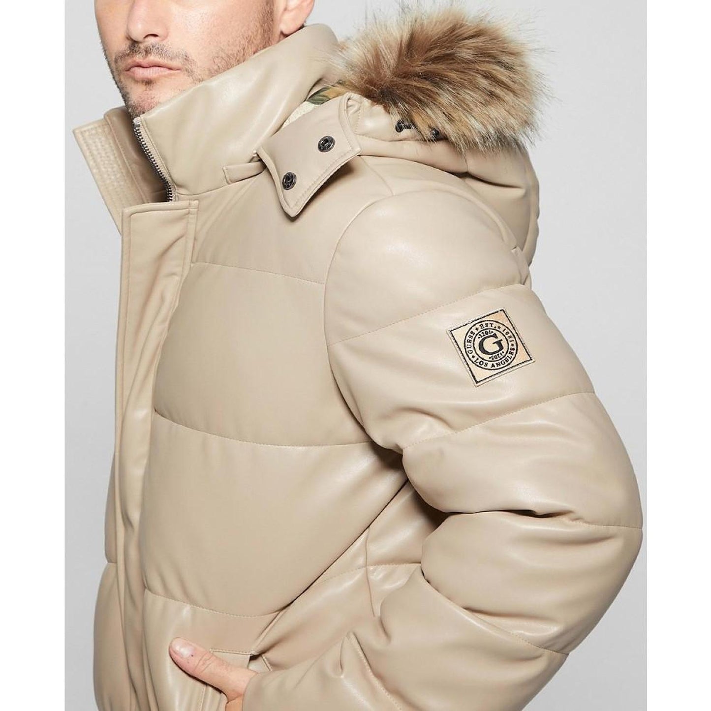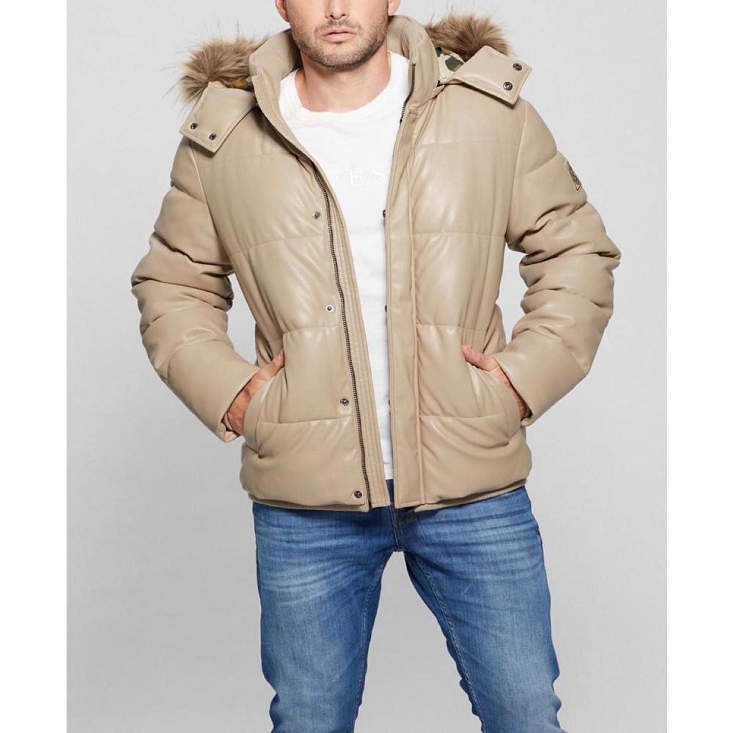 This puffer jacket features a removable hood, faux leather, plush accents and a zip-up closure. Faux leather Removable hood and plush accents Zip-up and snap closure GUESS logo patch on the sleeve 100% Polyurethane Machine Wash Imported