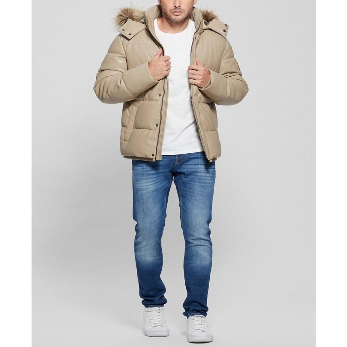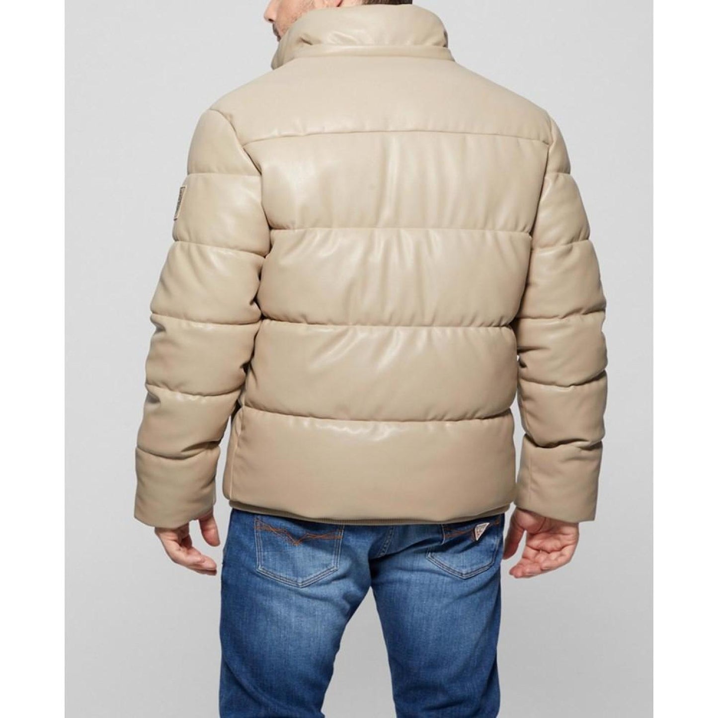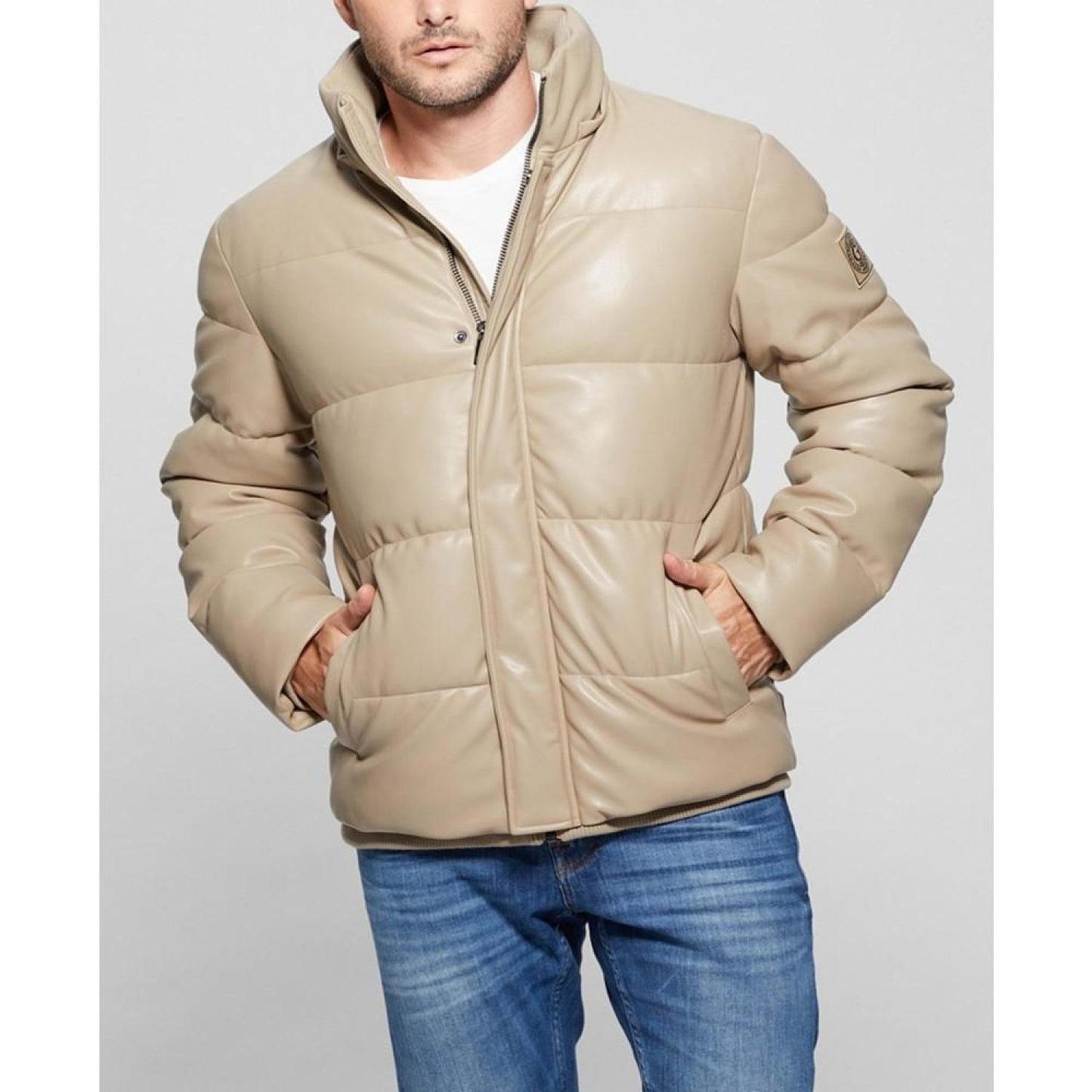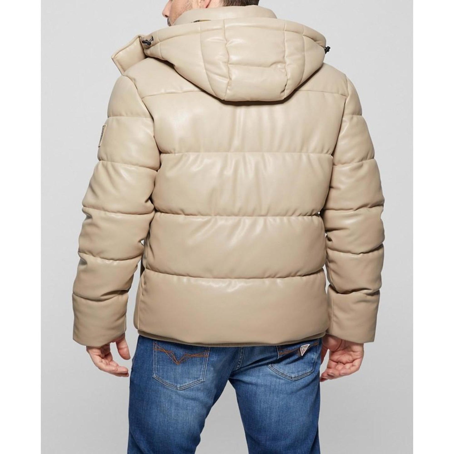 This puffer jacket features a removable hood, faux leather, plush accents and a zip-up closure. Faux leather Removable hood and plush accents Zip-up and snap closure GUESS logo patch on the sleeve 100% Polyurethane Machine Wash Imported