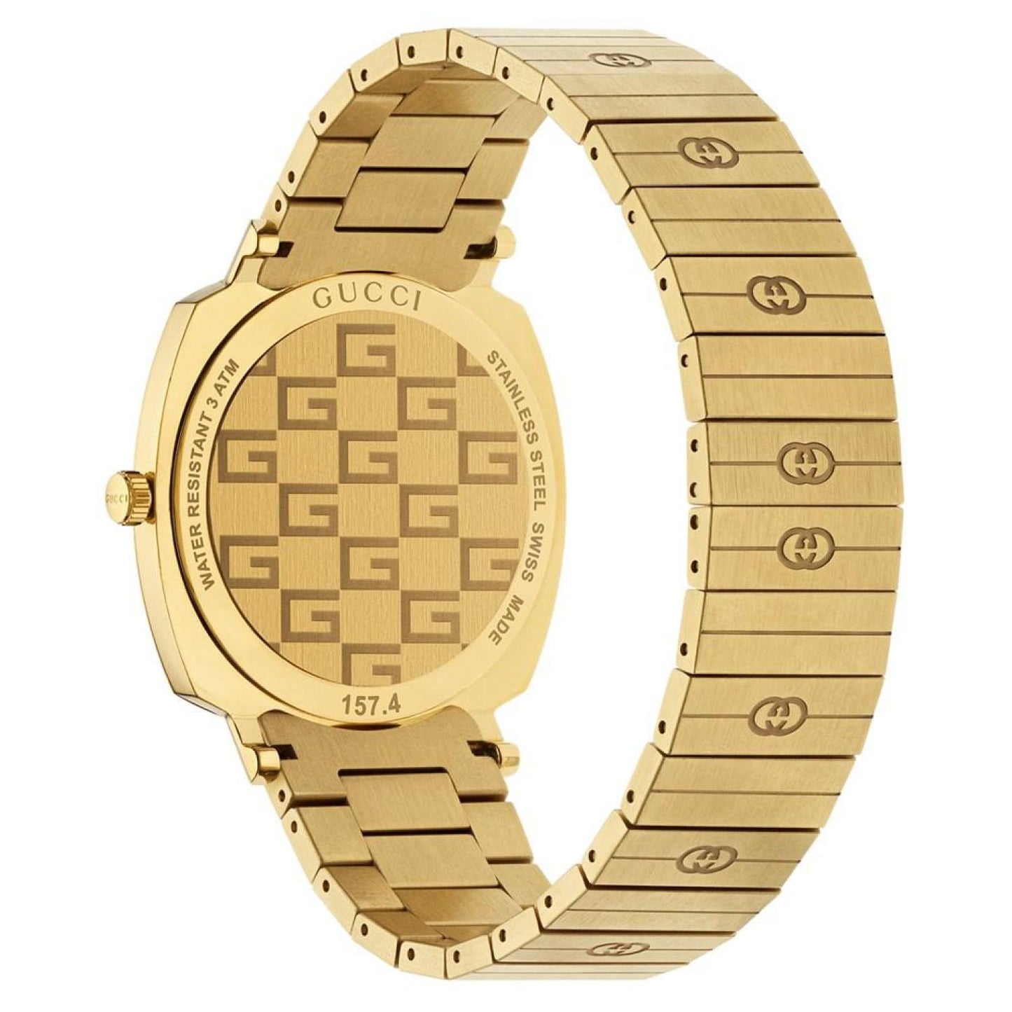 An ingenious dial design is wrapped in a logo-engraved pattern for Gucci's glam gold-tone stainless steel bracelet watch from the Grip collection. Style #YA157409 Movement: quartz Case: cushion-shaped; 38mm Strap: gold-tone PVD stainless steel bracelet Closure: ardillon buckle Dial: gold-tone with engraved logo motif Water resistance: to 30 meters Physical Vapor Deposition (PVD) is a coating process used to promote density and help protect from everyday wear and tear. Warranty: 2-year limited Photo may have been enlarged and/or enhanced. Sign up for Macy's WorryNoMore® Jewelry & Watch Protection program within 30 days of your purchase. Call Customer Service at: 1-800-BUY-MACY (1-800-289-6229), use Macy's Chat function or visit any Macy's store with your dated online receipt.
