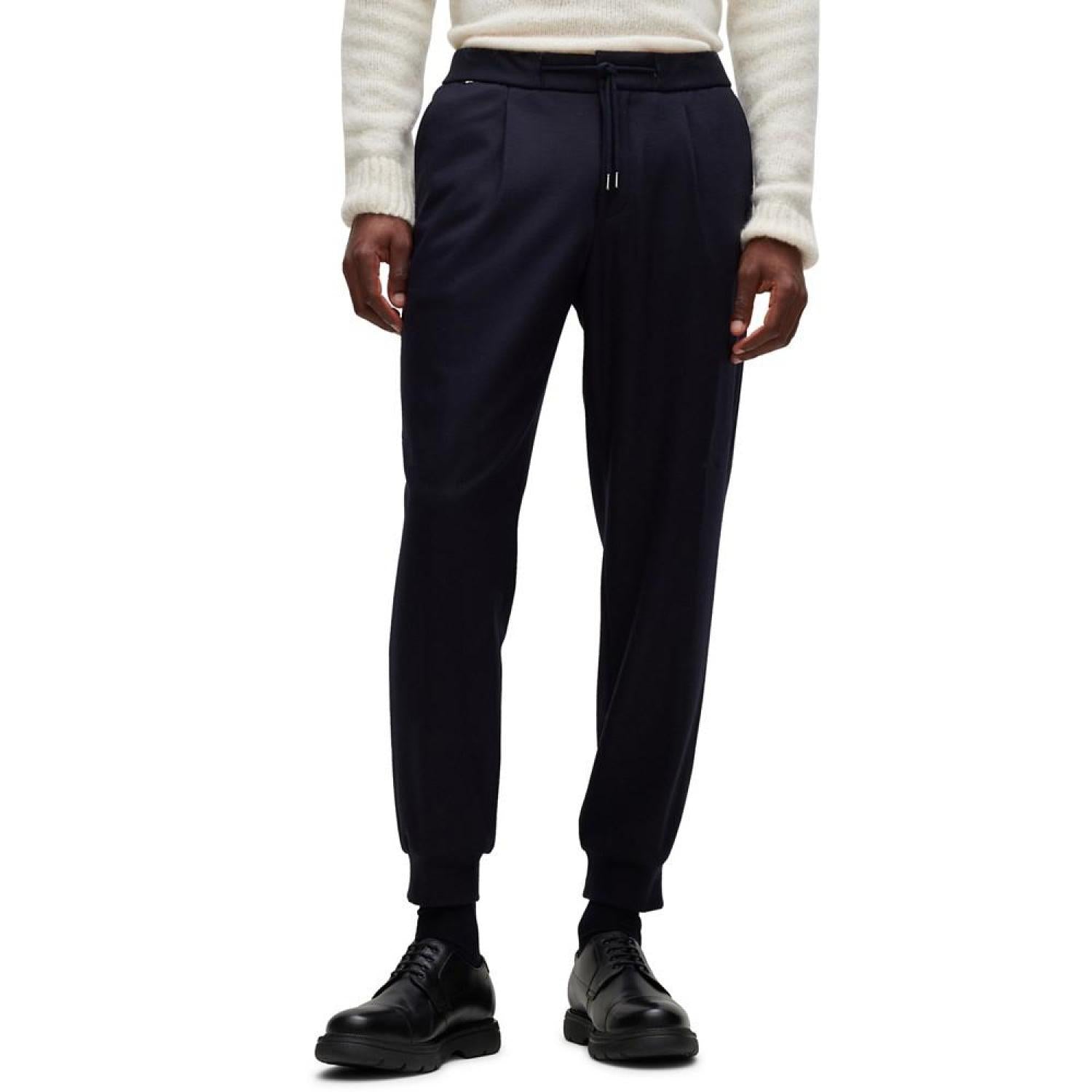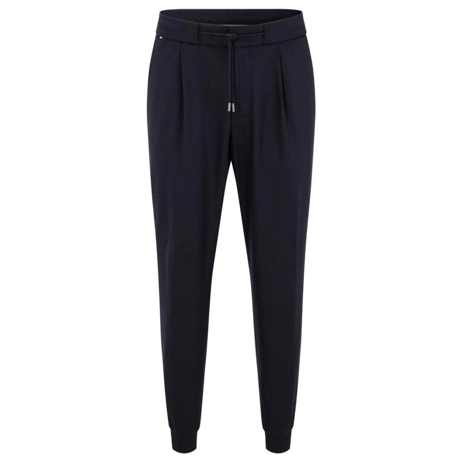 Versatile trousers by BOSS menswear. Crafted in a wool blend containing stretch for easy movement, these trousers are cut to a tapered fit with a drawstring waist and pleat front. The front waistband and rear pocket are trimmed with a signature-stripe accent.