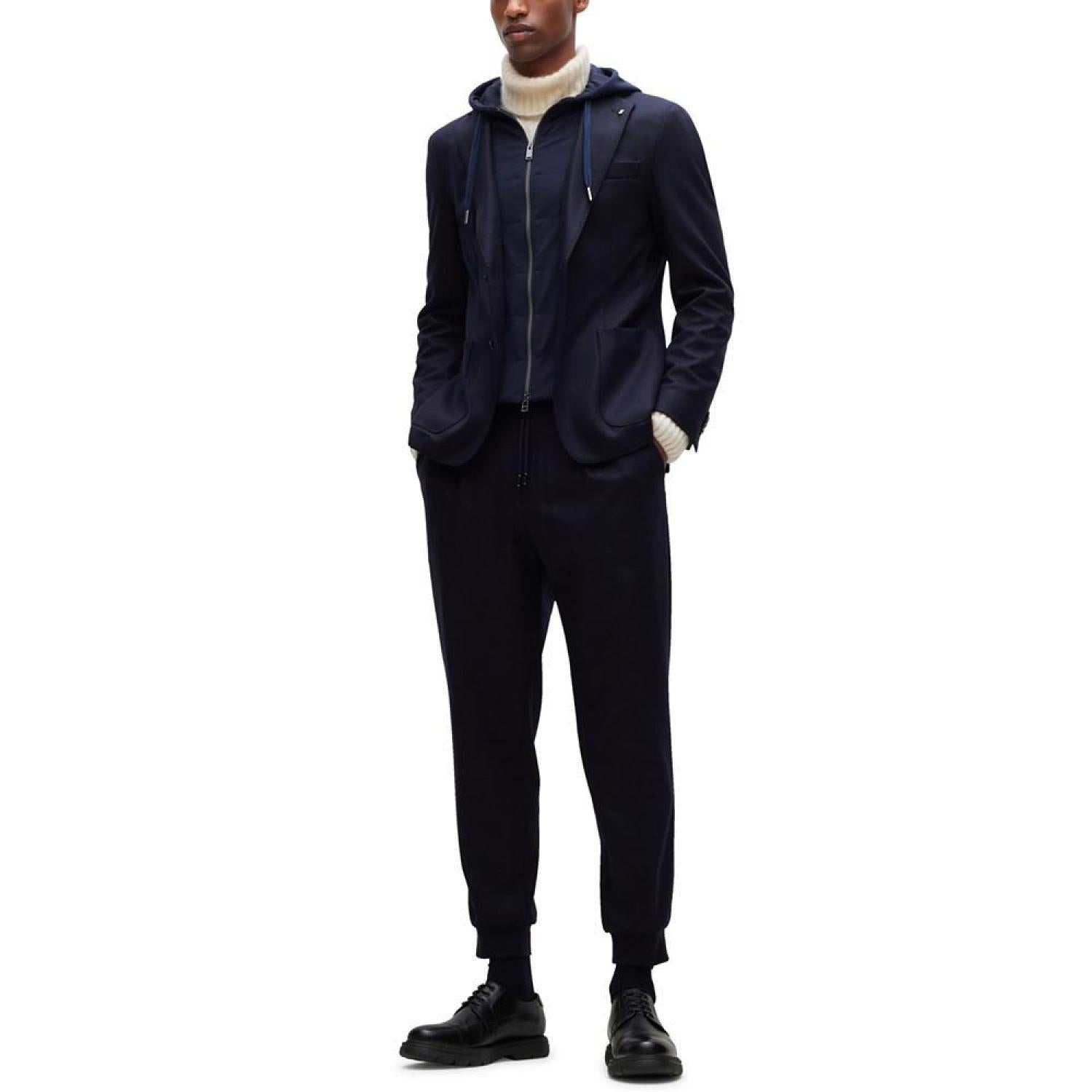 • Versatile trousers by BOSS menswear. Crafted in a wool blend containing stretch for easy movement, these trousers are cut to a tapered fit with a drawstring waist and pleat front. The front waistband and rear pocket are trimmed with a signature-stripe accent.