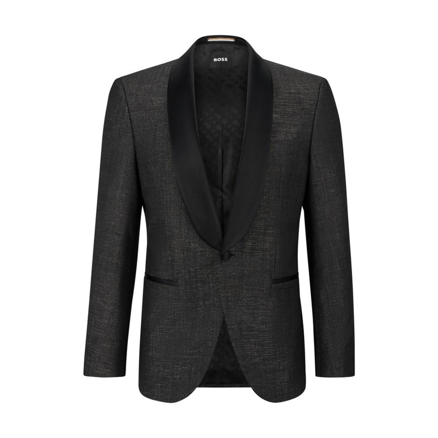 An evening-ready tuxedo jacket by BOSS Menswear. Tailored to a regular fit for easy lines, this contemporary jacket is crafted in soft twill that's rich in wool for a refined look and feel. Silk-blend trims and monogram-print lining add the finishing touches.