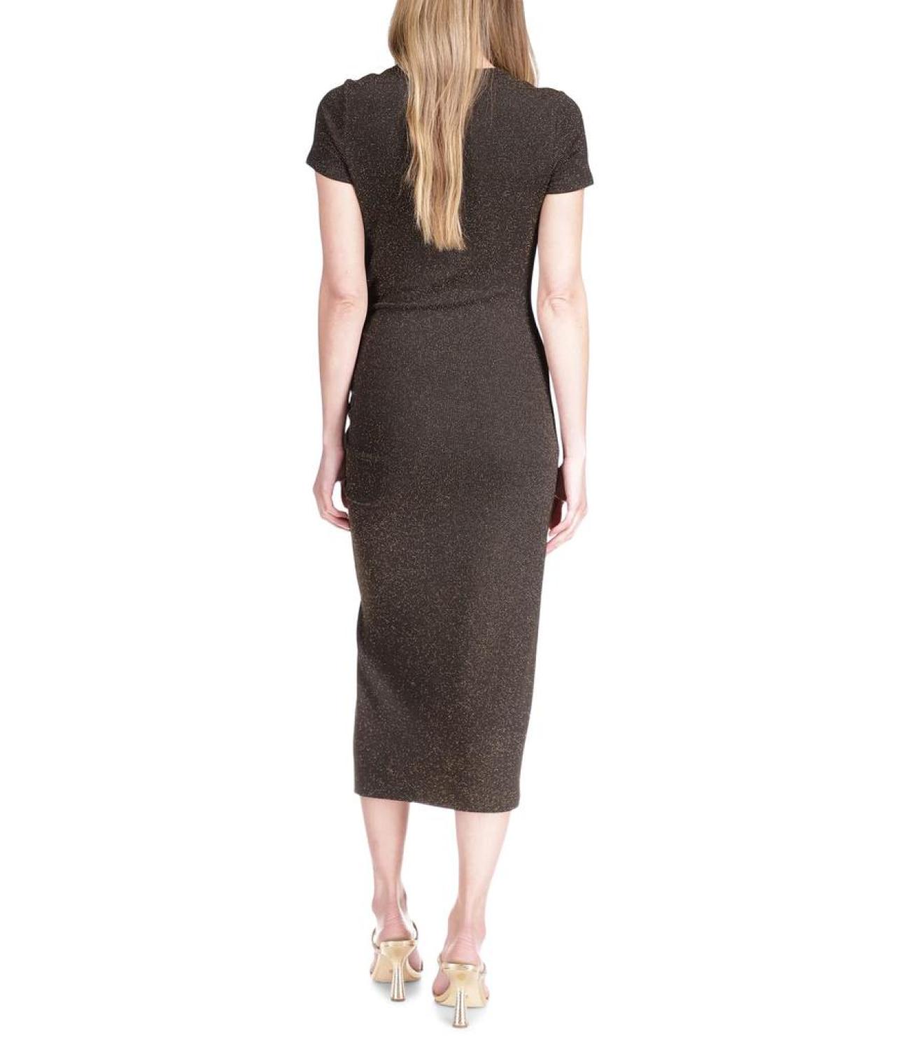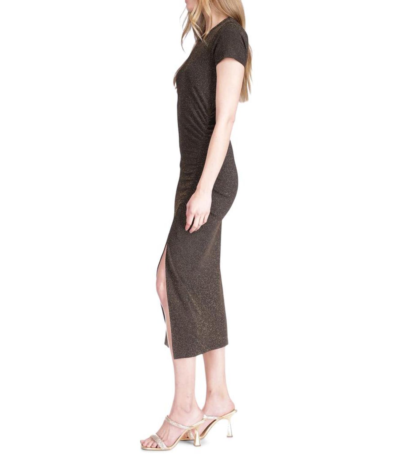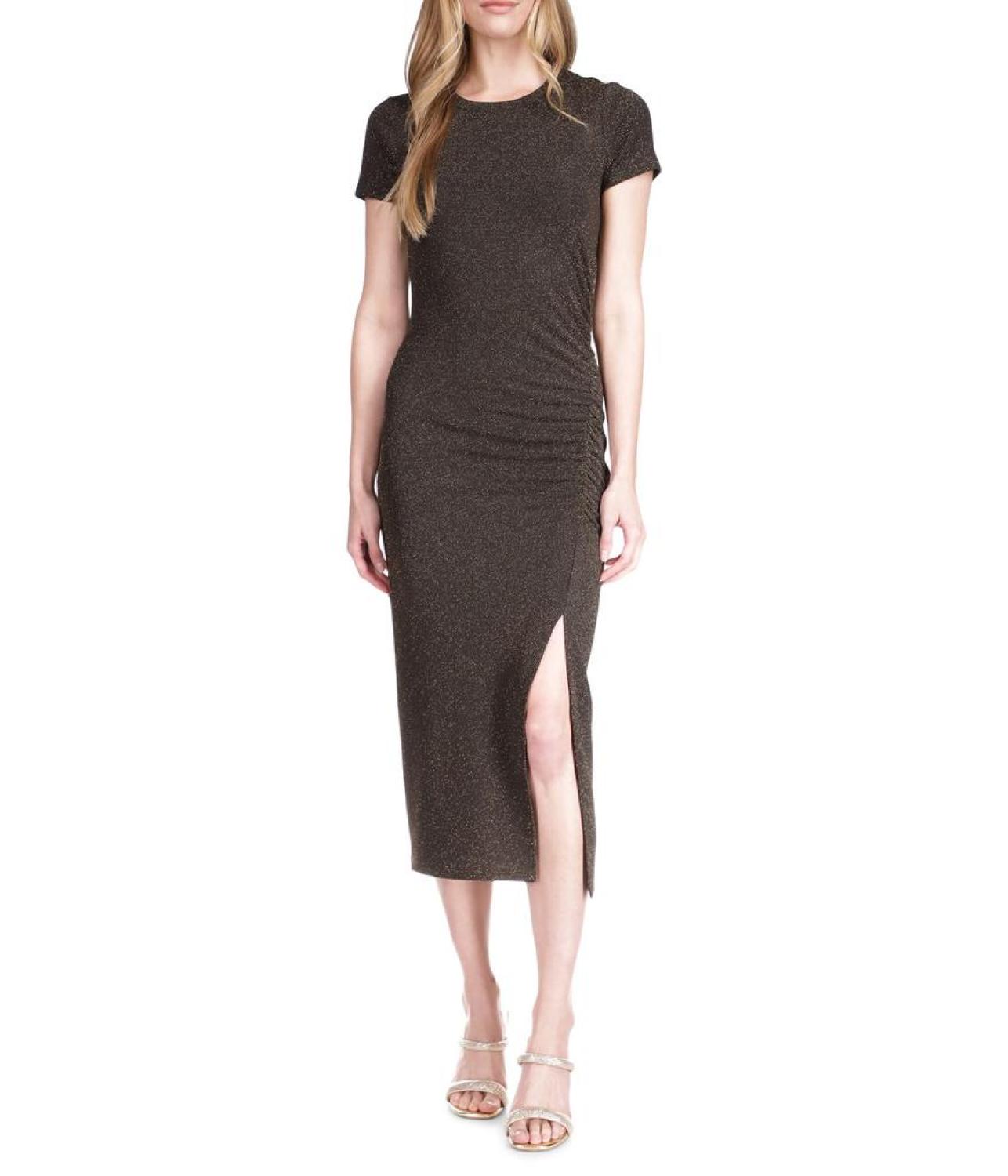 MICHAEL Michael Kors® Metallic Ruched Short Sleeve Midi Dress accentuates your elegant curves and highlights your legs with a split on the front.