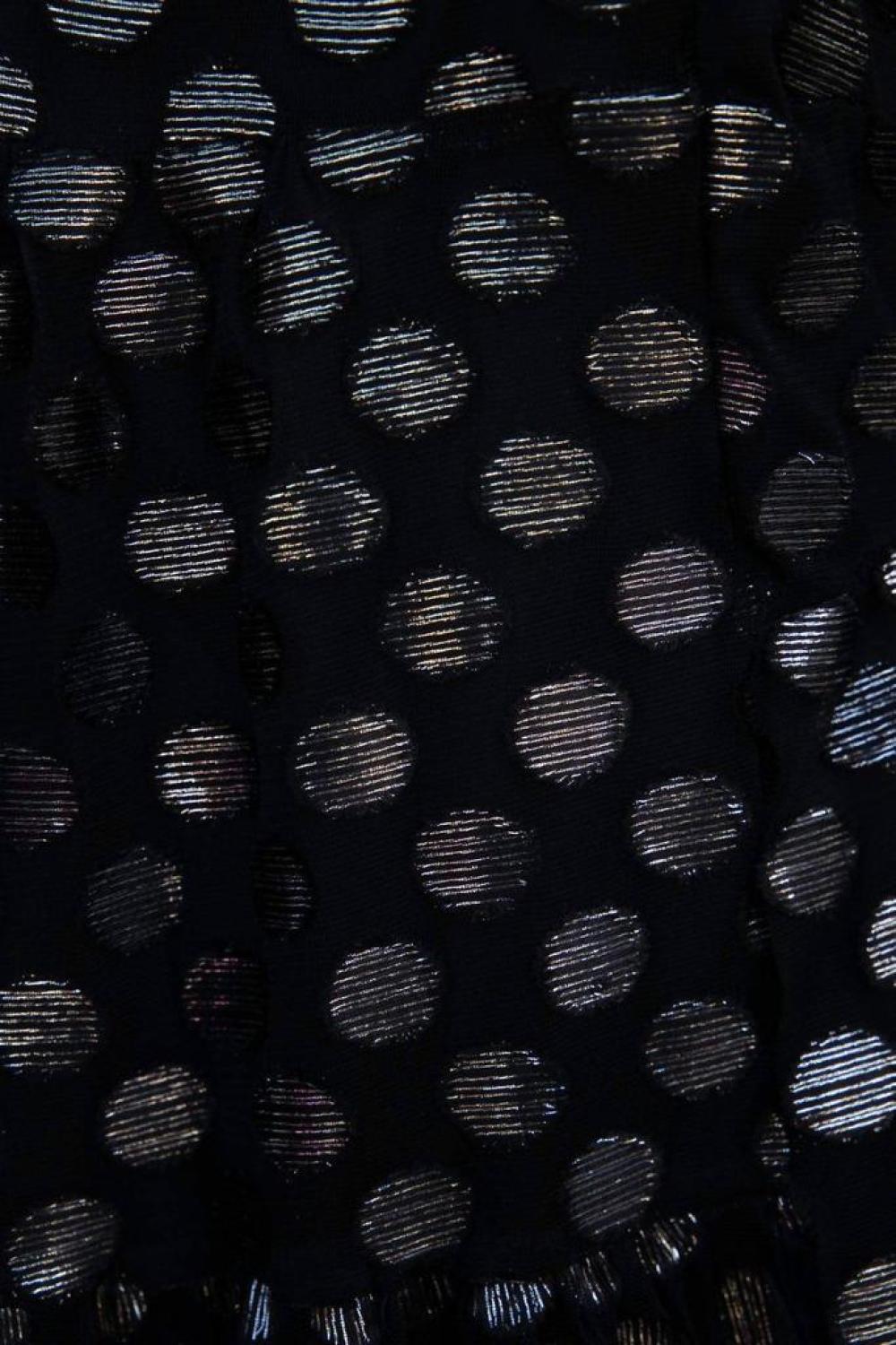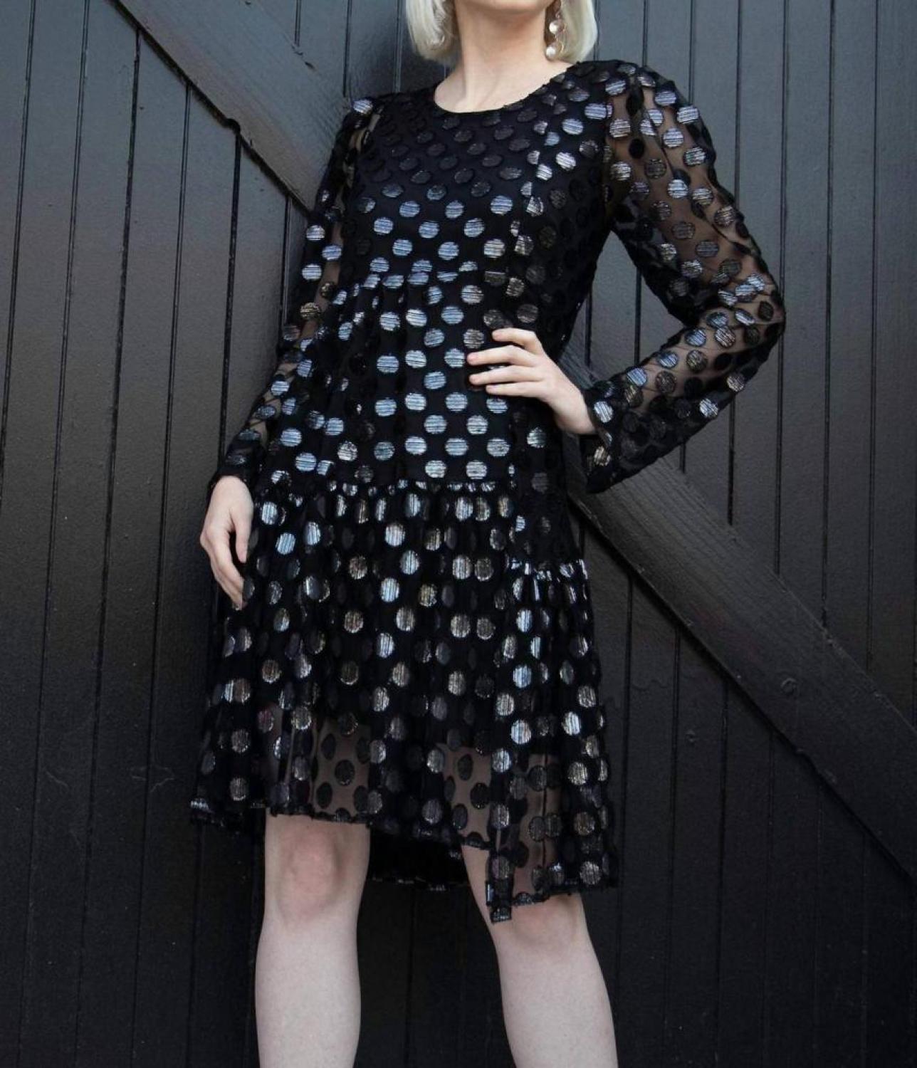 • The pefect long sleeve dress for those cooler months. Super soft and full of flounce you'll be catching eyes all night. Our disco dot fabric is a knit fabric that has stretch and shine. Shine bright in this cutesy number that is also super comfortable to wear! High-low hem Sheer long sleeves Mini length Lined bodice and skirt Black and silver clip dot knit fabric Rear zip