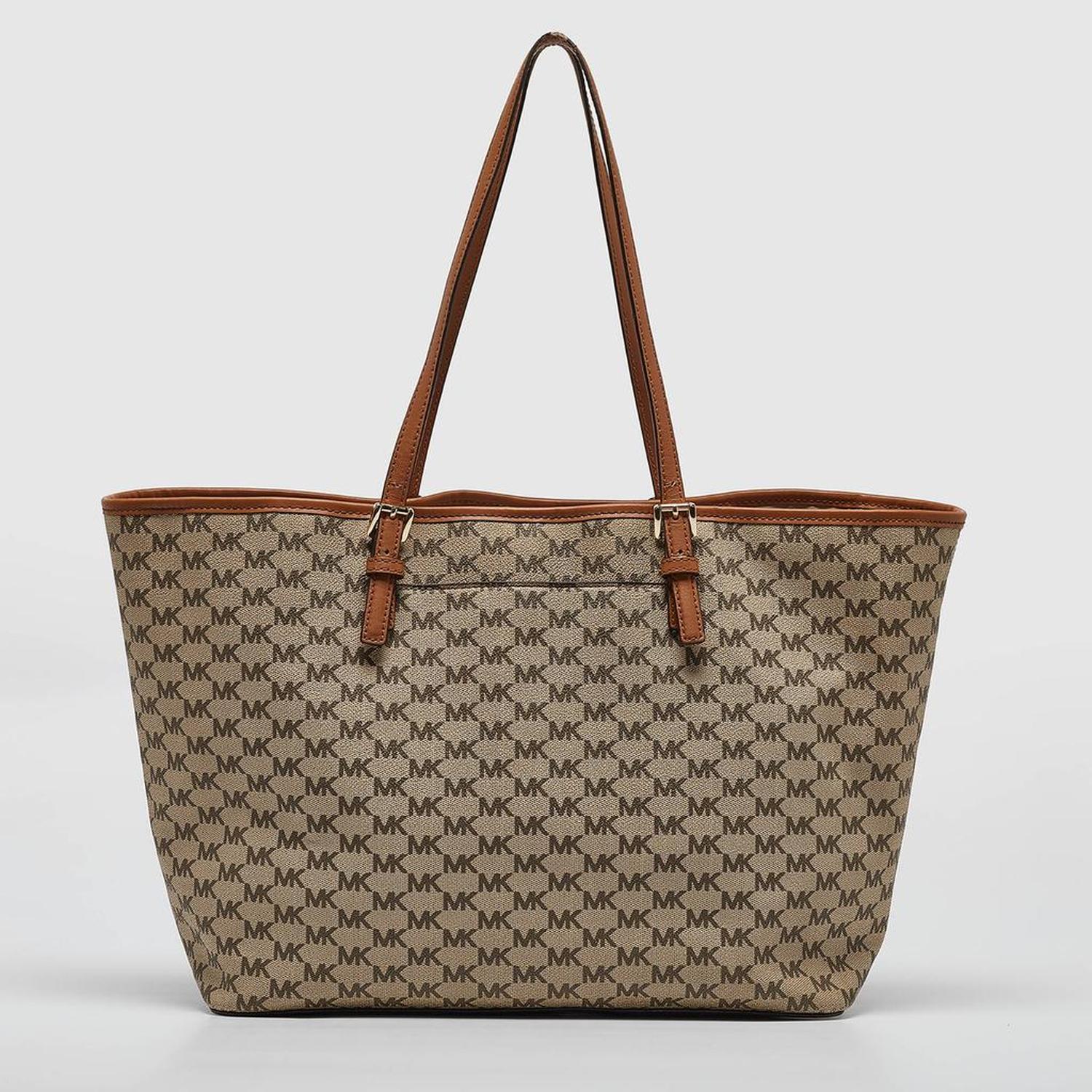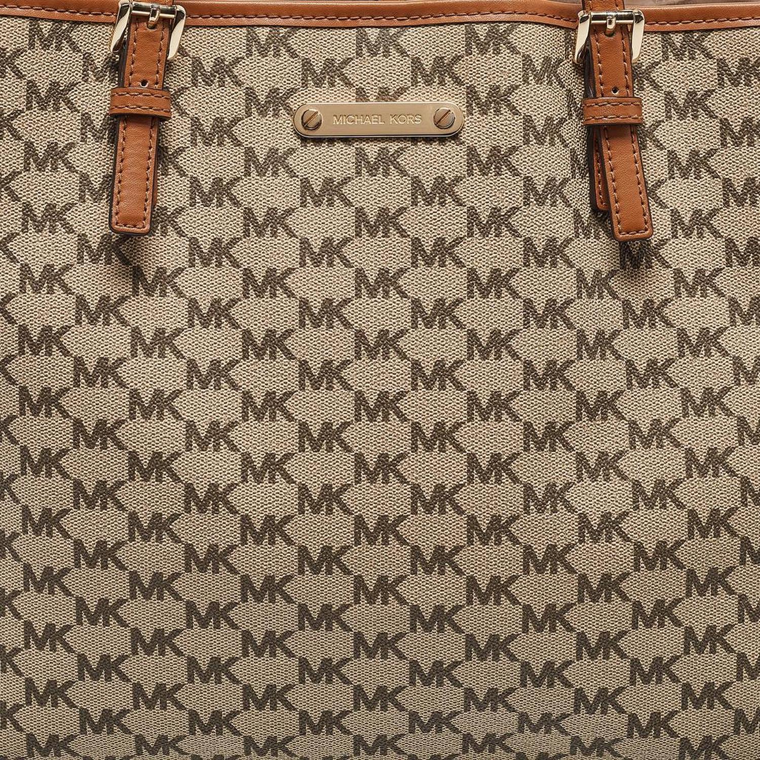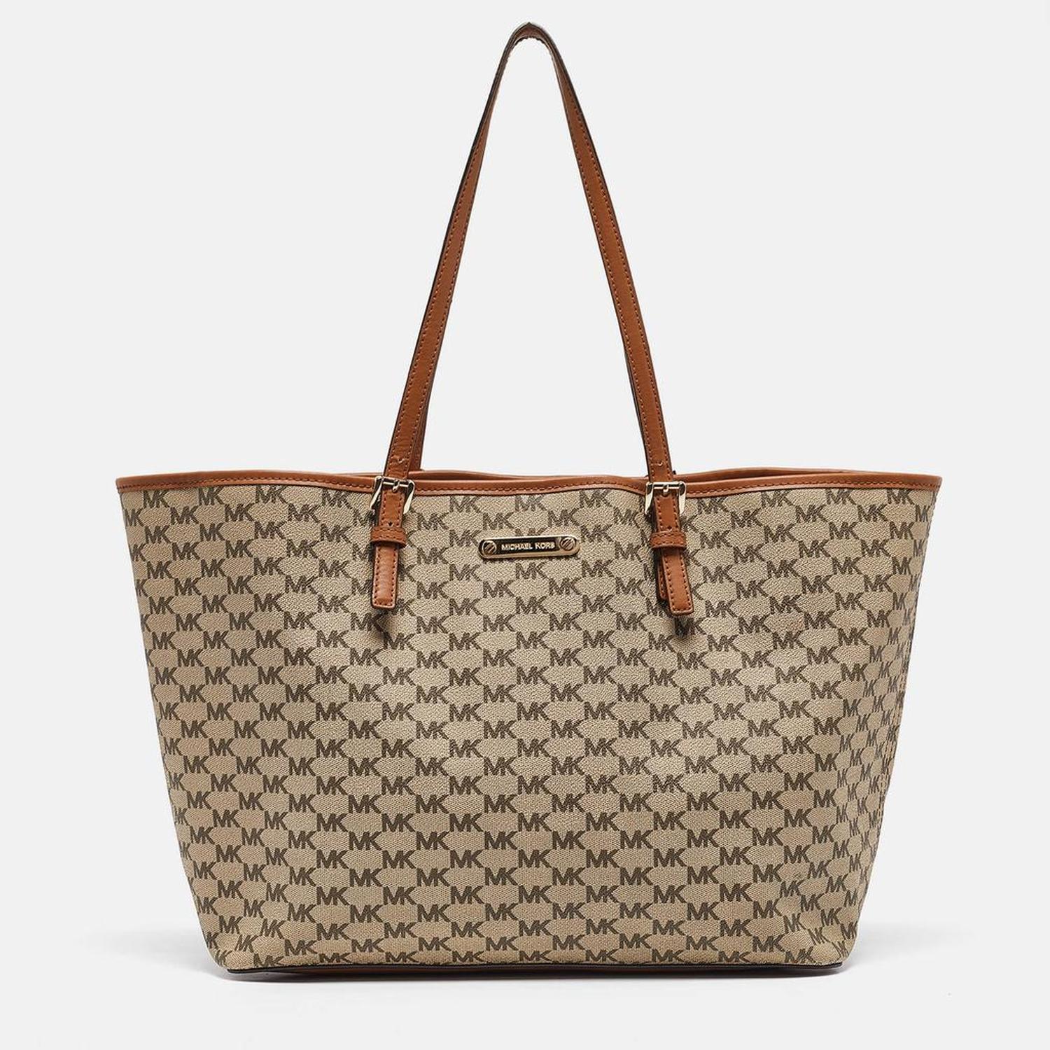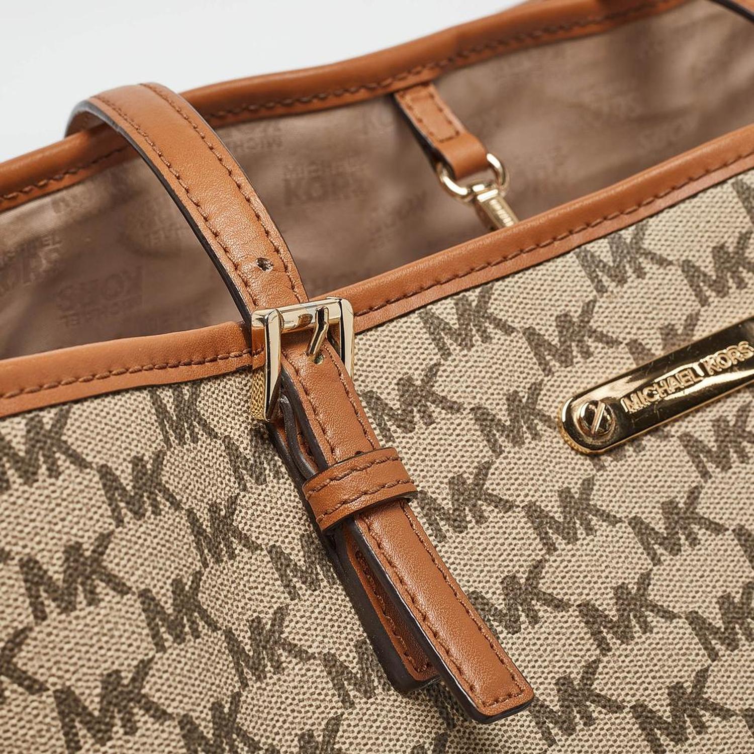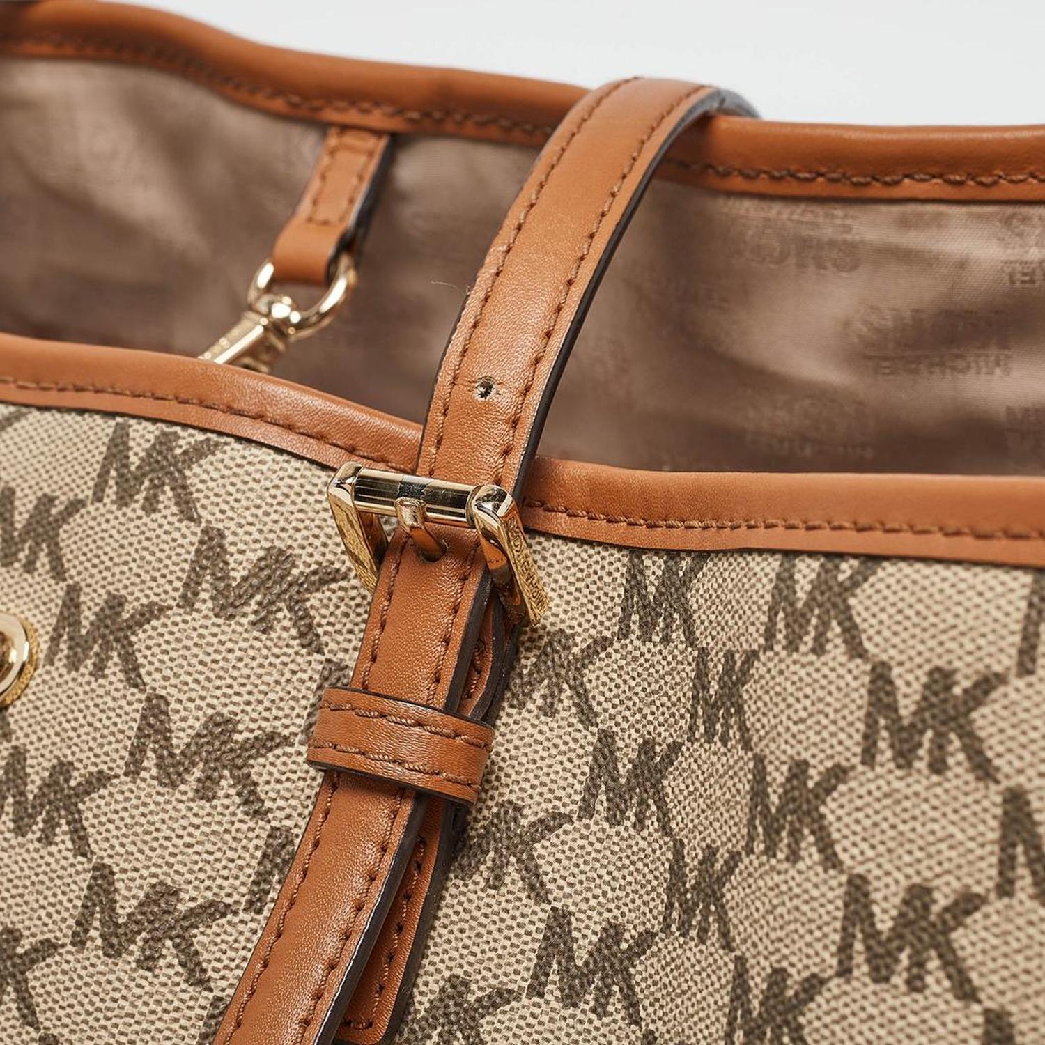 Michael Kors Brown/beige Signature Coated Canvas And Leather Emery Tote