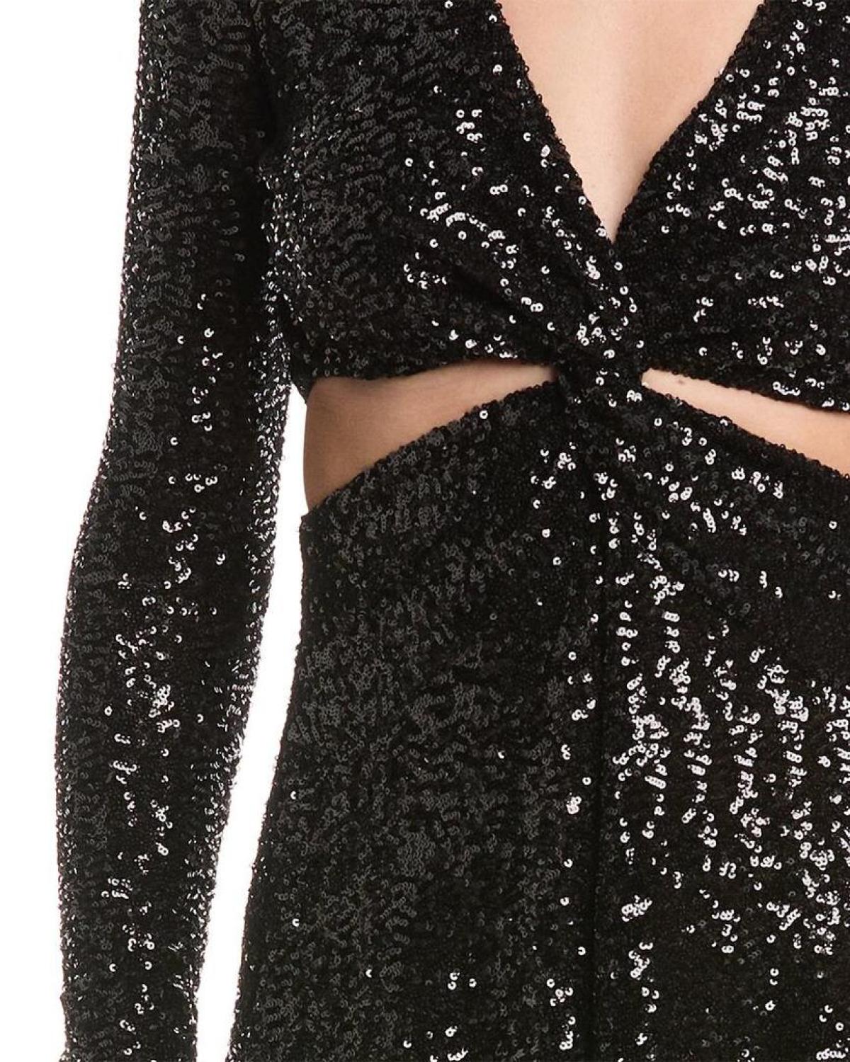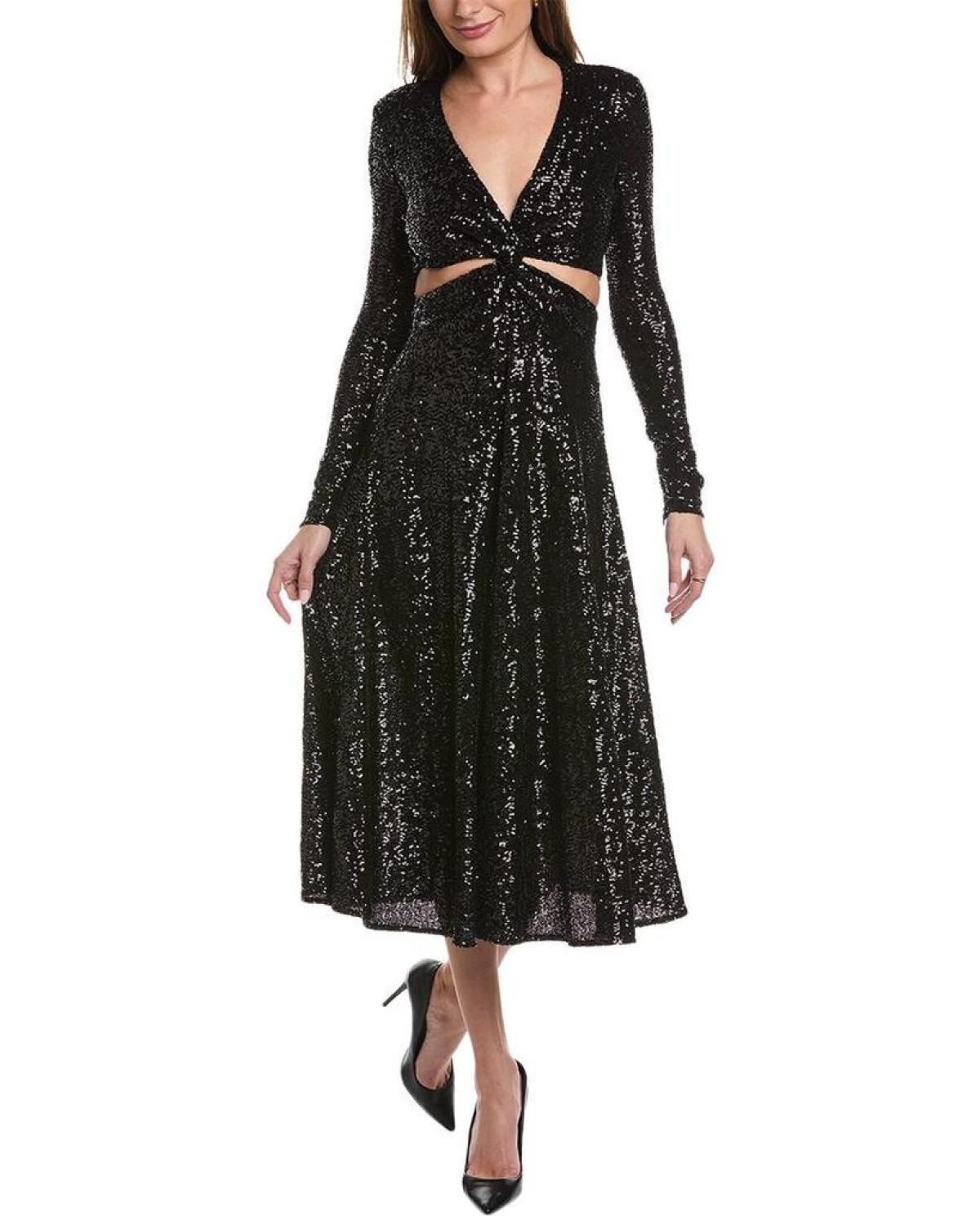 Introducing the Michael Kors Collection Cutout Sequin Midi Dress, a stunning addition to your wardrobe. This dress exudes glamour and sophistication, showcasing the signature style of the renowned brand, Michael Kors Collection. Designed with a stylish twist, this black dress features a cutout sequin design that catches the light and effortlessly dazzles. The twisted front adds a unique touch, enhancing the overall appeal. From shoulder to hem, this dress measures approximately 49 inches, offering a midi-length that flatters various body types. The model, standing at 5'10', is wearing a size 2, emphasizing the versatility of this dress. Please note that measurements may vary slightly by size. The center back zipper with a hook-and-eye closure ensures a secure and perfect fit. Crafted with a combination of 68% polyester, 29% nylon, and 3% elastane, this dress offers both comfort and flexibility. To preserve the garment's quality, it is recommended to dry clean only. This dress is proudly made in Italy, showcasing the brand's commitment to craftsmanship and attention to detail. Elevate your style with the Michael Kors Collection Cutout Sequin Midi Dress, a timeless piece that effortlessly combines all-American styles with easy glamour and luxurious living.