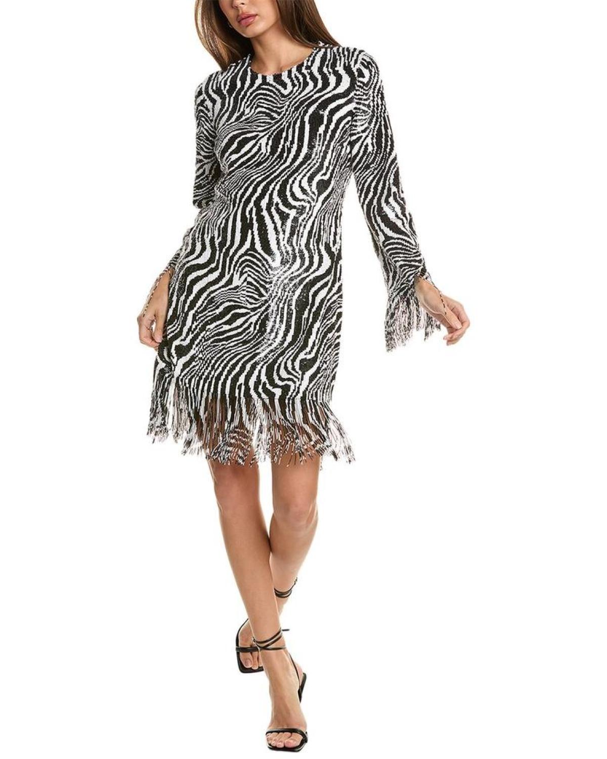Elevate your wardrobe with the show-stopping Michael Kors Collection Sequin Fringe Shift Dress. This stunning dress features a black and white zebra pattern with intricate beaded fringe detailing, perfect for making a statement at any event. Crafted from a blend of nylon and elastane, this dress offers both style and comfort. The center back zipper with hook-and-eye closure ensures a secure fit. Pair this dress with heels and a clutch for an effortlessly glamorous look. Dry clean only. Imported.