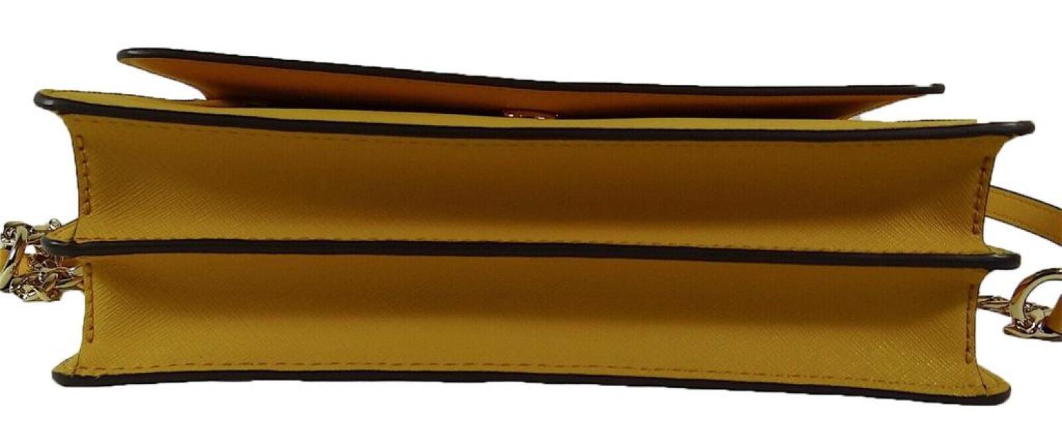 • Made of Leather; Front magnetic snap flap closure; Front zip pocket (under flap); 1 open pocket 2 open compartments; Adjustable Leather and chain shoulder strap of 22-24 inches drop 6 credit card slots; 1 back slide pocket; Gold hardware Measurements - Length - 9.5 x Height - 7 x Width - 2 Inches Comes with original tags