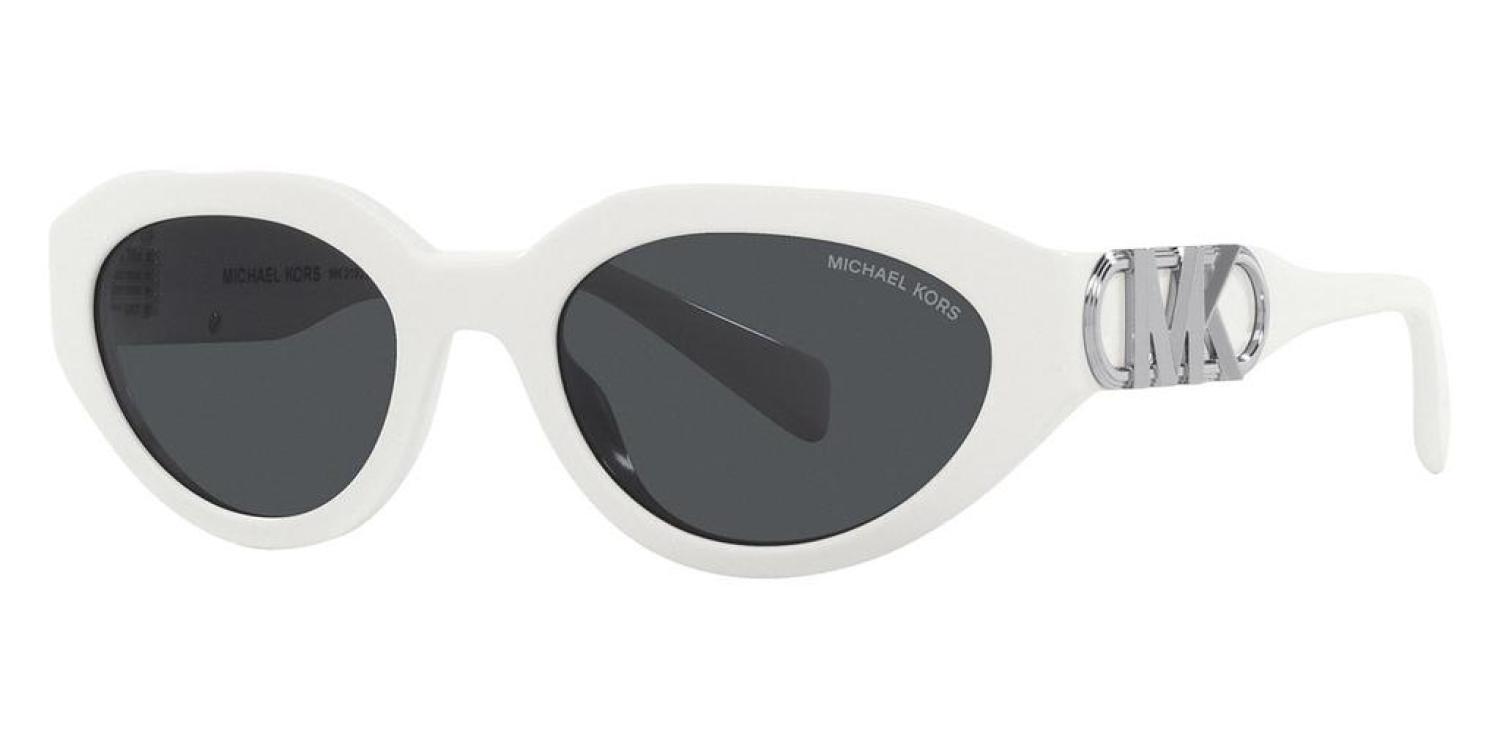 Michael Kors Women's Sunglasses. Dimensions - 53 mm x 20 mm x 140 mm. Optic White Oval Acetate frame, Grey Solid lenses. 100% UV Protection, Non-Polarized. Made in China. (MK2192-310087-53)