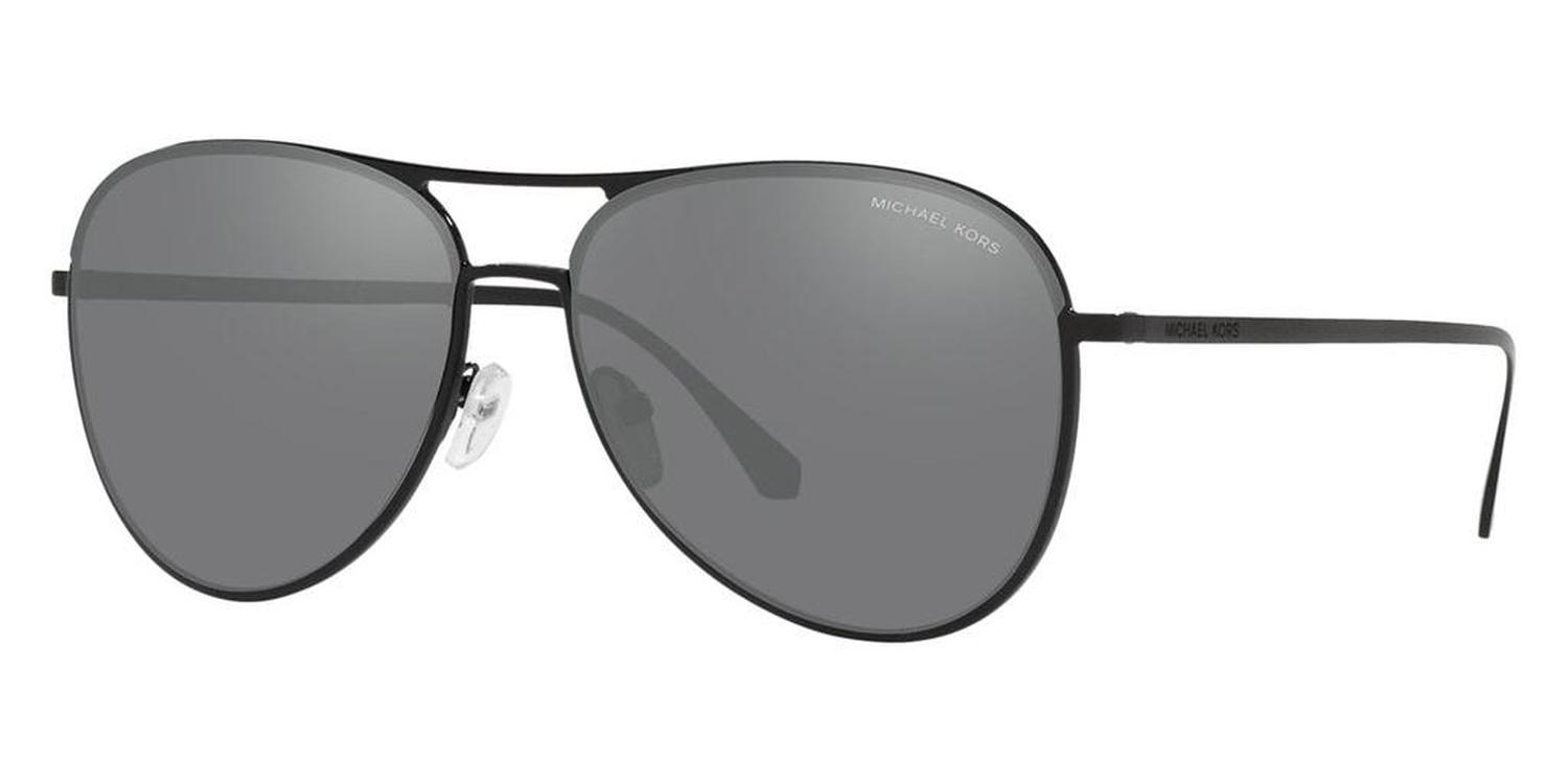 • The Michael Kors women's sunglasses measure at 59 mm lens width, 14 mm bridge width, 140 mm lens width. The frame is aviator-shaped shiny black metal. Made In China (MK1089-10056G)