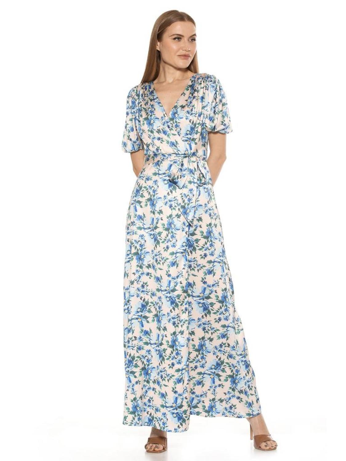 • PRODUCT FEATURES V-neck Bubble Blouson sleeves Shirred details Wrap front closure Maxi Dress 97% Polyester, 3% Spandex Lined - 100% Polyester Machine wash, tumble dry Imported Style D3905