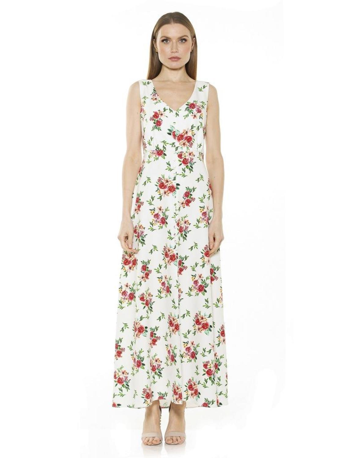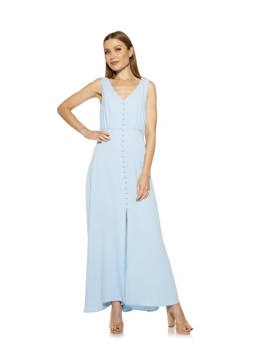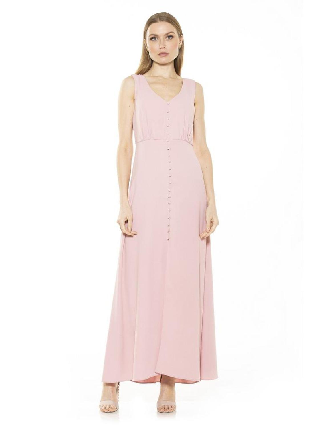 PRODUCT FEATURES This style fits true to size V-neck bodice Sleeveless style Concealed back zip with hook-and-eye closure Maxi skirt 100% Polyester Lined - 97% Polyester, 3% Spandex Machine wash cold gentle Imported Style D3669