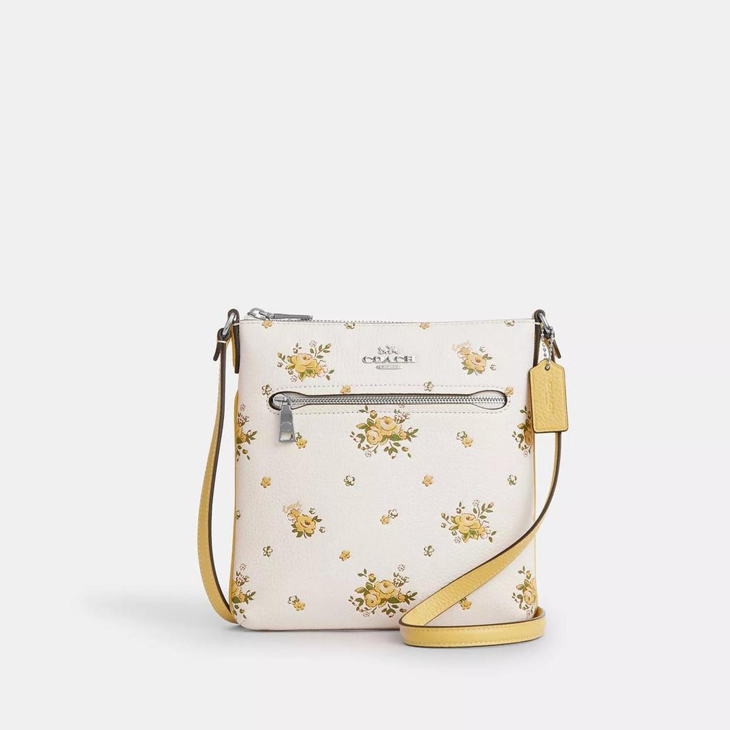 • Refined pebble leather Inside multifunction pocket Zip-top closure fabric lining Outside zip pocket Adjustable strap with 22 drop for shoulder or crossbody wear 8 1/4 (L) x 8 1/4 (H) x 1 1/4 (W) Style No. CAQ08 | Coach Outlet Mini Rowan File Bag With Floral Print - Multi/Yellow