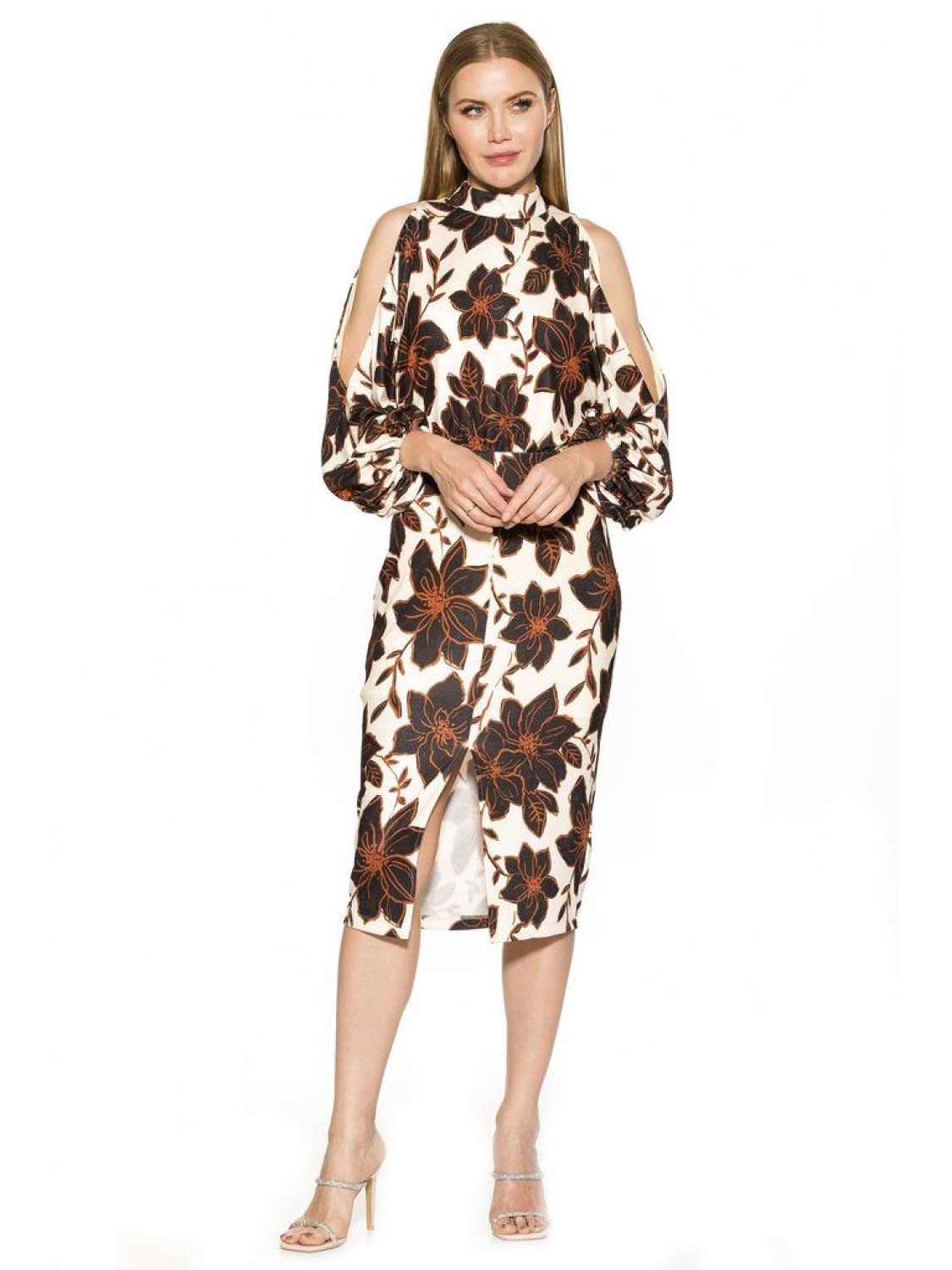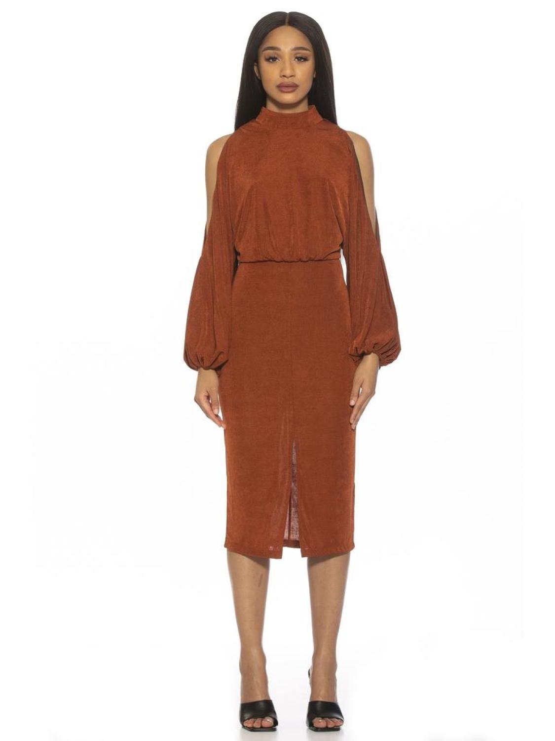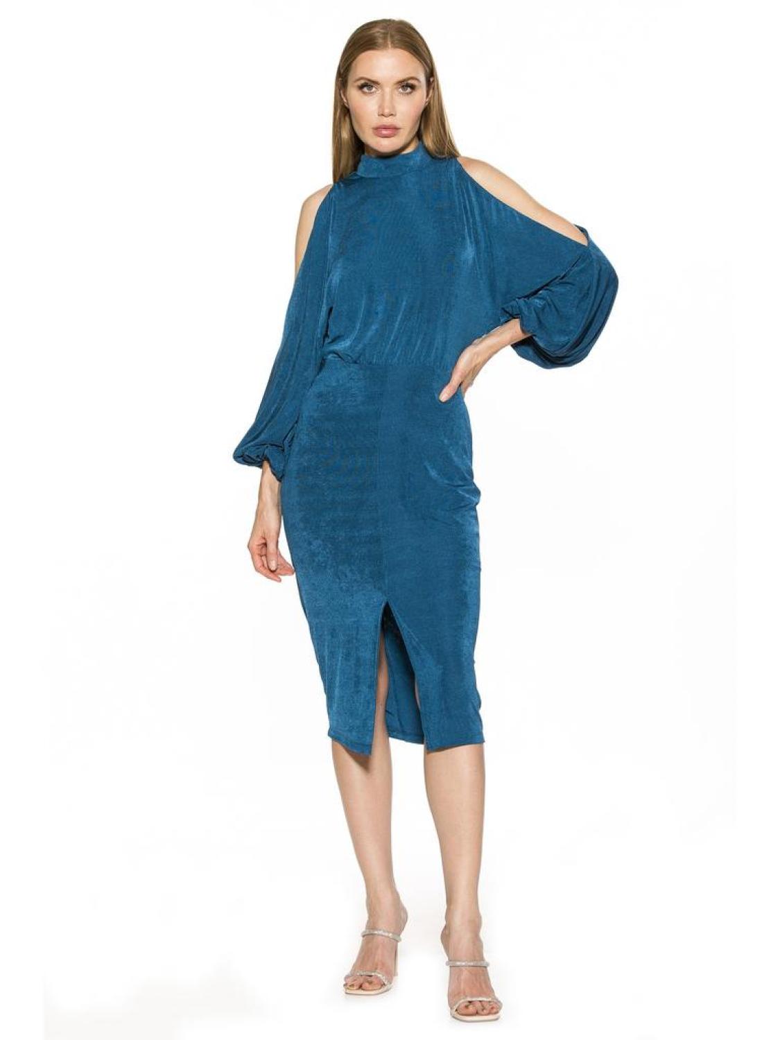 PRODUCT FEATURES 45 3/4-in. length Cold-shoulder sleeves Jersey construction Elastic cuffs Mockneck Long sleeves Midi length Button closure, hidden zipper Fit and flare silhouette 93% Polyester, 7% Spandex Lined - 93% Polyester, 7% Spandex Machine wash Imported Style D3936