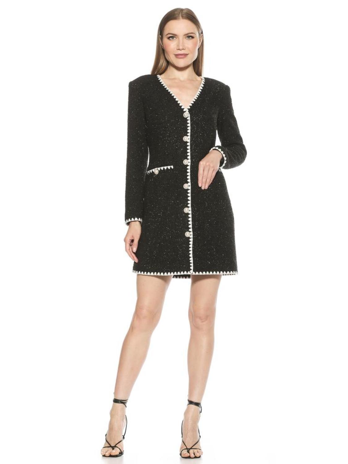 • Now introducing the Molly Dress, sisters to everyones favorite the Holly Dress.PRODUCT FEATURES V-Neck Contrast Trim Pearl Buttons Button Down Tweed Material Mini Dress 100% Polyester Lining - 97% Polyester, 3% Spandex Dry clean only Imported Style D5026