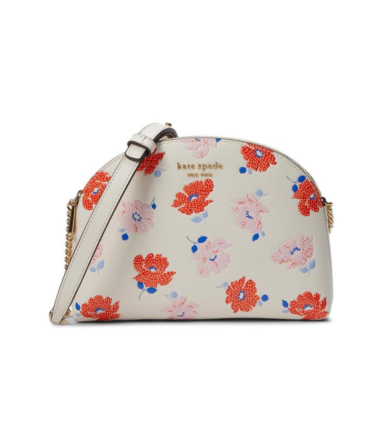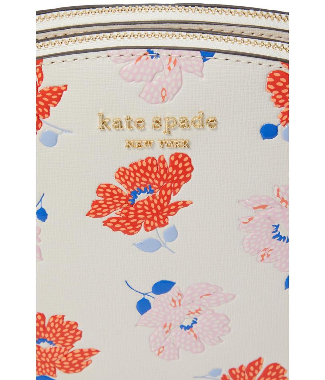 Indulge in whimsical elegance with Kate Spade New York® Morgan Dotty Floral Emboss Crossbody. Unveiling a symphony of style in embossed cow leather, this double-zip dome marvel boasts three card slots, two zippered compartments, and an interior slip pocket. Effortlessly chic, it's a playful essential for the modern trendsetter. Polyester lining. Made in Italy. Please note, the hardware color and interior lining may differ from the color shown in the photo.