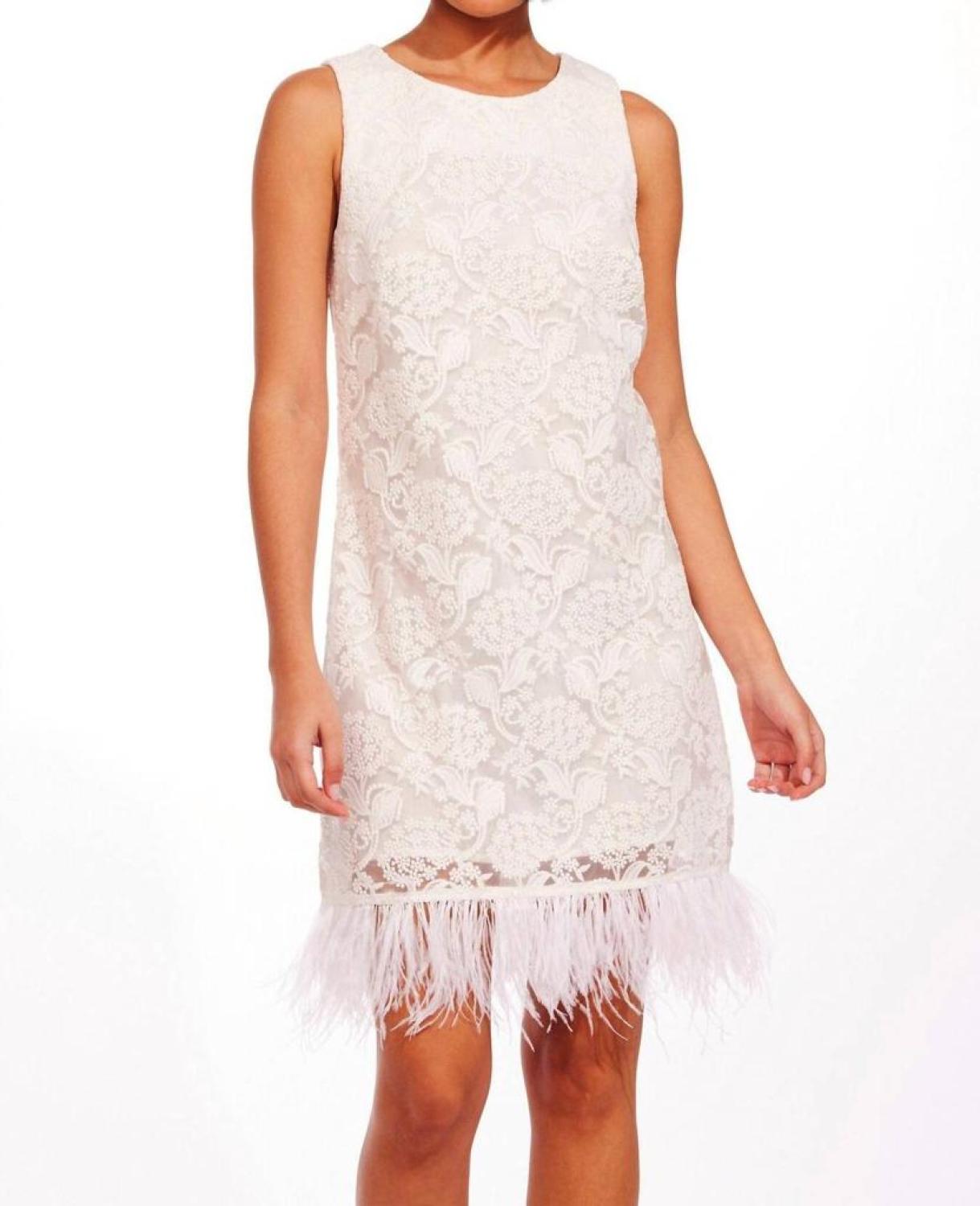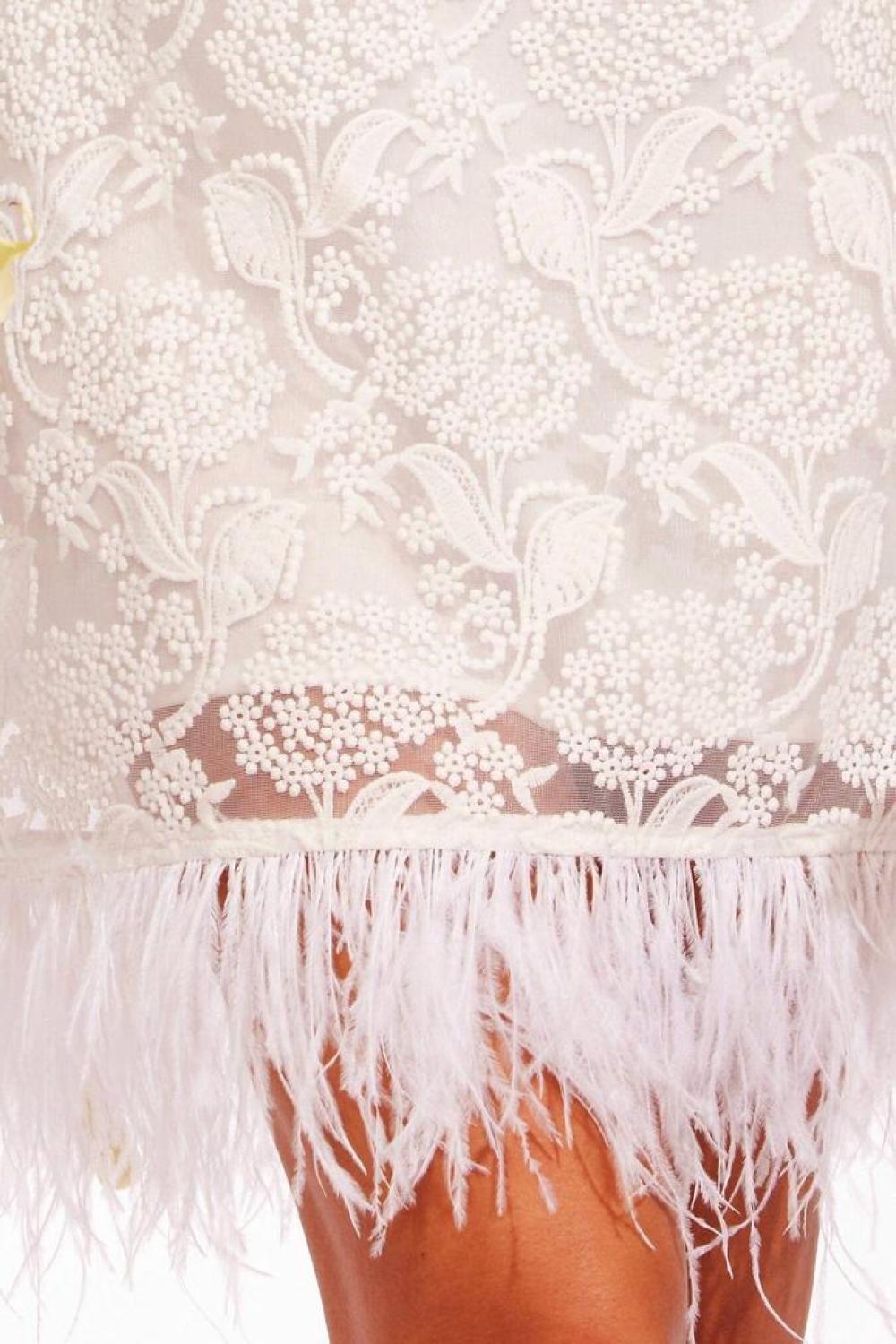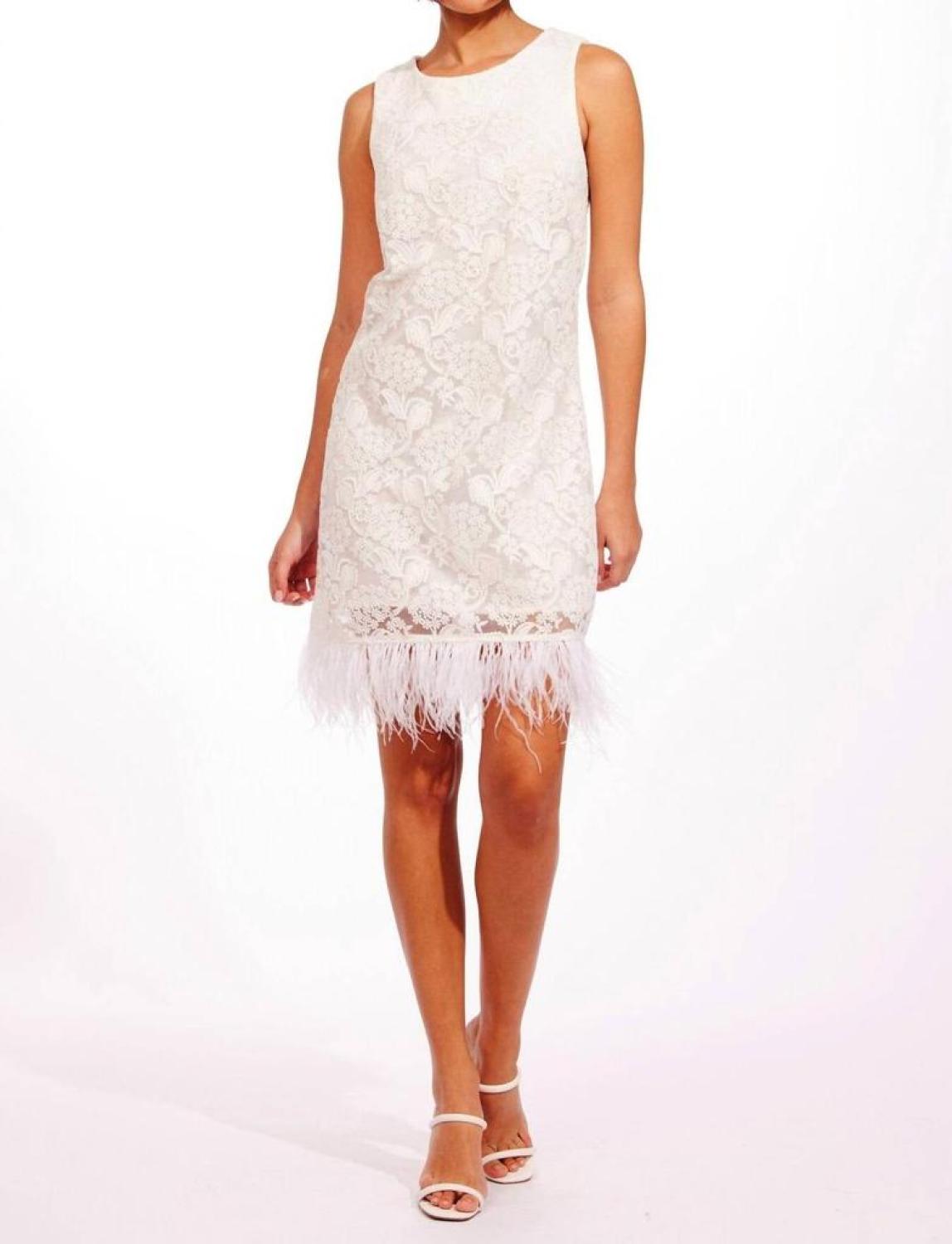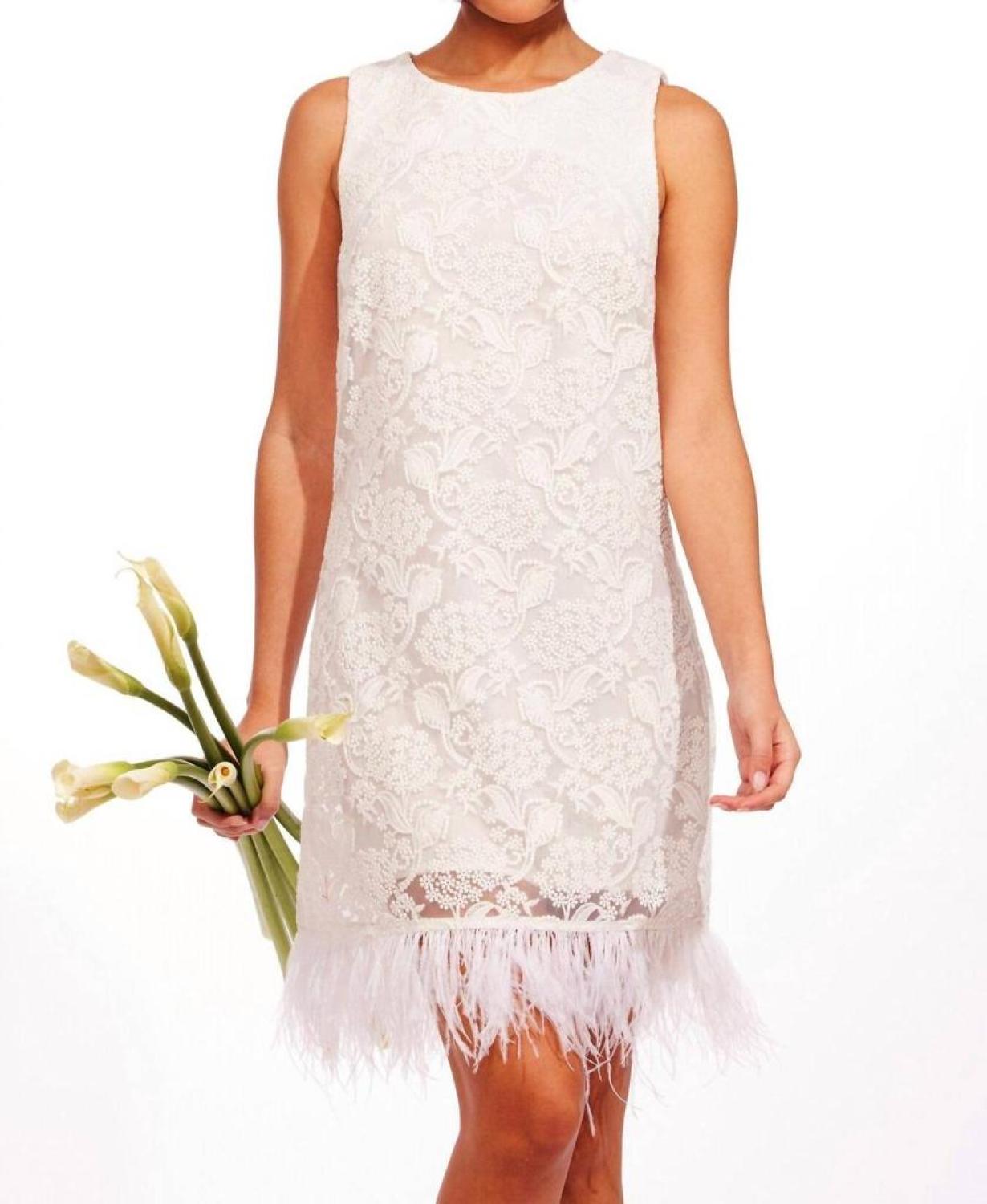 • A short and breezy dress for those warmer days.White feather trim shift mini dress perfect for any occasion. Back zip. Embroidered. Mini length. Feather trim. Sleeveless
