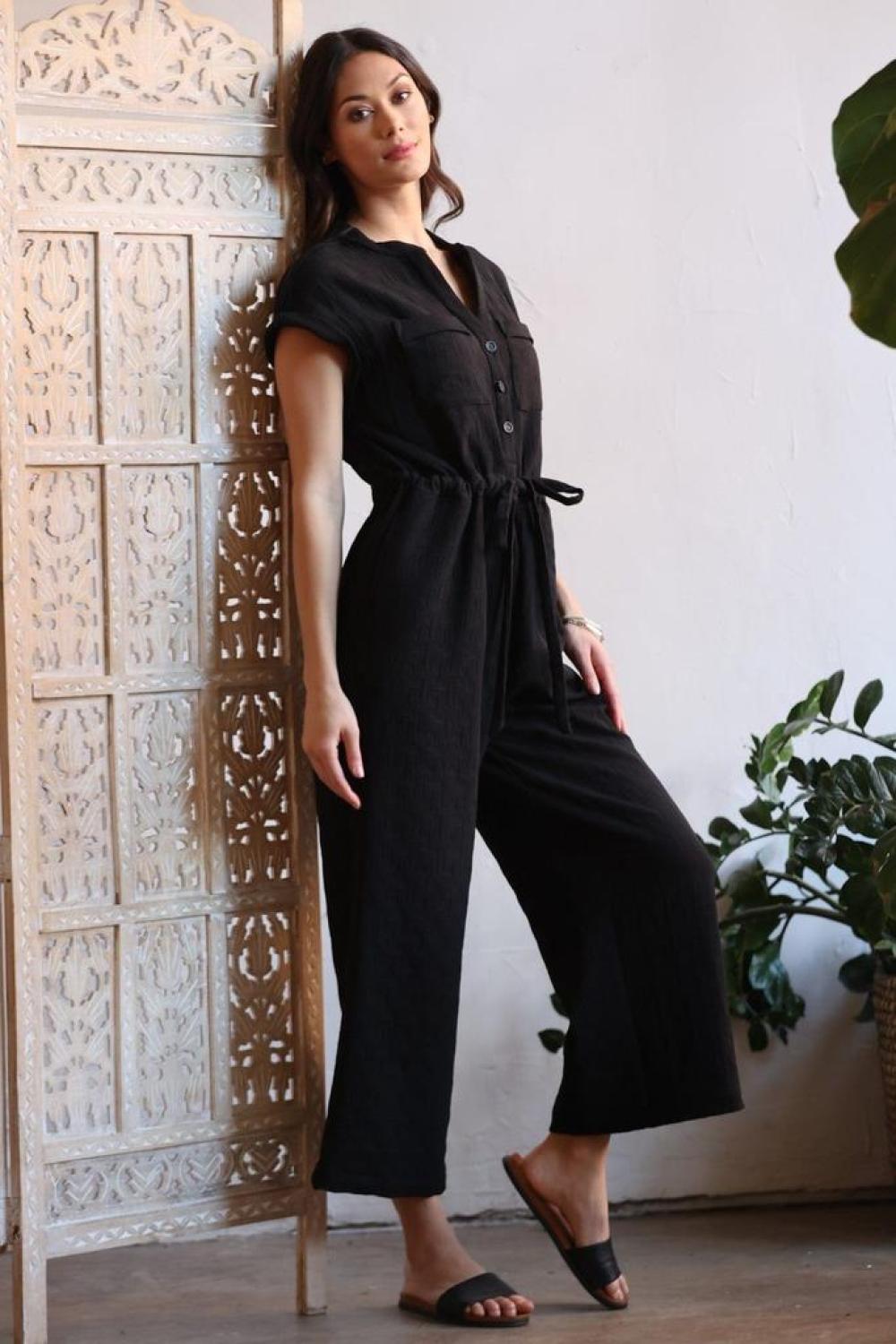• The most comfortable jumpsuit...ever! A pillowy soft textured fabric with just the right amount of stretch. Dress it up or keep it casual! V-Neck with Buttons Patch Pockets at Chest Side pockets Cuffed short-sleeve Wide-leg hits at ankle Self-Tie waist cinching belt Rear zip Made in USA
