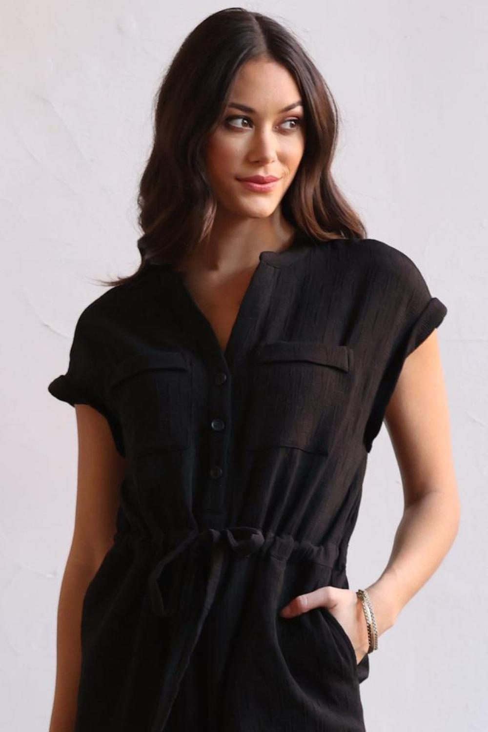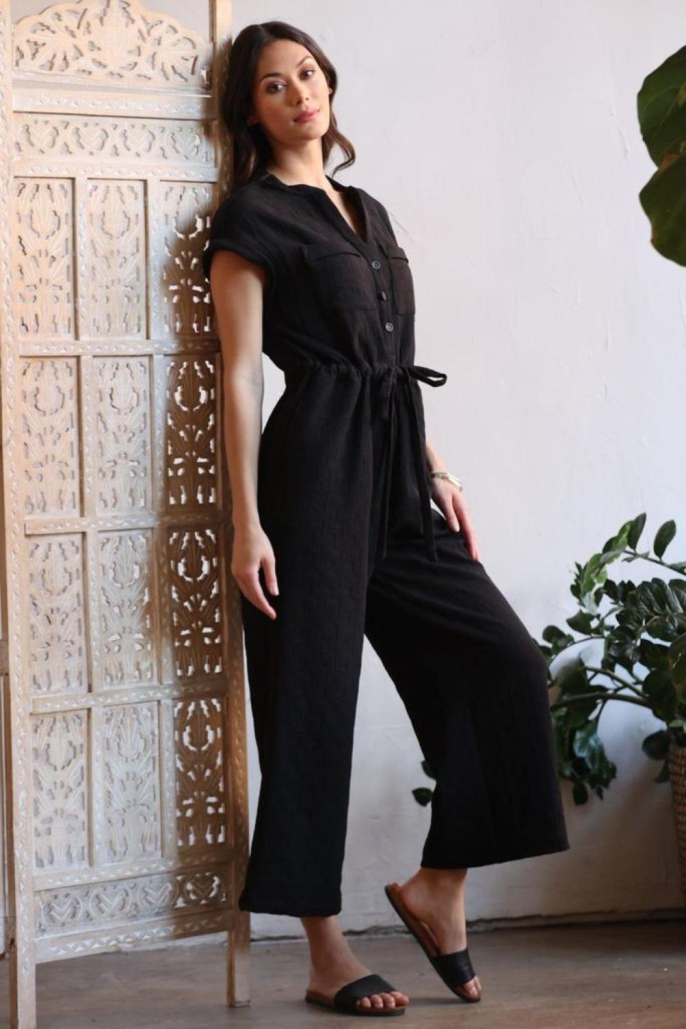 The most comfortable jumpsuit...ever! A pillowy soft textured fabric with just the right amount of stretch. Dress it up or keep it casual! V-Neck with Buttons Patch Pockets at Chest Side pockets Cuffed short-sleeve Wide-leg hits at ankle Self-Tie waist cinching belt Rear zip Made in USA