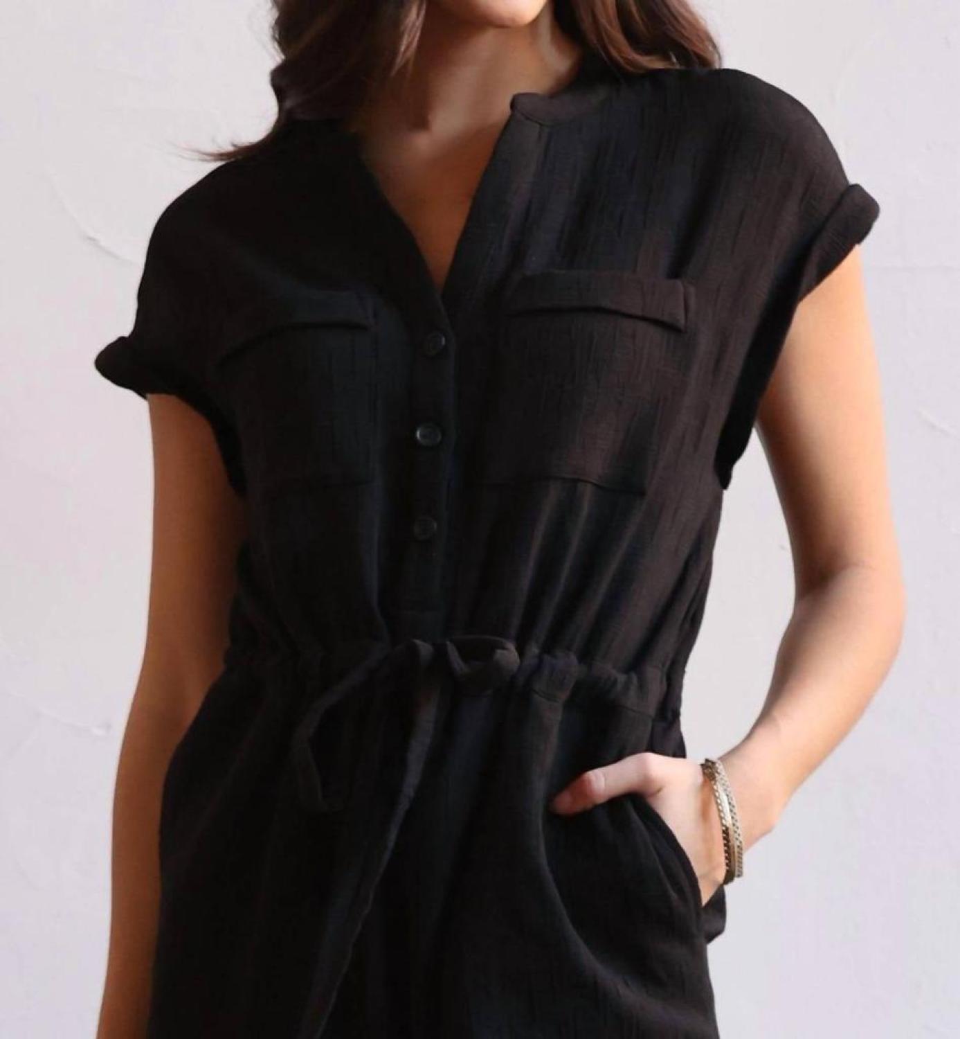 Throw it on and go!A pillowy soft textured fabric with just the right amount of stretch. Dress it up or keep it casual! V-Neck with Buttons Patch Pockets at Chest Side pockets Cuffed short-sleeve Wide-leg hits at ankle Self-Tie waist cinching belt Rear zip Made in USA