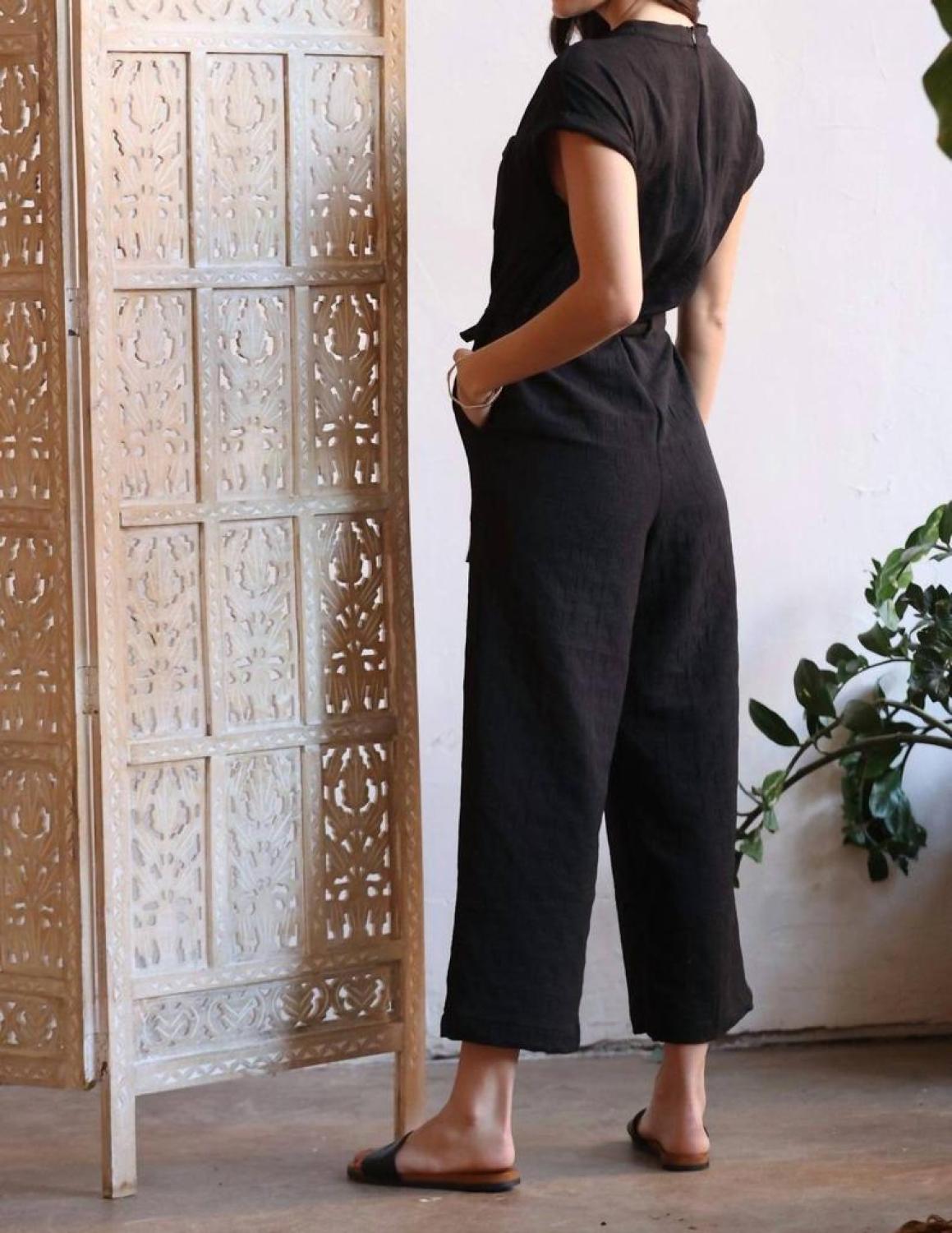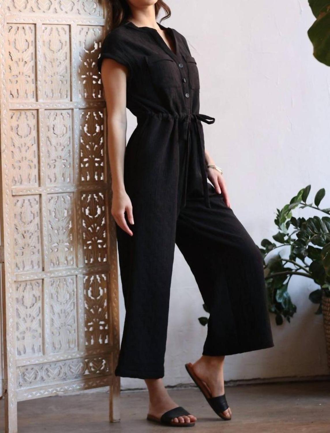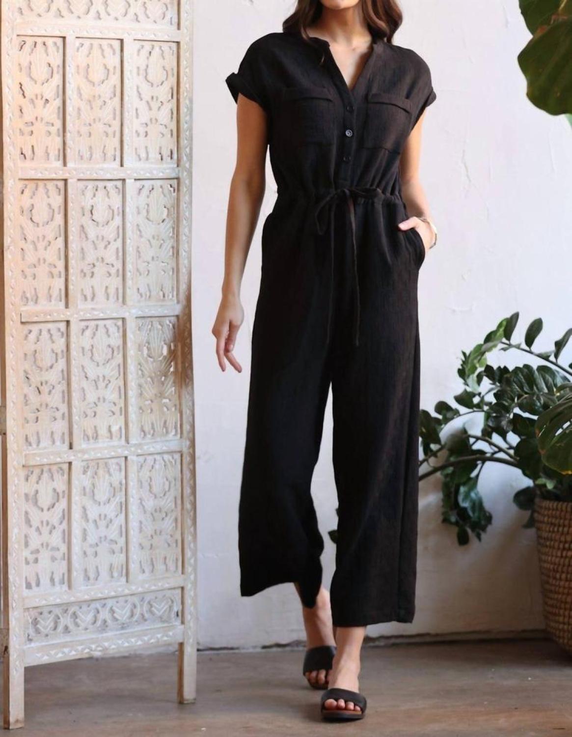 • Throw it on and go!A pillowy soft textured fabric with just the right amount of stretch. Dress it up or keep it casual! V-Neck with Buttons Patch Pockets at Chest Side pockets Cuffed short-sleeve Wide-leg hits at ankle Self-Tie waist cinching belt Rear zip Made in USA