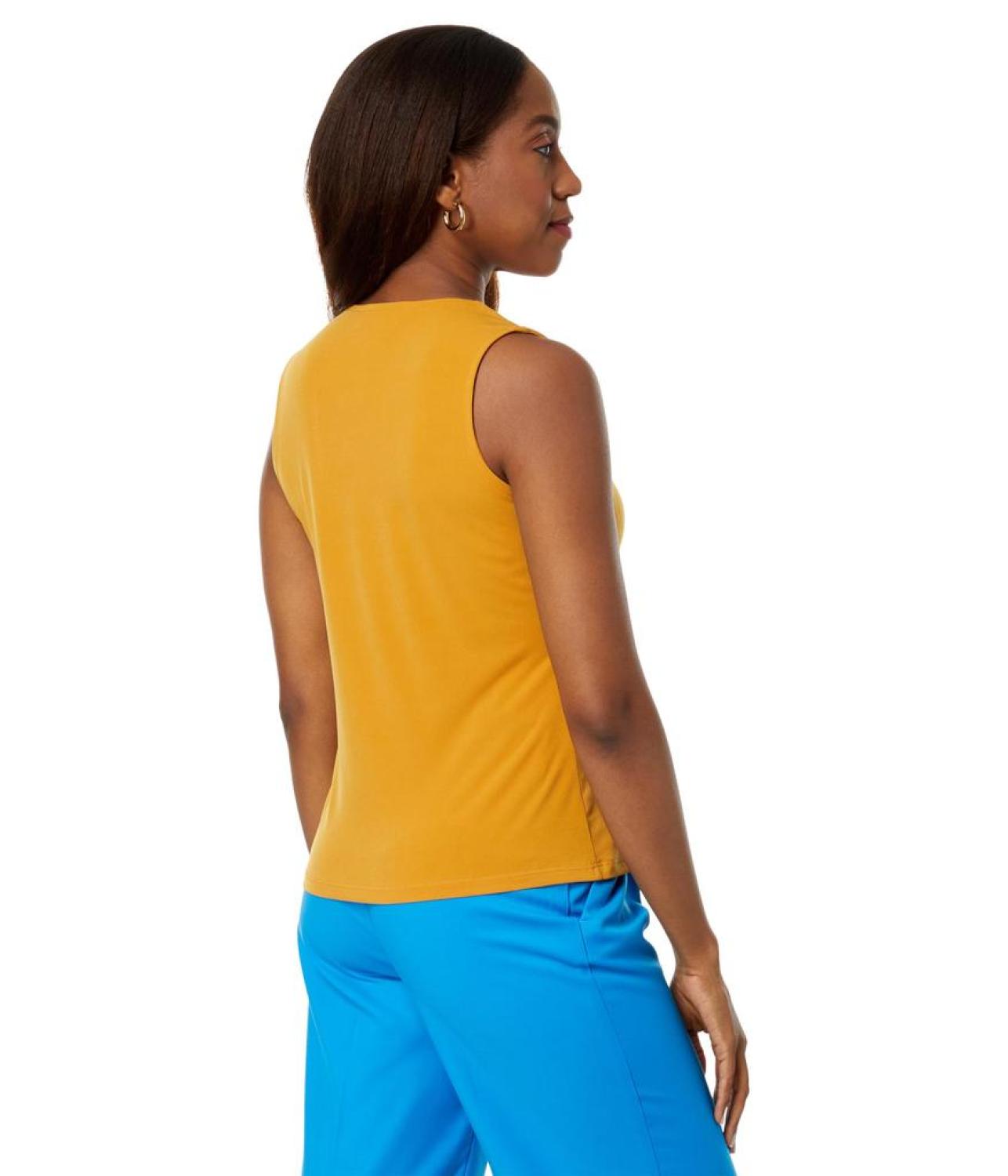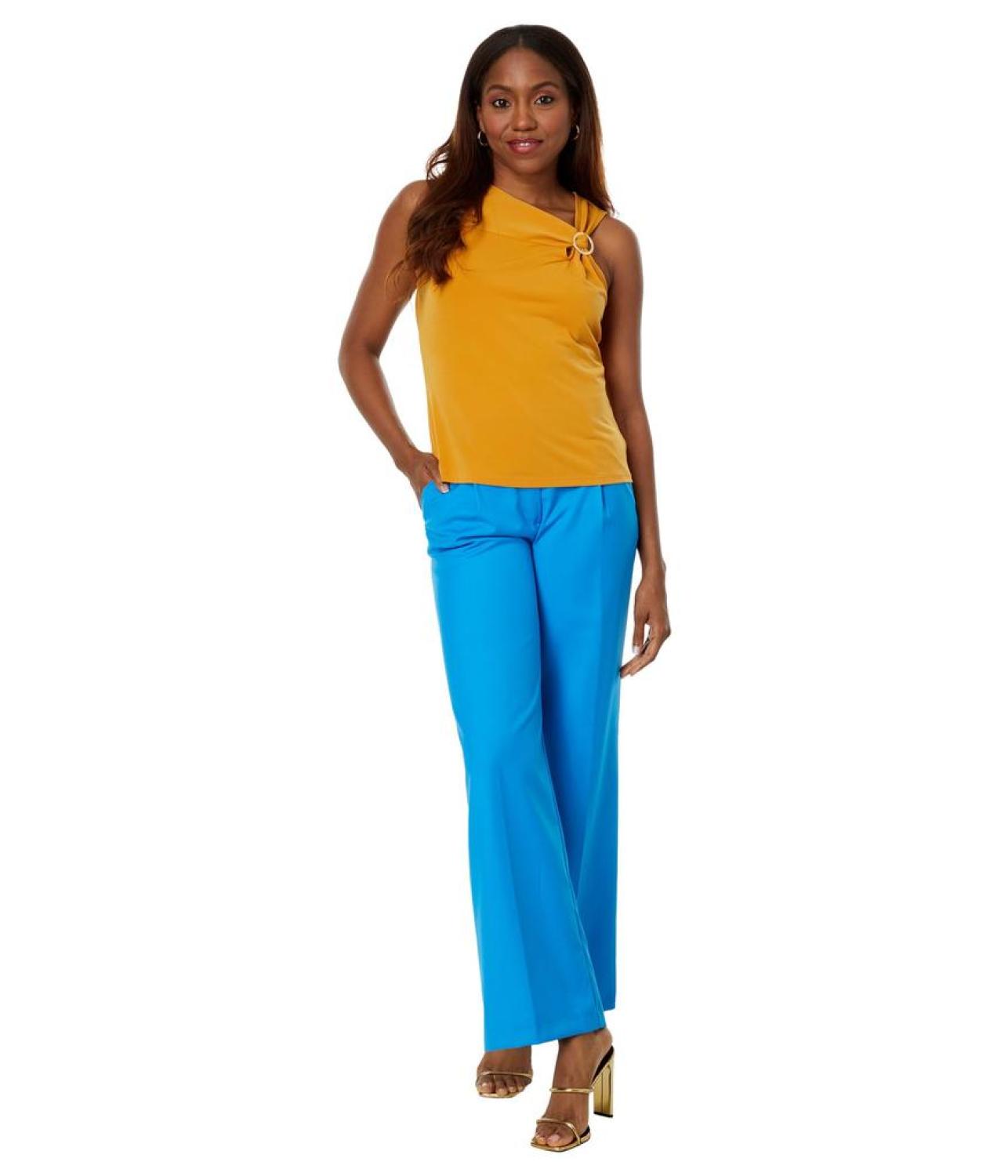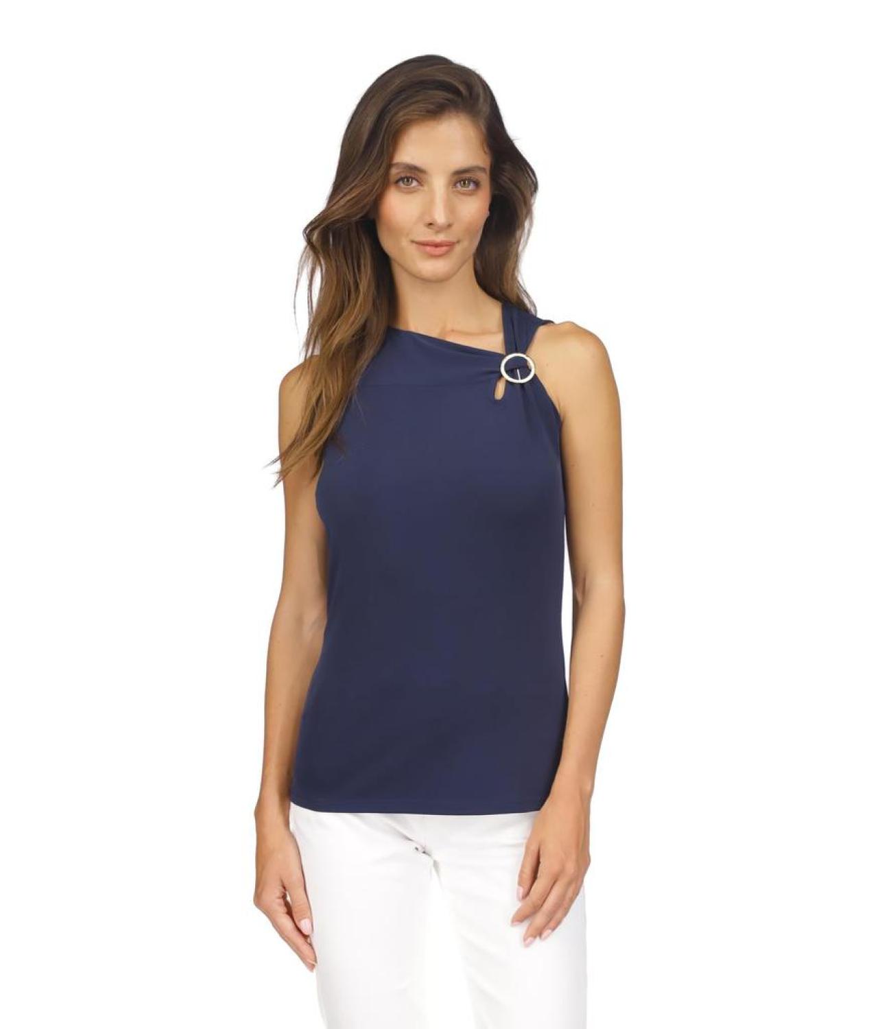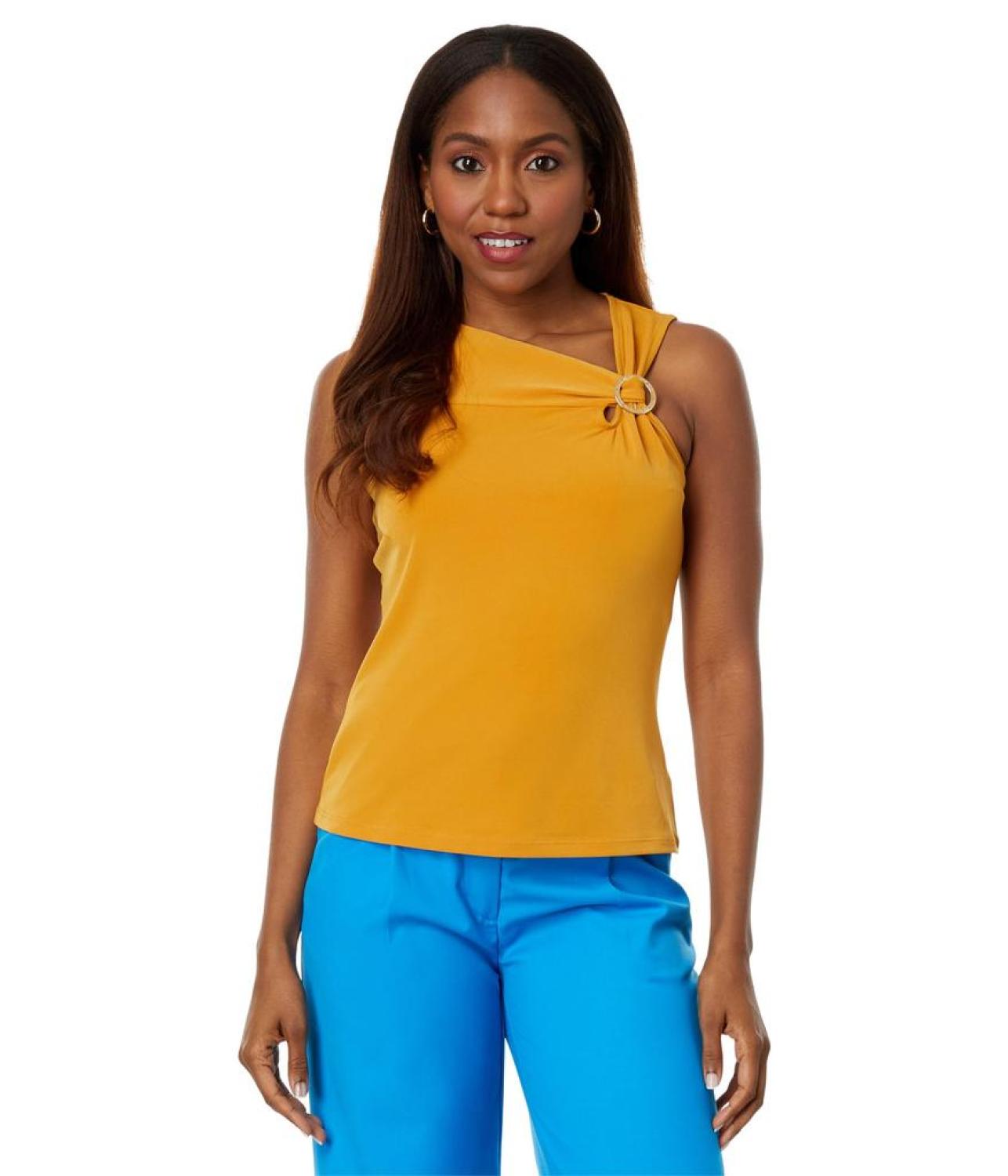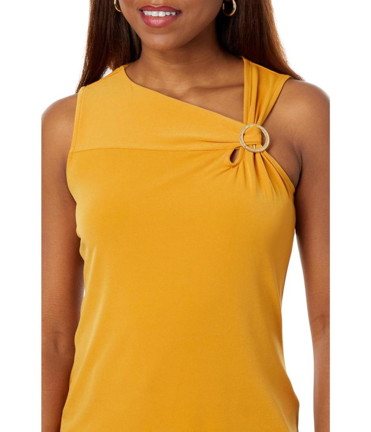 Flaunt your absolute fashion-forward look wearing MICHAEL Michael Kors® O-Ring Tank. This tank top comes with a straight hemline, an asymmetrical neckline, and pull-on construction. The sleeveless construction with buckle detailing on the left side gives it an alluring touch. 95% polyester, 5% elastane. Machine washable. Imported.